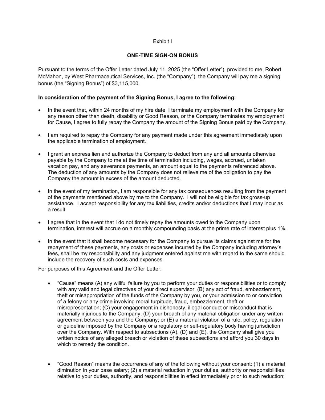 Exhibit I ONE-TIME SIGN-ON BONUS Pursuant to the terms of the Offer Letter dated July 11, 2025 (the “Offer Letter”), provided to me, Robert McMahon, by West Pharmaceutical Services, Inc. (the “Company”), the Company will pay me a signing bonus (the “Signing Bonus”) of $3,115,000. In consideration of the payment of the Signing Bonus, I agree to the following: • In the event that, within 24 months of my hire date, I terminate my employment with the Company for any reason other than death, disability or Good Reason, or the Company terminates my employment for Cause, I agree to fully repay the Company the amount of the Signing Bonus paid by the Company. • I am required to repay the Company for any payment made under this agreement immediately upon the applicable termination of employment. • I grant an express lien and authorize the Company to deduct from any and all amounts otherwise payable by the Company to me at the time of termination including, wages, accrued, untaken vacation pay, and any severance payments, an amount equal to the payments referenced above. The deduction of any amounts by the Company does not relieve me of the obligation to pay the Company the amount in excess of the amount deducted. • In the event of my termination, I am responsible for any tax consequences resulting from the payment of the payments mentioned above by me to the Company. I will not be eligible for tax gross-up assistance. I accept responsibility for any tax liabilities, credits and/or deductions that I may incur as a result. • I agree that in the event that I do not timely repay the amounts owed to the Company upon termination, interest will accrue on a monthly compounding basis at the prime rate of interest plus 1%. • In the event that it shall become necessary for the Company to pursue its claims against me for the repayment of these payments, any costs or expenses incurred by the Company including attorney’s fees, shall be my responsibility and any judgment entered against me with regard to the same should include the recovery of such costs and expenses. For purposes of this Agreement and the Offer Letter: • “Cause” means (A) any willful failure by you to perform your duties or responsibilities or to comply with any valid and legal directives of your direct supervisor; (B) any act of fraud, embezzlement, theft or misappropriation of the funds of the Company by you, or your admission to or conviction of a felony or any crime involving moral turpitude, fraud, embezzlement, theft or misrepresentation; (C) your engagement in dishonesty, illegal conduct or misconduct that is materially injurious to the Company; (D) your breach of any material obligation under any written agreement between you and the Company; or (E) a material violation of a rule, policy, regulation or guideline imposed by the Company or a regulatory or self-regulatory body having jurisdiction over the Company. With respect to subsections (A), (D) and (E), the Company shall give you written notice of any alleged breach or violation of these subsections and afford you 30 days in which to remedy the condition. • “Good Reason” means the occurrence of any of the following without your consent: (1) a material diminution in your base salary; (2) a material reduction in your duties, authority or responsibilities relative to your duties, authority, and responsibilities in effect immediately prior to such reduction;