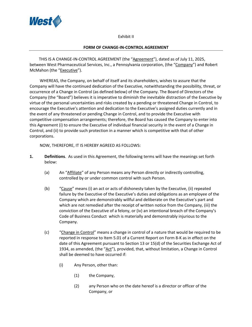 Exhibit II FORM OF CHANGE-IN-CONTROL AGREEMENT THIS IS A CHANGE-IN-CONTROL AGREEMENT (the “Agreement”), dated as of July 11, 2025, between West Pharmaceutical Services, Inc., a Pennsylvania corporation, (the “Company”) and Robert McMahon (the “Executive”). WHEREAS, the Company, on behalf of itself and its shareholders, wishes to assure that the Company will have the continued dedication of the Executive, notwithstanding the possibility, threat, or occurrence of a Change in Control (as defined below) of the Company. The Board of Directors of the Company (the “Board”) believes it is imperative to diminish the inevitable distraction of the Executive by virtue of the personal uncertainties and risks created by a pending or threatened Change in Control, to encourage the Executive’s attention and dedication to the Executive’s assigned duties currently and in the event of any threatened or pending Change in Control, and to provide the Executive with competitive compensation arrangements; therefore, the Board has caused the Company to enter into this Agreement (i) to ensure the Executive of individual financial security in the event of a Change in Control, and (ii) to provide such protection in a manner which is competitive with that of other corporations. NOW, THEREFORE, IT IS HEREBY AGREED AS FOLLOWS: 1. Definitions. As used in this Agreement, the following terms will have the meanings set forth below: (a) An “Affiliate” of any Person means any Person directly or indirectly controlling, controlled by or under common control with such Person. (b) “Cause” means (i) an act or acts of dishonesty taken by the Executive, (ii) repeated failure by the Executive of the Executive’s duties and obligations as an employee of the Company which are demonstrably willful and deliberate on the Executive’s part and which are not remedied after the receipt of written notice from the Company, (iii) the conviction of the Executive of a felony, or (iv) an intentional breach of the Company’s Code of Business Conduct which is materially and demonstrably injurious to the Company. (c) “Change in Control” means a change in control of a nature that would be required to be reported in response to Item 5.01 of a Current Report on Form 8-K as in effect on the date of this Agreement pursuant to Section 13 or 15(d) of the Securities Exchange Act of 1934, as amended, (the “Act”), provided, that, without limitation, a Change in Control shall be deemed to have occurred if: (i) Any Person, other than: (1) the Company, (2) any Person who on the date hereof is a director or officer of the Company, or
