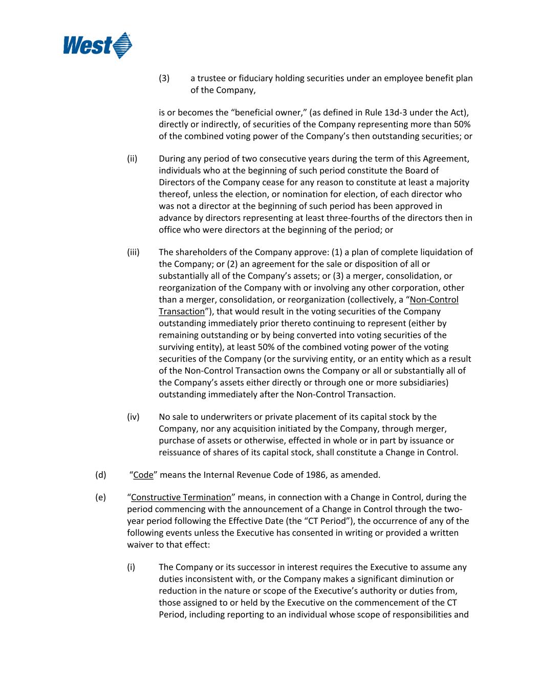 (3) a trustee or fiduciary holding securities under an employee benefit plan of the Company, is or becomes the “beneficial owner,” (as defined in Rule 13d-3 under the Act), directly or indirectly, of securities of the Company representing more than 50% of the combined voting power of the Company’s then outstanding securities; or (ii) During any period of two consecutive years during the term of this Agreement, individuals who at the beginning of such period constitute the Board of Directors of the Company cease for any reason to constitute at least a majority thereof, unless the election, or nomination for election, of each director who was not a director at the beginning of such period has been approved in advance by directors representing at least three-fourths of the directors then in office who were directors at the beginning of the period; or (iii) The shareholders of the Company approve: (1) a plan of complete liquidation of the Company; or (2) an agreement for the sale or disposition of all or substantially all of the Company’s assets; or (3) a merger, consolidation, or reorganization of the Company with or involving any other corporation, other than a merger, consolidation, or reorganization (collectively, a “Non-Control Transaction”), that would result in the voting securities of the Company outstanding immediately prior thereto continuing to represent (either by remaining outstanding or by being converted into voting securities of the surviving entity), at least 50% of the combined voting power of the voting securities of the Company (or the surviving entity, or an entity which as a result of the Non-Control Transaction owns the Company or all or substantially all of the Company’s assets either directly or through one or more subsidiaries) outstanding immediately after the Non-Control Transaction. (iv) No sale to underwriters or private placement of its capital stock by the Company, nor any acquisition initiated by the Company, through merger, purchase of assets or otherwise, effected in whole or in part by issuance or reissuance of shares of its capital stock, shall constitute a Change in Control. (d) “Code” means the Internal Revenue Code of 1986, as amended. (e) “Constructive Termination” means, in connection with a Change in Control, during the period commencing with the announcement of a Change in Control through the two- year period following the Effective Date (the “CT Period”), the occurrence of any of the following events unless the Executive has consented in writing or provided a written waiver to that effect: (i) The Company or its successor in interest requires the Executive to assume any duties inconsistent with, or the Company makes a significant diminution or reduction in the nature or scope of the Executive’s authority or duties from, those assigned to or held by the Executive on the commencement of the CT Period, including reporting to an individual whose scope of responsibilities and