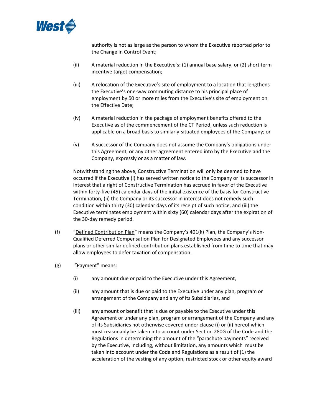 authority is not as large as the person to whom the Executive reported prior to the Change in Control Event; (ii) A material reduction in the Executive’s: (1) annual base salary, or (2) short term incentive target compensation; (iii) A relocation of the Executive’s site of employment to a location that lengthens the Executive’s one-way commuting distance to his principal place of employment by 50 or more miles from the Executive’s site of employment on the Effective Date; (iv) A material reduction in the package of employment benefits offered to the Executive as of the commencement of the CT Period, unless such reduction is applicable on a broad basis to similarly-situated employees of the Company; or (v) A successor of the Company does not assume the Company’s obligations under this Agreement, or any other agreement entered into by the Executive and the Company, expressly or as a matter of law. Notwithstanding the above, Constructive Termination will only be deemed to have occurred if the Executive (i) has served written notice to the Company or its successor in interest that a right of Constructive Termination has accrued in favor of the Executive within forty-five (45) calendar days of the initial existence of the basis for Constructive Termination, (ii) the Company or its successor in interest does not remedy such condition within thirty (30) calendar days of its receipt of such notice, and (iii) the Executive terminates employment within sixty (60) calendar days after the expiration of the 30-day remedy period. (f) “Defined Contribution Plan” means the Company’s 401(k) Plan, the Company’s Non- Qualified Deferred Compensation Plan for Designated Employees and any successor plans or other similar defined contribution plans established from time to time that may allow employees to defer taxation of compensation. (g) “Payment” means: (i) any amount due or paid to the Executive under this Agreement, (ii) any amount that is due or paid to the Executive under any plan, program or arrangement of the Company and any of its Subsidiaries, and (iii) any amount or benefit that is due or payable to the Executive under this Agreement or under any plan, program or arrangement of the Company and any of its Subsidiaries not otherwise covered under clause (i) or (ii) hereof which must reasonably be taken into account under Section 280G of the Code and the Regulations in determining the amount of the “parachute payments” received by the Executive, including, without limitation, any amounts which must be taken into account under the Code and Regulations as a result of (1) the acceleration of the vesting of any option, restricted stock or other equity award