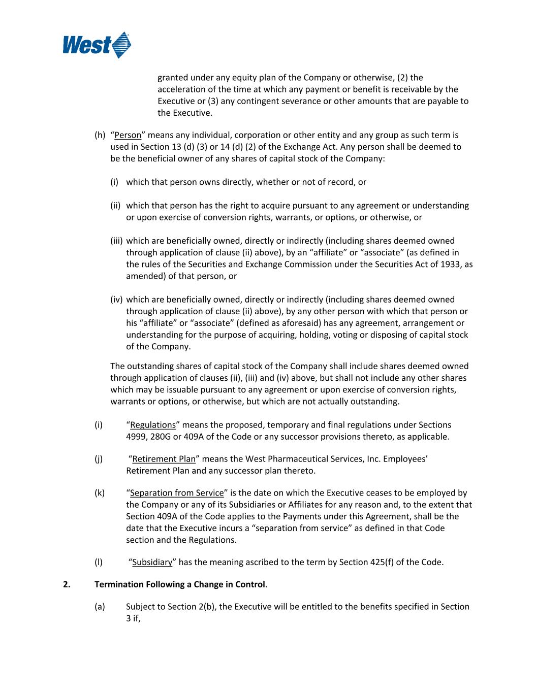 granted under any equity plan of the Company or otherwise, (2) the acceleration of the time at which any payment or benefit is receivable by the Executive or (3) any contingent severance or other amounts that are payable to the Executive. (h) “Person” means any individual, corporation or other entity and any group as such term is used in Section 13 (d) (3) or 14 (d) (2) of the Exchange Act. Any person shall be deemed to be the beneficial owner of any shares of capital stock of the Company: (i) which that person owns directly, whether or not of record, or (ii) which that person has the right to acquire pursuant to any agreement or understanding or upon exercise of conversion rights, warrants, or options, or otherwise, or (iii) which are beneficially owned, directly or indirectly (including shares deemed owned through application of clause (ii) above), by an “affiliate” or “associate” (as defined in the rules of the Securities and Exchange Commission under the Securities Act of 1933, as amended) of that person, or (iv) which are beneficially owned, directly or indirectly (including shares deemed owned through application of clause (ii) above), by any other person with which that person or his “affiliate” or “associate” (defined as aforesaid) has any agreement, arrangement or understanding for the purpose of acquiring, holding, voting or disposing of capital stock of the Company. The outstanding shares of capital stock of the Company shall include shares deemed owned through application of clauses (ii), (iii) and (iv) above, but shall not include any other shares which may be issuable pursuant to any agreement or upon exercise of conversion rights, warrants or options, or otherwise, but which are not actually outstanding. (i) “Regulations” means the proposed, temporary and final regulations under Sections 4999, 280G or 409A of the Code or any successor provisions thereto, as applicable. (j) “Retirement Plan” means the West Pharmaceutical Services, Inc. Employees’ Retirement Plan and any successor plan thereto. (k) “Separation from Service” is the date on which the Executive ceases to be employed by the Company or any of its Subsidiaries or Affiliates for any reason and, to the extent that Section 409A of the Code applies to the Payments under this Agreement, shall be the date that the Executive incurs a “separation from service” as defined in that Code section and the Regulations. (l) “Subsidiary” has the meaning ascribed to the term by Section 425(f) of the Code. 2. Termination Following a Change in Control. (a) Subject to Section 2(b), the Executive will be entitled to the benefits specified in Section 3 if,