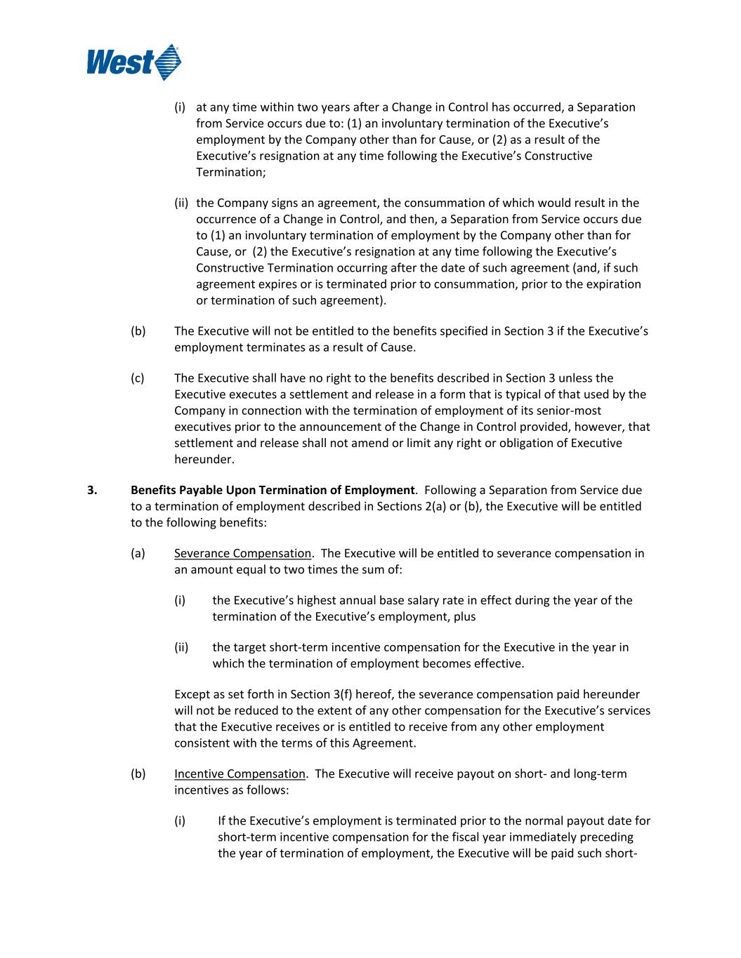 (i) at any time within two years after a Change in Control has occurred, a Separation from Service occurs due to: (1) an involuntary termination of the Executive’s employment by the Company other than for Cause, or (2) as a result of the Executive’s resignation at any time following the Executive’s Constructive Termination; (ii) the Company signs an agreement, the consummation of which would result in the occurrence of a Change in Control, and then, a Separation from Service occurs due to (1) an involuntary termination of employment by the Company other than for Cause, or (2) the Executive’s resignation at any time following the Executive’s Constructive Termination occurring after the date of such agreement (and, if such agreement expires or is terminated prior to consummation, prior to the expiration or termination of such agreement). (b) The Executive will not be entitled to the benefits specified in Section 3 if the Executive’s employment terminates as a result of Cause. (c) The Executive shall have no right to the benefits described in Section 3 unless the Executive executes a settlement and release in a form that is typical of that used by the Company in connection with the termination of employment of its senior-most executives prior to the announcement of the Change in Control provided, however, that settlement and release shall not amend or limit any right or obligation of Executive hereunder. 3. Benefits Payable Upon Termination of Employment. Following a Separation from Service due to a termination of employment described in Sections 2(a) or (b), the Executive will be entitled to the following benefits: (a) Severance Compensation. The Executive will be entitled to severance compensation in an amount equal to two times the sum of: (i) the Executive’s highest annual base salary rate in effect during the year of the termination of the Executive’s employment, plus (ii) the target short-term incentive compensation for the Executive in the year in which the termination of employment becomes effective. Except as set forth in Section 3(f) hereof, the severance compensation paid hereunder will not be reduced to the extent of any other compensation for the Executive’s services that the Executive receives or is entitled to receive from any other employment consistent with the terms of this Agreement. (b) Incentive Compensation. The Executive will receive payout on short- and long-term incentives as follows: (i) If the Executive’s employment is terminated prior to the normal payout date for short-term incentive compensation for the fiscal year immediately preceding the year of termination of employment, the Executive will be paid such short-