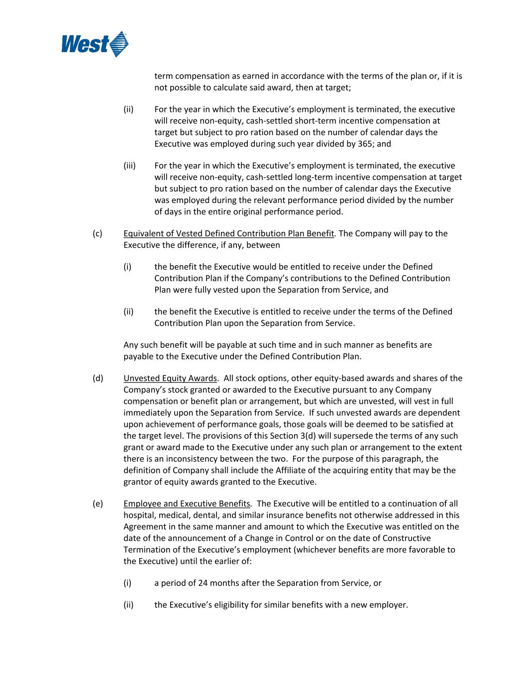 term compensation as earned in accordance with the terms of the plan or, if it is not possible to calculate said award, then at target; (ii) For the year in which the Executive’s employment is terminated, the executive will receive non-equity, cash-settled short-term incentive compensation at target but subject to pro ration based on the number of calendar days the Executive was employed during such year divided by 365; and (iii) For the year in which the Executive’s employment is terminated, the executive will receive non-equity, cash-settled long-term incentive compensation at target but subject to pro ration based on the number of calendar days the Executive was employed during the relevant performance period divided by the number of days in the entire original performance period. (c) Equivalent of Vested Defined Contribution Plan Benefit. The Company will pay to the Executive the difference, if any, between (i) the benefit the Executive would be entitled to receive under the Defined Contribution Plan if the Company’s contributions to the Defined Contribution Plan were fully vested upon the Separation from Service, and (ii) the benefit the Executive is entitled to receive under the terms of the Defined Contribution Plan upon the Separation from Service. Any such benefit will be payable at such time and in such manner as benefits are payable to the Executive under the Defined Contribution Plan. (d) Unvested Equity Awards. All stock options, other equity-based awards and shares of the Company’s stock granted or awarded to the Executive pursuant to any Company compensation or benefit plan or arrangement, but which are unvested, will vest in full immediately upon the Separation from Service. If such unvested awards are dependent upon achievement of performance goals, those goals will be deemed to be satisfied at the target level. The provisions of this Section 3(d) will supersede the terms of any such grant or award made to the Executive under any such plan or arrangement to the extent there is an inconsistency between the two. For the purpose of this paragraph, the definition of Company shall include the Affiliate of the acquiring entity that may be the grantor of equity awards granted to the Executive. (e) Employee and Executive Benefits. The Executive will be entitled to a continuation of all hospital, medical, dental, and similar insurance benefits not otherwise addressed in this Agreement in the same manner and amount to which the Executive was entitled on the date of the announcement of a Change in Control or on the date of Constructive Termination of the Executive’s employment (whichever benefits are more favorable to the Executive) until the earlier of: (i) a period of 24 months after the Separation from Service, or (ii) the Executive’s eligibility for similar benefits with a new employer.