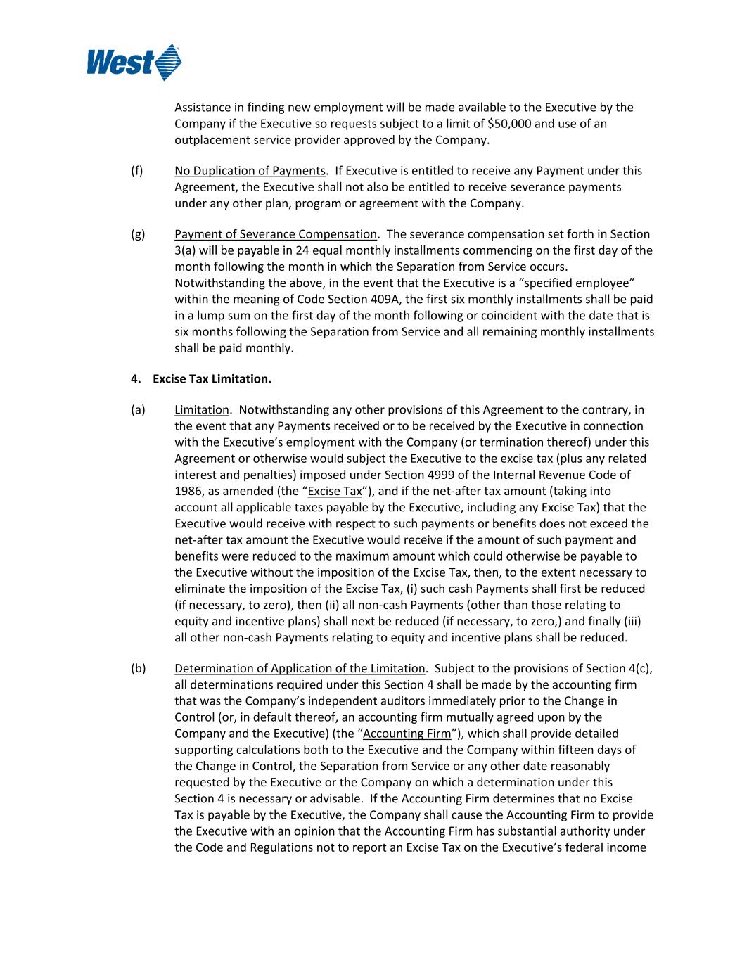 Assistance in finding new employment will be made available to the Executive by the Company if the Executive so requests subject to a limit of $50,000 and use of an outplacement service provider approved by the Company. (f) No Duplication of Payments. If Executive is entitled to receive any Payment under this Agreement, the Executive shall not also be entitled to receive severance payments under any other plan, program or agreement with the Company. (g) Payment of Severance Compensation. The severance compensation set forth in Section 3(a) will be payable in 24 equal monthly installments commencing on the first day of the month following the month in which the Separation from Service occurs. Notwithstanding the above, in the event that the Executive is a “specified employee” within the meaning of Code Section 409A, the first six monthly installments shall be paid in a lump sum on the first day of the month following or coincident with the date that is six months following the Separation from Service and all remaining monthly installments shall be paid monthly. 4. Excise Tax Limitation. (a) Limitation. Notwithstanding any other provisions of this Agreement to the contrary, in the event that any Payments received or to be received by the Executive in connection with the Executive’s employment with the Company (or termination thereof) under this Agreement or otherwise would subject the Executive to the excise tax (plus any related interest and penalties) imposed under Section 4999 of the Internal Revenue Code of 1986, as amended (the “Excise Tax”), and if the net-after tax amount (taking into account all applicable taxes payable by the Executive, including any Excise Tax) that the Executive would receive with respect to such payments or benefits does not exceed the net-after tax amount the Executive would receive if the amount of such payment and benefits were reduced to the maximum amount which could otherwise be payable to the Executive without the imposition of the Excise Tax, then, to the extent necessary to eliminate the imposition of the Excise Tax, (i) such cash Payments shall first be reduced (if necessary, to zero), then (ii) all non-cash Payments (other than those relating to equity and incentive plans) shall next be reduced (if necessary, to zero,) and finally (iii) all other non-cash Payments relating to equity and incentive plans shall be reduced. (b) Determination of Application of the Limitation. Subject to the provisions of Section 4(c), all determinations required under this Section 4 shall be made by the accounting firm that was the Company’s independent auditors immediately prior to the Change in Control (or, in default thereof, an accounting firm mutually agreed upon by the Company and the Executive) (the “Accounting Firm”), which shall provide detailed supporting calculations both to the Executive and the Company within fifteen days of the Change in Control, the Separation from Service or any other date reasonably requested by the Executive or the Company on which a determination under this Section 4 is necessary or advisable. If the Accounting Firm determines that no Excise Tax is payable by the Executive, the Company shall cause the Accounting Firm to provide the Executive with an opinion that the Accounting Firm has substantial authority under the Code and Regulations not to report an Excise Tax on the Executive’s federal income