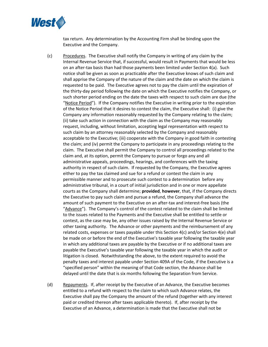 tax return. Any determination by the Accounting Firm shall be binding upon the Executive and the Company. (c) Procedures. The Executive shall notify the Company in writing of any claim by the Internal Revenue Service that, if successful, would result in Payments that would be less on an after-tax basis than had those payments been limited under Section 4(a). Such notice shall be given as soon as practicable after the Executive knows of such claim and shall apprise the Company of the nature of the claim and the date on which the claim is requested to be paid. The Executive agrees not to pay the claim until the expiration of the thirty-day period following the date on which the Executive notifies the Company, or such shorter period ending on the date the taxes with respect to such claim are due (the “Notice Period”). If the Company notifies the Executive in writing prior to the expiration of the Notice Period that it desires to contest the claim, the Executive shall: (i) give the Company any information reasonably requested by the Company relating to the claim; (ii) take such action in connection with the claim as the Company may reasonably request, including, without limitation, accepting legal representation with respect to such claim by an attorney reasonably selected by the Company and reasonably acceptable to the Executive; (iii) cooperate with the Company in good faith in contesting the claim; and (iv) permit the Company to participate in any proceedings relating to the claim. The Executive shall permit the Company to control all proceedings related to the claim and, at its option, permit the Company to pursue or forgo any and all administrative appeals, proceedings, hearings, and conferences with the taxing authority in respect of such claim. If requested by the Company, the Executive agrees either to pay the tax claimed and sue for a refund or contest the claim in any permissible manner and to prosecute such contest to a determination before any administrative tribunal, in a court of initial jurisdiction and in one or more appellate courts as the Company shall determine; provided, however, that, if the Company directs the Executive to pay such claim and pursue a refund, the Company shall advance the amount of such payment to the Executive on an after-tax and interest-free basis (the “Advance”). The Company’s control of the contest related to the claim shall be limited to the issues related to the Payments and the Executive shall be entitled to settle or contest, as the case may be, any other issues raised by the Internal Revenue Service or other taxing authority. The Advance or other payments and the reimbursement of any related costs, expenses or taxes payable under this Section 4(c) and/or Section 4(e) shall be made on or before the end of the Executive’s taxable year following the taxable year in which any additional taxes are payable by the Executive or if no additional taxes are payable the Executive’s taxable year following the taxable year in which the audit or litigation is closed. Notwithstanding the above, to the extent required to avoid the penalty taxes and interest payable under Section 409A of the Code, if the Executive is a “specified person” within the meaning of that Code section, the Advance shall be delayed until the date that is six months following the Separation from Service. (d) Repayments. If, after receipt by the Executive of an Advance, the Executive becomes entitled to a refund with respect to the claim to which such Advance relates, the Executive shall pay the Company the amount of the refund (together with any interest paid or credited thereon after taxes applicable thereto). If, after receipt by the Executive of an Advance, a determination is made that the Executive shall not be