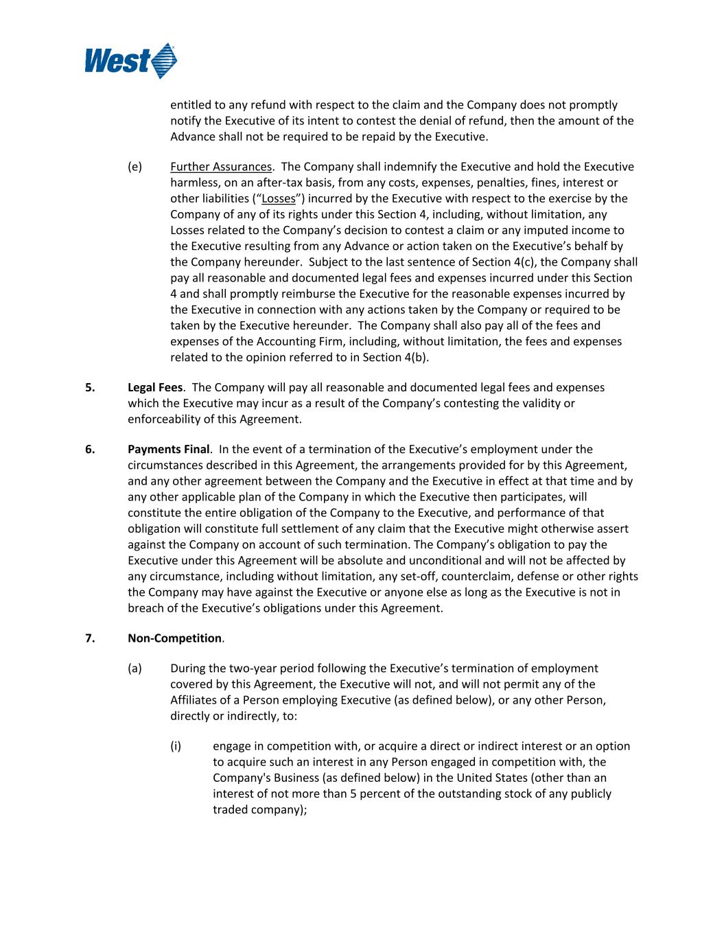 entitled to any refund with respect to the claim and the Company does not promptly notify the Executive of its intent to contest the denial of refund, then the amount of the Advance shall not be required to be repaid by the Executive. (e) Further Assurances. The Company shall indemnify the Executive and hold the Executive harmless, on an after-tax basis, from any costs, expenses, penalties, fines, interest or other liabilities (“Losses”) incurred by the Executive with respect to the exercise by the Company of any of its rights under this Section 4, including, without limitation, any Losses related to the Company’s decision to contest a claim or any imputed income to the Executive resulting from any Advance or action taken on the Executive’s behalf by the Company hereunder. Subject to the last sentence of Section 4(c), the Company shall pay all reasonable and documented legal fees and expenses incurred under this Section 4 and shall promptly reimburse the Executive for the reasonable expenses incurred by the Executive in connection with any actions taken by the Company or required to be taken by the Executive hereunder. The Company shall also pay all of the fees and expenses of the Accounting Firm, including, without limitation, the fees and expenses related to the opinion referred to in Section 4(b). 5. Legal Fees. The Company will pay all reasonable and documented legal fees and expenses which the Executive may incur as a result of the Company’s contesting the validity or enforceability of this Agreement. 6. Payments Final. In the event of a termination of the Executive’s employment under the circumstances described in this Agreement, the arrangements provided for by this Agreement, and any other agreement between the Company and the Executive in effect at that time and by any other applicable plan of the Company in which the Executive then participates, will constitute the entire obligation of the Company to the Executive, and performance of that obligation will constitute full settlement of any claim that the Executive might otherwise assert against the Company on account of such termination. The Company’s obligation to pay the Executive under this Agreement will be absolute and unconditional and will not be affected by any circumstance, including without limitation, any set-off, counterclaim, defense or other rights the Company may have against the Executive or anyone else as long as the Executive is not in breach of the Executive’s obligations under this Agreement. 7. Non-Competition. (a) During the two-year period following the Executive’s termination of employment covered by this Agreement, the Executive will not, and will not permit any of the Affiliates of a Person employing Executive (as defined below), or any other Person, directly or indirectly, to: (i) engage in competition with, or acquire a direct or indirect interest or an option to acquire such an interest in any Person engaged in competition with, the Company's Business (as defined below) in the United States (other than an interest of not more than 5 percent of the outstanding stock of any publicly traded company);