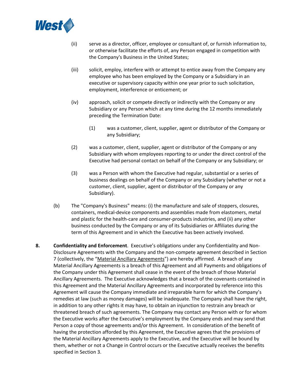 (ii) serve as a director, officer, employee or consultant of, or furnish information to, or otherwise facilitate the efforts of, any Person engaged in competition with the Company's Business in the United States; (iii) solicit, employ, interfere with or attempt to entice away from the Company any employee who has been employed by the Company or a Subsidiary in an executive or supervisory capacity within one year prior to such solicitation, employment, interference or enticement; or (iv) approach, solicit or compete directly or indirectly with the Company or any Subsidiary or any Person which at any time during the 12 months immediately preceding the Termination Date: (1) was a customer, client, supplier, agent or distributor of the Company or any Subsidiary; (2) was a customer, client, supplier, agent or distributor of the Company or any Subsidiary with whom employees reporting to or under the direct control of the Executive had personal contact on behalf of the Company or any Subsidiary; or (3) was a Person with whom the Executive had regular, substantial or a series of business dealings on behalf of the Company or any Subsidiary (whether or not a customer, client, supplier, agent or distributor of the Company or any Subsidiary). (b) The "Company's Business" means: (i) the manufacture and sale of stoppers, closures, containers, medical-device components and assemblies made from elastomers, metal and plastic for the health-care and consumer-products industries, and (ii) any other business conducted by the Company or any of its Subsidiaries or Affiliates during the term of this Agreement and in which the Executive has been actively involved. 8. Confidentiality and Enforcement. Executive’s obligations under any Confidentiality and Non- Disclosure Agreements with the Company and the non-compete agreement described in Section 7 (collectively, the “Material Ancillary Agreements”) are hereby affirmed. A breach of any Material Ancillary Agreements is a breach of this Agreement and all Payments and obligations of the Company under this Agreement shall cease in the event of the breach of those Material Ancillary Agreements. The Executive acknowledges that a breach of the covenants contained in this Agreement and the Material Ancillary Agreements and incorporated by reference into this Agreement will cause the Company immediate and irreparable harm for which the Company’s remedies at law (such as money damages) will be inadequate. The Company shall have the right, in addition to any other rights it may have, to obtain an injunction to restrain any breach or threatened breach of such agreements. The Company may contact any Person with or for whom the Executive works after the Executive’s employment by the Company ends and may send that Person a copy of those agreements and/or this Agreement. In consideration of the benefit of having the protection afforded by this Agreement, the Executive agrees that the provisions of the Material Ancillary Agreements apply to the Executive, and the Executive will be bound by them, whether or not a Change in Control occurs or the Executive actually receives the benefits specified in Section 3.