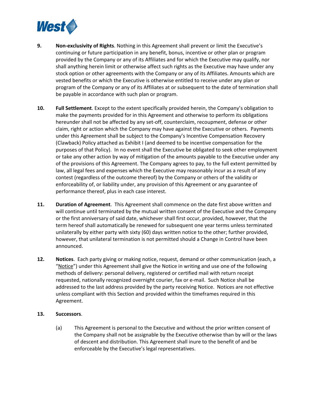 9. Non-exclusivity of Rights. Nothing in this Agreement shall prevent or limit the Executive’s continuing or future participation in any benefit, bonus, incentive or other plan or program provided by the Company or any of its Affiliates and for which the Executive may qualify, nor shall anything herein limit or otherwise affect such rights as the Executive may have under any stock option or other agreements with the Company or any of its Affiliates. Amounts which are vested benefits or which the Executive is otherwise entitled to receive under any plan or program of the Company or any of its Affiliates at or subsequent to the date of termination shall be payable in accordance with such plan or program. 10. Full Settlement. Except to the extent specifically provided herein, the Company’s obligation to make the payments provided for in this Agreement and otherwise to perform its obligations hereunder shall not be affected by any set-off, counterclaim, recoupment, defense or other claim, right or action which the Company may have against the Executive or others. Payments under this Agreement shall be subject to the Company’s Incentive Compensation Recovery (Clawback) Policy attached as Exhibit I (and deemed to be incentive compensation for the purposes of that Policy). In no event shall the Executive be obligated to seek other employment or take any other action by way of mitigation of the amounts payable to the Executive under any of the provisions of this Agreement. The Company agrees to pay, to the full extent permitted by law, all legal fees and expenses which the Executive may reasonably incur as a result of any contest (regardless of the outcome thereof) by the Company or others of the validity or enforceability of, or liability under, any provision of this Agreement or any guarantee of performance thereof, plus in each case interest. 11. Duration of Agreement. This Agreement shall commence on the date first above written and will continue until terminated by the mutual written consent of the Executive and the Company or the first anniversary of said date, whichever shall first occur, provided, however, that the term hereof shall automatically be renewed for subsequent one year terms unless terminated unilaterally by either party with sixty (60) days written notice to the other; further provided, however, that unilateral termination is not permitted should a Change in Control have been announced. 12. Notices. Each party giving or making notice, request, demand or other communication (each, a “Notice”) under this Agreement shall give the Notice in writing and use one of the following methods of delivery: personal delivery, registered or certified mail with return receipt requested, nationally recognized overnight courier, fax or e-mail. Such Notice shall be addressed to the last address provided by the party receiving Notice. Notices are not effective unless compliant with this Section and provided within the timeframes required in this Agreement. 13. Successors. (a) This Agreement is personal to the Executive and without the prior written consent of the Company shall not be assignable by the Executive otherwise than by will or the laws of descent and distribution. This Agreement shall inure to the benefit of and be enforceable by the Executive’s legal representatives.