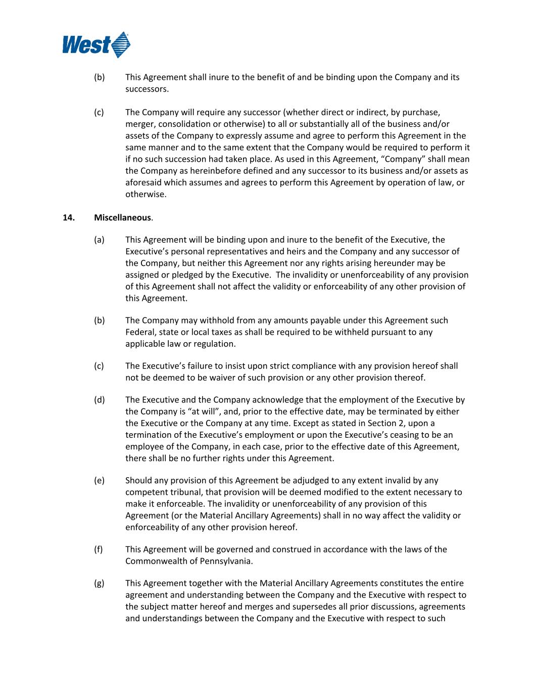 (b) This Agreement shall inure to the benefit of and be binding upon the Company and its successors. (c) The Company will require any successor (whether direct or indirect, by purchase, merger, consolidation or otherwise) to all or substantially all of the business and/or assets of the Company to expressly assume and agree to perform this Agreement in the same manner and to the same extent that the Company would be required to perform it if no such succession had taken place. As used in this Agreement, “Company” shall mean the Company as hereinbefore defined and any successor to its business and/or assets as aforesaid which assumes and agrees to perform this Agreement by operation of law, or otherwise. 14. Miscellaneous. (a) This Agreement will be binding upon and inure to the benefit of the Executive, the Executive’s personal representatives and heirs and the Company and any successor of the Company, but neither this Agreement nor any rights arising hereunder may be assigned or pledged by the Executive. The invalidity or unenforceability of any provision of this Agreement shall not affect the validity or enforceability of any other provision of this Agreement. (b) The Company may withhold from any amounts payable under this Agreement such Federal, state or local taxes as shall be required to be withheld pursuant to any applicable law or regulation. (c) The Executive’s failure to insist upon strict compliance with any provision hereof shall not be deemed to be waiver of such provision or any other provision thereof. (d) The Executive and the Company acknowledge that the employment of the Executive by the Company is “at will”, and, prior to the effective date, may be terminated by either the Executive or the Company at any time. Except as stated in Section 2, upon a termination of the Executive’s employment or upon the Executive’s ceasing to be an employee of the Company, in each case, prior to the effective date of this Agreement, there shall be no further rights under this Agreement. (e) Should any provision of this Agreement be adjudged to any extent invalid by any competent tribunal, that provision will be deemed modified to the extent necessary to make it enforceable. The invalidity or unenforceability of any provision of this Agreement (or the Material Ancillary Agreements) shall in no way affect the validity or enforceability of any other provision hereof. (f) This Agreement will be governed and construed in accordance with the laws of the Commonwealth of Pennsylvania. (g) This Agreement together with the Material Ancillary Agreements constitutes the entire agreement and understanding between the Company and the Executive with respect to the subject matter hereof and merges and supersedes all prior discussions, agreements and understandings between the Company and the Executive with respect to such