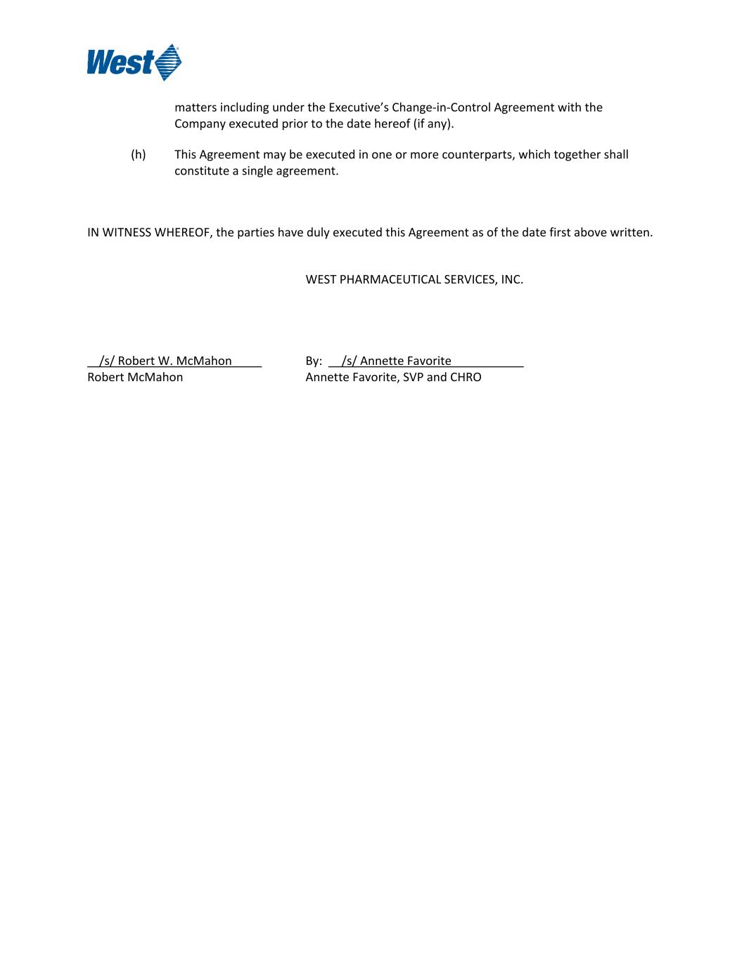 matters including under the Executive’s Change-in-Control Agreement with the Company executed prior to the date hereof (if any). (h) This Agreement may be executed in one or more counterparts, which together shall constitute a single agreement. IN WITNESS WHEREOF, the parties have duly executed this Agreement as of the date first above written. WEST PHARMACEUTICAL SERVICES, INC. /s/ Robert W. McMahon By: __/s/ Annette Favorite Robert McMahon Annette Favorite, SVP and CHRO
