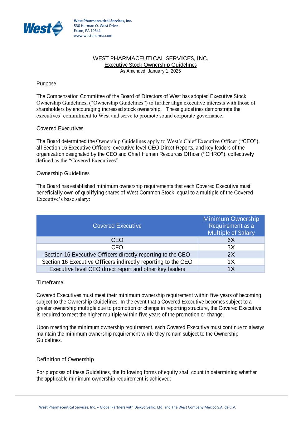 West Pharmaceutical Services, Inc. 530 Herman O. West Drive Exton, PA 19341 www.westpharma.com West Pharmaceutical Services, Inc. • Global Partners with Daikyo Seiko. Ltd. and The West Company Mexico S.A. de C.V. WEST PHARMACEUTICAL SERVICES, INC. Executive Stock Ownership Guidelines As Amended, January 1, 2025 Purpose The Compensation Committee of the Board of Directors of West has adopted Executive Stock Ownership Guidelines, (“Ownership Guidelines”) to further align executive interests with those of shareholders by encouraging increased stock ownership. These guidelines demonstrate the executives’ commitment to West and serve to promote sound corporate governance. Covered Executives The Board determined the Ownership Guidelines apply to West’s Chief Executive Officer (“CEO”), all Section 16 Executive Officers, executive level CEO Direct Reports, and key leaders of the organization designated by the CEO and Chief Human Resources Officer (“CHRO”), collectively defined as the “Covered Executives”. Ownership Guidelines The Board has established minimum ownership requirements that each Covered Executive must beneficially own of qualifying shares of West Common Stock, equal to a multiple of the Covered Executive’s base salary: Covered Executive Minimum Ownership Requirement as a Multiple of Salary CEO 6X CFO 3X Section 16 Executive Officers directly reporting to the CEO 2X Section 16 Executive Officers indirectly reporting to the CEO 1X Executive level CEO direct report and other key leaders 1X Timeframe Covered Executives must meet their minimum ownership requirement within five years of becoming subject to the Ownership Guidelines. In the event that a Covered Executive becomes subject to a greater ownership multiple due to promotion or change in reporting structure, the Covered Executive is required to meet the higher multiple within five years of the promotion or change. Upon meeting the minimum ownership requirement, each Covered Executive must continue to always maintain the minimum ownership requirement while they remain subject to the Ownership Guidelines. Definition of Ownership For purposes of these Guidelines, the following forms of equity shall count in determining whether the applicable minimum ownership requirement is achieved: