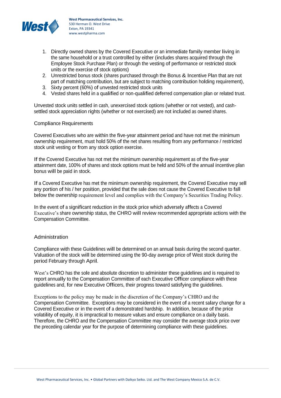 West Pharmaceutical Services, Inc. 530 Herman O. West Drive Exton, PA 19341 www.westpharma.com West Pharmaceutical Services, Inc. • Global Partners with Daikyo Seiko. Ltd. and The West Company Mexico S.A. de C.V. 1. Directly owned shares by the Covered Executive or an immediate family member living in the same household or a trust controlled by either (includes shares acquired through the Employee Stock Purchase Plan) or through the vesting of performance or restricted stock units or the exercise of stock options) 2. Unrestricted bonus stock (shares purchased through the Bonus & Incentive Plan that are not part of matching contribution, but are subject to matching contribution holding requirement), 3. Sixty percent (60%) of unvested restricted stock units 4. Vested shares held in a qualified or non-qualified deferred compensation plan or related trust. Unvested stock units settled in cash, unexercised stock options (whether or not vested), and cash- settled stock appreciation rights (whether or not exercised) are not included as owned shares. Compliance Requirements Covered Executives who are within the five-year attainment period and have not met the minimum ownership requirement, must hold 50% of the net shares resulting from any performance / restricted stock unit vesting or from any stock option exercise. If the Covered Executive has not met the minimum ownership requirement as of the five-year attainment date, 100% of shares and stock options must be held and 50% of the annual incentive plan bonus will be paid in stock. If a Covered Executive has met the minimum ownership requirement, the Covered Executive may sell any portion of his / her position, provided that the sale does not cause the Covered Executive to fall below the ownership requirement level and complies with the Company’s Securities Trading Policy. In the event of a significant reduction in the stock price which adversely affects a Covered Executive’s share ownership status, the CHRO will review recommended appropriate actions with the Compensation Committee. Administration Compliance with these Guidelines will be determined on an annual basis during the second quarter. Valuation of the stock will be determined using the 90-day average price of West stock during the period February through April. West’s CHRO has the sole and absolute discretion to administer these guidelines and is required to report annually to the Compensation Committee of each Executive Officer compliance with these guidelines and, for new Executive Officers, their progress toward satisfying the guidelines. Exceptions to the policy may be made in the discretion of the Company’s CHRO and the Compensation Committee. Exceptions may be considered in the event of a recent salary change for a Covered Executive or in the event of a demonstrated hardship. In addition, because of the price volatility of equity, it is impractical to measure values and ensure compliance on a daily basis. Therefore, the CHRO and the Compensation Committee may consider the average stock price over the preceding calendar year for the purpose of determining compliance with these guidelines.