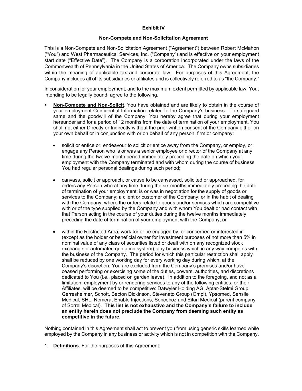 Exhibit IV Non-Compete and Non-Solicitation Agreement This is a Non-Compete and Non-Solicitation Agreement (“Agreement”) between Robert McMahon (“You”) and West Pharmaceutical Services, Inc. (“Company”) and is effective on your employment start date (“Effective Date”). The Company is a corporation incorporated under the laws of the Commonwealth of Pennsylvania in the United States of America. The Company owns subsidiaries within the meaning of applicable tax and corporate law. For purposes of this Agreement, the Company includes all of its subsidiaries or affiliates and is collectively referred to as “the Company.” In consideration for your employment, and to the maximum extent permitted by applicable law, You, intending to be legally bound, agree to the following.  Non-Compete and Non-Solicit. You have obtained and are likely to obtain in the course of your employment Confidential Information related to the Company’s business. To safeguard same and the goodwill of the Company, You hereby agree that during your employment hereunder and for a period of 12 months from the date of termination of your employment, You shall not either Directly or Indirectly without the prior written consent of the Company either on your own behalf or in conjunction with or on behalf of any person, firm or company: • solicit or entice or, endeavour to solicit or entice away from the Company, or employ, or engage any Person who is or was a senior employee or director of the Company at any time during the twelve-month period immediately preceding the date on which your employment with the Company terminated and with whom during the course of business You had regular personal dealings during such period; • canvass, solicit or approach, or cause to be canvassed, solicited or approached, for orders any Person who at any time during the six months immediately preceding the date of termination of your employment: is or was in negotiation for the supply of goods or services to the Company; a client or customer of the Company; or in the habit of dealing with the Company, where the orders relate to goods and/or services which are competitive with or of the type supplied by the Company and with whom You dealt or had contact with that Person acting in the course of your duties during the twelve months immediately preceding the date of termination of your employment with the Company; or • within the Restricted Area, work for or be engaged by, or concerned or interested in (except as the holder or beneficial owner for investment purposes of not more than 5% in nominal value of any class of securities listed or dealt with on any recognized stock exchange or automated quotation system), any business which in any way competes with the business of the Company. The period for which this particular restriction shall apply shall be reduced by one working day for every working day during which, at the Company’s discretion, You are excluded from the Company’s premises and/or have ceased performing or exercising some of the duties, powers, authorities, and discretions dedicated to You (i.e., placed on garden leave). In addition to the foregoing, and not as a limitation, employment by or rendering services to any of the following entities, or their Affiliates, will be deemed to be competitive: Datwyler Holding AG, Aptar-Stelmi Group, Gerresheimer, Schott, Becton Dickinson, Stevenato Group (Ompi), Ypsomed, Sensile Medical, SHL, Nemera, Enable Injections, Sonceboz and Eitan Medical (parent company of Sorrel Medical). This list is not exhaustive and the Company’s failure to include an entity herein does not preclude the Company from deeming such entity as competitive in the future. Nothing contained in this Agreement shall act to prevent you from using generic skills learned while employed by the Company in any business or activity which is not in competition with the Company. 1. Definitions. For the purposes of this Agreement: