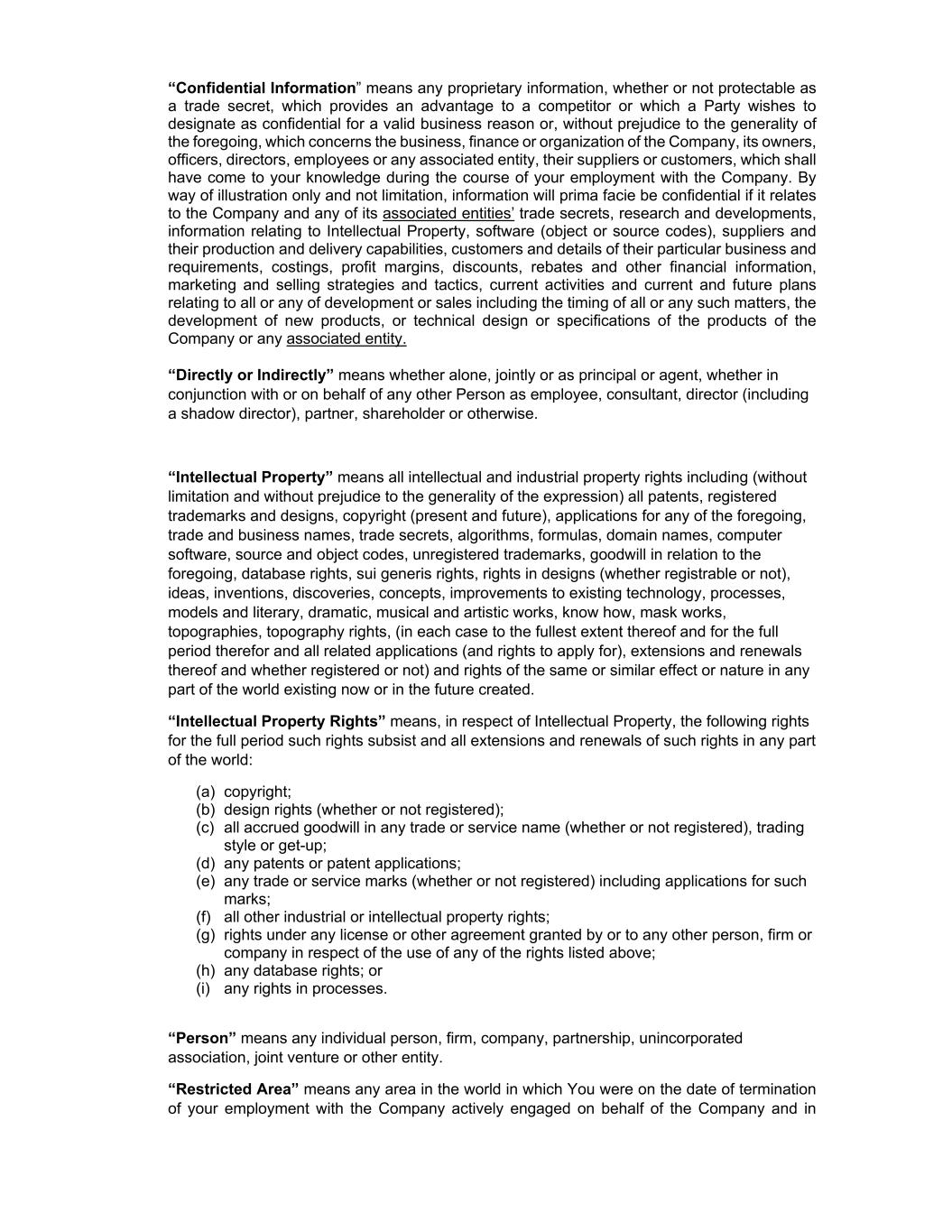 “Confidential Information” means any proprietary information, whether or not protectable as a trade secret, which provides an advantage to a competitor or which a Party wishes to designate as confidential for a valid business reason or, without prejudice to the generality of the foregoing, which concerns the business, finance or organization of the Company, its owners, officers, directors, employees or any associated entity, their suppliers or customers, which shall have come to your knowledge during the course of your employment with the Company. By way of illustration only and not limitation, information will prima facie be confidential if it relates to the Company and any of its associated entities’ trade secrets, research and developments, information relating to Intellectual Property, software (object or source codes), suppliers and their production and delivery capabilities, customers and details of their particular business and requirements, costings, profit margins, discounts, rebates and other financial information, marketing and selling strategies and tactics, current activities and current and future plans relating to all or any of development or sales including the timing of all or any such matters, the development of new products, or technical design or specifications of the products of the Company or any associated entity. “Directly or Indirectly” means whether alone, jointly or as principal or agent, whether in conjunction with or on behalf of any other Person as employee, consultant, director (including a shadow director), partner, shareholder or otherwise. “Intellectual Property” means all intellectual and industrial property rights including (without limitation and without prejudice to the generality of the expression) all patents, registered trademarks and designs, copyright (present and future), applications for any of the foregoing, trade and business names, trade secrets, algorithms, formulas, domain names, computer software, source and object codes, unregistered trademarks, goodwill in relation to the foregoing, database rights, sui generis rights, rights in designs (whether registrable or not), ideas, inventions, discoveries, concepts, improvements to existing technology, processes, models and literary, dramatic, musical and artistic works, know how, mask works, topographies, topography rights, (in each case to the fullest extent thereof and for the full period therefor and all related applications (and rights to apply for), extensions and renewals thereof and whether registered or not) and rights of the same or similar effect or nature in any part of the world existing now or in the future created. “Intellectual Property Rights” means, in respect of Intellectual Property, the following rights for the full period such rights subsist and all extensions and renewals of such rights in any part of the world: (a) copyright; (b) design rights (whether or not registered); (c) all accrued goodwill in any trade or service name (whether or not registered), trading style or get-up; (d) any patents or patent applications; (e) any trade or service marks (whether or not registered) including applications for such marks; (f) all other industrial or intellectual property rights; (g) rights under any license or other agreement granted by or to any other person, firm or company in respect of the use of any of the rights listed above; (h) any database rights; or (i) any rights in processes. “Person” means any individual person, firm, company, partnership, unincorporated association, joint venture or other entity. “Restricted Area” means any area in the world in which You were on the date of termination of your employment with the Company actively engaged on behalf of the Company and in
