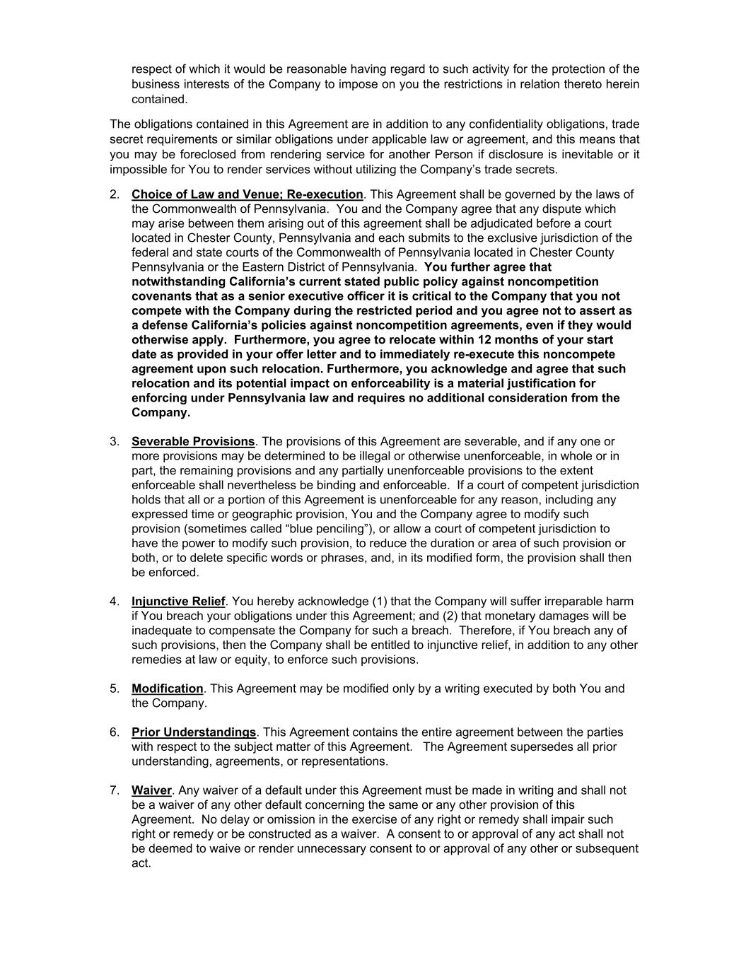 respect of which it would be reasonable having regard to such activity for the protection of the business interests of the Company to impose on you the restrictions in relation thereto herein contained. The obligations contained in this Agreement are in addition to any confidentiality obligations, trade secret requirements or similar obligations under applicable law or agreement, and this means that you may be foreclosed from rendering service for another Person if disclosure is inevitable or it impossible for You to render services without utilizing the Company’s trade secrets. 2. Choice of Law and Venue; Re-execution. This Agreement shall be governed by the laws of the Commonwealth of Pennsylvania. You and the Company agree that any dispute which may arise between them arising out of this agreement shall be adjudicated before a court located in Chester County, Pennsylvania and each submits to the exclusive jurisdiction of the federal and state courts of the Commonwealth of Pennsylvania located in Chester County Pennsylvania or the Eastern District of Pennsylvania. You further agree that notwithstanding California’s current stated public policy against noncompetition covenants that as a senior executive officer it is critical to the Company that you not compete with the Company during the restricted period and you agree not to assert as a defense California’s policies against noncompetition agreements, even if they would otherwise apply. Furthermore, you agree to relocate within 12 months of your start date as provided in your offer letter and to immediately re-execute this noncompete agreement upon such relocation. Furthermore, you acknowledge and agree that such relocation and its potential impact on enforceability is a material justification for enforcing under Pennsylvania law and requires no additional consideration from the Company. 3. Severable Provisions. The provisions of this Agreement are severable, and if any one or more provisions may be determined to be illegal or otherwise unenforceable, in whole or in part, the remaining provisions and any partially unenforceable provisions to the extent enforceable shall nevertheless be binding and enforceable. If a court of competent jurisdiction holds that all or a portion of this Agreement is unenforceable for any reason, including any expressed time or geographic provision, You and the Company agree to modify such provision (sometimes called “blue penciling”), or allow a court of competent jurisdiction to have the power to modify such provision, to reduce the duration or area of such provision or both, or to delete specific words or phrases, and, in its modified form, the provision shall then be enforced. 4. Injunctive Relief. You hereby acknowledge (1) that the Company will suffer irreparable harm if You breach your obligations under this Agreement; and (2) that monetary damages will be inadequate to compensate the Company for such a breach. Therefore, if You breach any of such provisions, then the Company shall be entitled to injunctive relief, in addition to any other remedies at law or equity, to enforce such provisions. 5. Modification. This Agreement may be modified only by a writing executed by both You and the Company. 6. Prior Understandings. This Agreement contains the entire agreement between the parties with respect to the subject matter of this Agreement. The Agreement supersedes all prior understanding, agreements, or representations. 7. Waiver. Any waiver of a default under this Agreement must be made in writing and shall not be a waiver of any other default concerning the same or any other provision of this Agreement. No delay or omission in the exercise of any right or remedy shall impair such right or remedy or be constructed as a waiver. A consent to or approval of any act shall not be deemed to waive or render unnecessary consent to or approval of any other or subsequent act.
