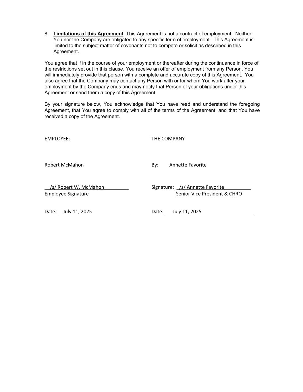 8. Limitations of this Agreement. This Agreement is not a contract of employment. Neither You nor the Company are obligated to any specific term of employment. This Agreement is limited to the subject matter of covenants not to compete or solicit as described in this Agreement. You agree that if in the course of your employment or thereafter during the continuance in force of the restrictions set out in this clause, You receive an offer of employment from any Person, You will immediately provide that person with a complete and accurate copy of this Agreement. You also agree that the Company may contact any Person with or for whom You work after your employment by the Company ends and may notify that Person of your obligations under this Agreement or send them a copy of this Agreement. By your signature below, You acknowledge that You have read and understand the foregoing Agreement, that You agree to comply with all of the terms of the Agreement, and that You have received a copy of the Agreement. EMPLOYEE: THE COMPANY Robert McMahon By: Annette Favorite __/s/ Robert W. McMahon_________ Signature: _/s/ Annette Favorite__________ Employee Signature Senior Vice President & CHRO Date: __July 11, 2025______________ Date: ___July 11, 2025___________________