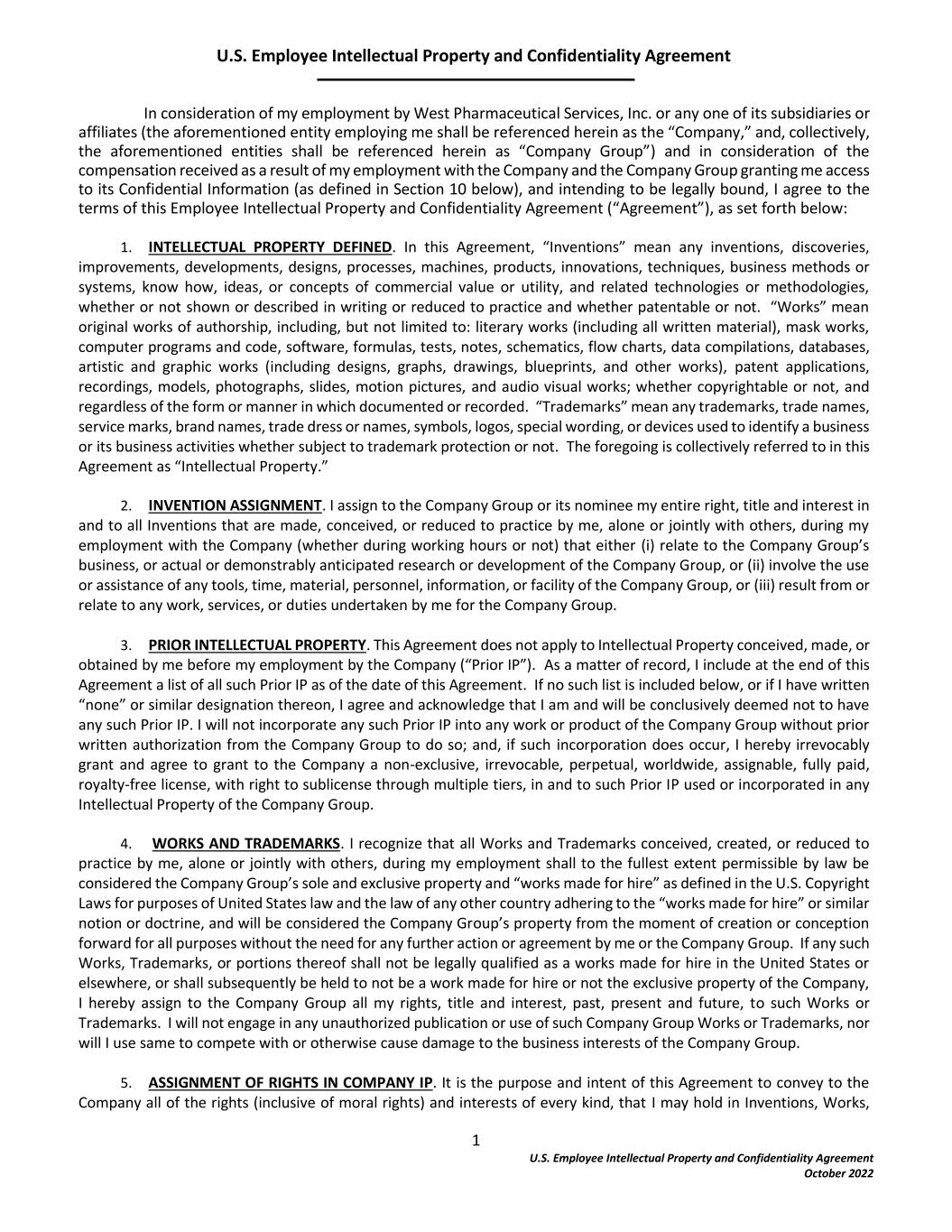 1 U.S. Employee Intellectual Property and Confidentiality Agreement October 2022 U.S. Employee Intellectual Property and Confidentiality Agreement In consideration of my employment by West Pharmaceutical Services, Inc. or any one of its subsidiaries or affiliates (the aforementioned entity employing me shall be referenced herein as the “Company,” and, collectively, the aforementioned entities shall be referenced herein as “Company Group”) and in consideration of the compensation received as a result of my employment with the Company and the Company Group granting me access to its Confidential Information (as defined in Section 10 below), and intending to be legally bound, I agree to the terms of this Employee Intellectual Property and Confidentiality Agreement (“Agreement”), as set forth below: 1. INTELLECTUAL PROPERTY DEFINED. In this Agreement, “Inventions” mean any inventions, discoveries, improvements, developments, designs, processes, machines, products, innovations, techniques, business methods or systems, know how, ideas, or concepts of commercial value or utility, and related technologies or methodologies, whether or not shown or described in writing or reduced to practice and whether patentable or not. “Works” mean original works of authorship, including, but not limited to: literary works (including all written material), mask works, computer programs and code, software, formulas, tests, notes, schematics, flow charts, data compilations, databases, artistic and graphic works (including designs, graphs, drawings, blueprints, and other works), patent applications, recordings, models, photographs, slides, motion pictures, and audio visual works; whether copyrightable or not, and regardless of the form or manner in which documented or recorded. “Trademarks” mean any trademarks, trade names, service marks, brand names, trade dress or names, symbols, logos, special wording, or devices used to identify a business or its business activities whether subject to trademark protection or not. The foregoing is collectively referred to in this Agreement as “Intellectual Property.” 2. INVENTION ASSIGNMENT. I assign to the Company Group or its nominee my entire right, title and interest in and to all Inventions that are made, conceived, or reduced to practice by me, alone or jointly with others, during my employment with the Company (whether during working hours or not) that either (i) relate to the Company Group’s business, or actual or demonstrably anticipated research or development of the Company Group, or (ii) involve the use or assistance of any tools, time, material, personnel, information, or facility of the Company Group, or (iii) result from or relate to any work, services, or duties undertaken by me for the Company Group. 3. PRIOR INTELLECTUAL PROPERTY. This Agreement does not apply to Intellectual Property conceived, made, or obtained by me before my employment by the Company (“Prior IP”). As a matter of record, I include at the end of this Agreement a list of all such Prior IP as of the date of this Agreement. If no such list is included below, or if I have written “none” or similar designation thereon, I agree and acknowledge that I am and will be conclusively deemed not to have any such Prior IP. I will not incorporate any such Prior IP into any work or product of the Company Group without prior written authorization from the Company Group to do so; and, if such incorporation does occur, I hereby irrevocably grant and agree to grant to the Company a non-exclusive, irrevocable, perpetual, worldwide, assignable, fully paid, royalty-free license, with right to sublicense through multiple tiers, in and to such Prior IP used or incorporated in any Intellectual Property of the Company Group. 4. WORKS AND TRADEMARKS. I recognize that all Works and Trademarks conceived, created, or reduced to practice by me, alone or jointly with others, during my employment shall to the fullest extent permissible by law be considered the Company Group’s sole and exclusive property and “works made for hire” as defined in the U.S. Copyright Laws for purposes of United States law and the law of any other country adhering to the “works made for hire” or similar notion or doctrine, and will be considered the Company Group’s property from the moment of creation or conception forward for all purposes without the need for any further action or agreement by me or the Company Group. If any such Works, Trademarks, or portions thereof shall not be legally qualified as a works made for hire in the United States or elsewhere, or shall subsequently be held to not be a work made for hire or not the exclusive property of the Company, I hereby assign to the Company Group all my rights, title and interest, past, present and future, to such Works or Trademarks. I will not engage in any unauthorized publication or use of such Company Group Works or Trademarks, nor will I use same to compete with or otherwise cause damage to the business interests of the Company Group. 5. ASSIGNMENT OF RIGHTS IN COMPANY IP. It is the purpose and intent of this Agreement to convey to the Company all of the rights (inclusive of moral rights) and interests of every kind, that I may hold in Inventions, Works,
