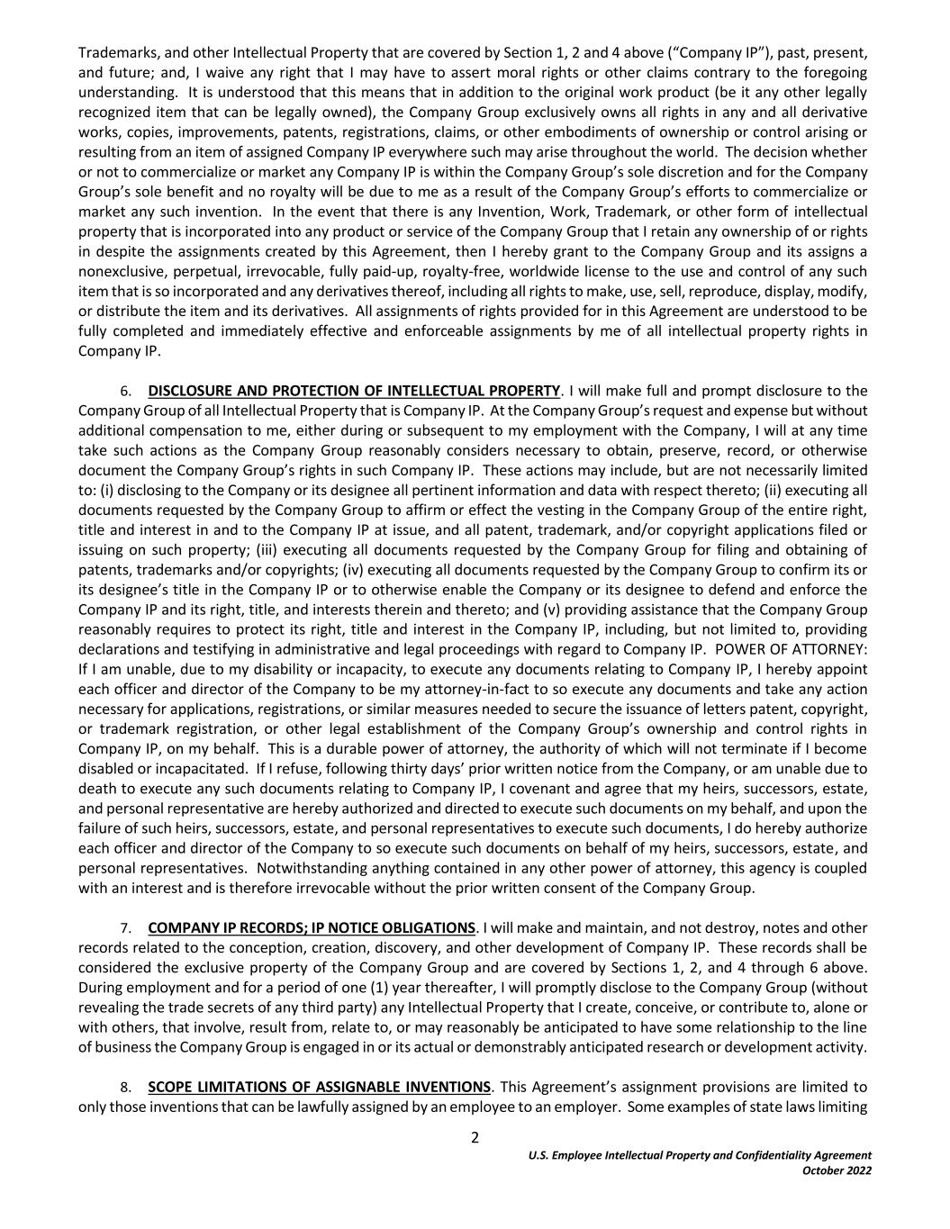 2 U.S. Employee Intellectual Property and Confidentiality Agreement October 2022 Trademarks, and other Intellectual Property that are covered by Section 1, 2 and 4 above (“Company IP”), past, present, and future; and, I waive any right that I may have to assert moral rights or other claims contrary to the foregoing understanding. It is understood that this means that in addition to the original work product (be it any other legally recognized item that can be legally owned), the Company Group exclusively owns all rights in any and all derivative works, copies, improvements, patents, registrations, claims, or other embodiments of ownership or control arising or resulting from an item of assigned Company IP everywhere such may arise throughout the world. The decision whether or not to commercialize or market any Company IP is within the Company Group’s sole discretion and for the Company Group’s sole benefit and no royalty will be due to me as a result of the Company Group’s efforts to commercialize or market any such invention. In the event that there is any Invention, Work, Trademark, or other form of intellectual property that is incorporated into any product or service of the Company Group that I retain any ownership of or rights in despite the assignments created by this Agreement, then I hereby grant to the Company Group and its assigns a nonexclusive, perpetual, irrevocable, fully paid-up, royalty-free, worldwide license to the use and control of any such item that is so incorporated and any derivatives thereof, including all rights to make, use, sell, reproduce, display, modify, or distribute the item and its derivatives. All assignments of rights provided for in this Agreement are understood to be fully completed and immediately effective and enforceable assignments by me of all intellectual property rights in Company IP. 6. DISCLOSURE AND PROTECTION OF INTELLECTUAL PROPERTY. I will make full and prompt disclosure to the Company Group of all Intellectual Property that is Company IP. At the Company Group’s request and expense but without additional compensation to me, either during or subsequent to my employment with the Company, I will at any time take such actions as the Company Group reasonably considers necessary to obtain, preserve, record, or otherwise document the Company Group’s rights in such Company IP. These actions may include, but are not necessarily limited to: (i) disclosing to the Company or its designee all pertinent information and data with respect thereto; (ii) executing all documents requested by the Company Group to affirm or effect the vesting in the Company Group of the entire right, title and interest in and to the Company IP at issue, and all patent, trademark, and/or copyright applications filed or issuing on such property; (iii) executing all documents requested by the Company Group for filing and obtaining of patents, trademarks and/or copyrights; (iv) executing all documents requested by the Company Group to confirm its or its designee’s title in the Company IP or to otherwise enable the Company or its designee to defend and enforce the Company IP and its right, title, and interests therein and thereto; and (v) providing assistance that the Company Group reasonably requires to protect its right, title and interest in the Company IP, including, but not limited to, providing declarations and testifying in administrative and legal proceedings with regard to Company IP. POWER OF ATTORNEY: If I am unable, due to my disability or incapacity, to execute any documents relating to Company IP, I hereby appoint each officer and director of the Company to be my attorney-in-fact to so execute any documents and take any action necessary for applications, registrations, or similar measures needed to secure the issuance of letters patent, copyright, or trademark registration, or other legal establishment of the Company Group’s ownership and control rights in Company IP, on my behalf. This is a durable power of attorney, the authority of which will not terminate if I become disabled or incapacitated. If I refuse, following thirty days’ prior written notice from the Company, or am unable due to death to execute any such documents relating to Company IP, I covenant and agree that my heirs, successors, estate, and personal representative are hereby authorized and directed to execute such documents on my behalf, and upon the failure of such heirs, successors, estate, and personal representatives to execute such documents, I do hereby authorize each officer and director of the Company to so execute such documents on behalf of my heirs, successors, estate, and personal representatives. Notwithstanding anything contained in any other power of attorney, this agency is coupled with an interest and is therefore irrevocable without the prior written consent of the Company Group. 7. COMPANY IP RECORDS; IP NOTICE OBLIGATIONS. I will make and maintain, and not destroy, notes and other records related to the conception, creation, discovery, and other development of Company IP. These records shall be considered the exclusive property of the Company Group and are covered by Sections 1, 2, and 4 through 6 above. During employment and for a period of one (1) year thereafter, I will promptly disclose to the Company Group (without revealing the trade secrets of any third party) any Intellectual Property that I create, conceive, or contribute to, alone or with others, that involve, result from, relate to, or may reasonably be anticipated to have some relationship to the line of business the Company Group is engaged in or its actual or demonstrably anticipated research or development activity. 8. SCOPE LIMITATIONS OF ASSIGNABLE INVENTIONS. This Agreement’s assignment provisions are limited to only those inventions that can be lawfully assigned by an employee to an employer. Some examples of state laws limiting