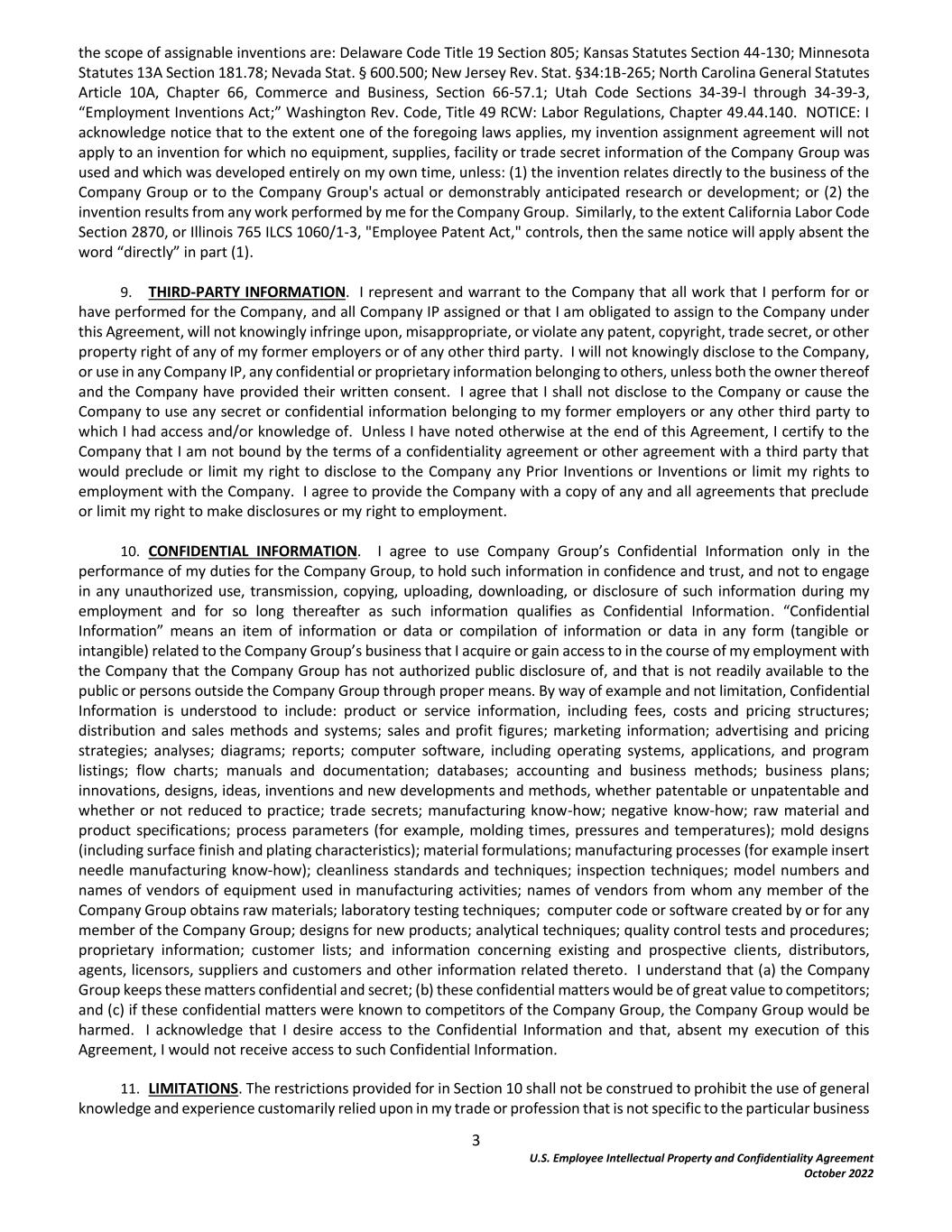 3 U.S. Employee Intellectual Property and Confidentiality Agreement October 2022 the scope of assignable inventions are: Delaware Code Title 19 Section 805; Kansas Statutes Section 44-130; Minnesota Statutes 13A Section 181.78; Nevada Stat. § 600.500; New Jersey Rev. Stat. §34:1B-265; North Carolina General Statutes Article 10A, Chapter 66, Commerce and Business, Section 66-57.1; Utah Code Sections 34-39-l through 34-39-3, “Employment Inventions Act;” Washington Rev. Code, Title 49 RCW: Labor Regulations, Chapter 49.44.140. NOTICE: I acknowledge notice that to the extent one of the foregoing laws applies, my invention assignment agreement will not apply to an invention for which no equipment, supplies, facility or trade secret information of the Company Group was used and which was developed entirely on my own time, unless: (1) the invention relates directly to the business of the Company Group or to the Company Group's actual or demonstrably anticipated research or development; or (2) the invention results from any work performed by me for the Company Group. Similarly, to the extent California Labor Code Section 2870, or Illinois 765 ILCS 1060/1-3, "Employee Patent Act," controls, then the same notice will apply absent the word “directly” in part (1). 9. THIRD-PARTY INFORMATION. I represent and warrant to the Company that all work that I perform for or have performed for the Company, and all Company IP assigned or that I am obligated to assign to the Company under this Agreement, will not knowingly infringe upon, misappropriate, or violate any patent, copyright, trade secret, or other property right of any of my former employers or of any other third party. I will not knowingly disclose to the Company, or use in any Company IP, any confidential or proprietary information belonging to others, unless both the owner thereof and the Company have provided their written consent. I agree that I shall not disclose to the Company or cause the Company to use any secret or confidential information belonging to my former employers or any other third party to which I had access and/or knowledge of. Unless I have noted otherwise at the end of this Agreement, I certify to the Company that I am not bound by the terms of a confidentiality agreement or other agreement with a third party that would preclude or limit my right to disclose to the Company any Prior Inventions or Inventions or limit my rights to employment with the Company. I agree to provide the Company with a copy of any and all agreements that preclude or limit my right to make disclosures or my right to employment. 10. CONFIDENTIAL INFORMATION. I agree to use Company Group’s Confidential Information only in the performance of my duties for the Company Group, to hold such information in confidence and trust, and not to engage in any unauthorized use, transmission, copying, uploading, downloading, or disclosure of such information during my employment and for so long thereafter as such information qualifies as Confidential Information. “Confidential Information” means an item of information or data or compilation of information or data in any form (tangible or intangible) related to the Company Group’s business that I acquire or gain access to in the course of my employment with the Company that the Company Group has not authorized public disclosure of, and that is not readily available to the public or persons outside the Company Group through proper means. By way of example and not limitation, Confidential Information is understood to include: product or service information, including fees, costs and pricing structures; distribution and sales methods and systems; sales and profit figures; marketing information; advertising and pricing strategies; analyses; diagrams; reports; computer software, including operating systems, applications, and program listings; flow charts; manuals and documentation; databases; accounting and business methods; business plans; innovations, designs, ideas, inventions and new developments and methods, whether patentable or unpatentable and whether or not reduced to practice; trade secrets; manufacturing know-how; negative know-how; raw material and product specifications; process parameters (for example, molding times, pressures and temperatures); mold designs (including surface finish and plating characteristics); material formulations; manufacturing processes (for example insert needle manufacturing know‐how); cleanliness standards and techniques; inspection techniques; model numbers and names of vendors of equipment used in manufacturing activities; names of vendors from whom any member of the Company Group obtains raw materials; laboratory testing techniques; computer code or software created by or for any member of the Company Group; designs for new products; analytical techniques; quality control tests and procedures; proprietary information; customer lists; and information concerning existing and prospective clients, distributors, agents, licensors, suppliers and customers and other information related thereto. I understand that (a) the Company Group keeps these matters confidential and secret; (b) these confidential matters would be of great value to competitors; and (c) if these confidential matters were known to competitors of the Company Group, the Company Group would be harmed. I acknowledge that I desire access to the Confidential Information and that, absent my execution of this Agreement, I would not receive access to such Confidential Information. 11. LIMITATIONS. The restrictions provided for in Section 10 shall not be construed to prohibit the use of general knowledge and experience customarily relied upon in my trade or profession that is not specific to the particular business