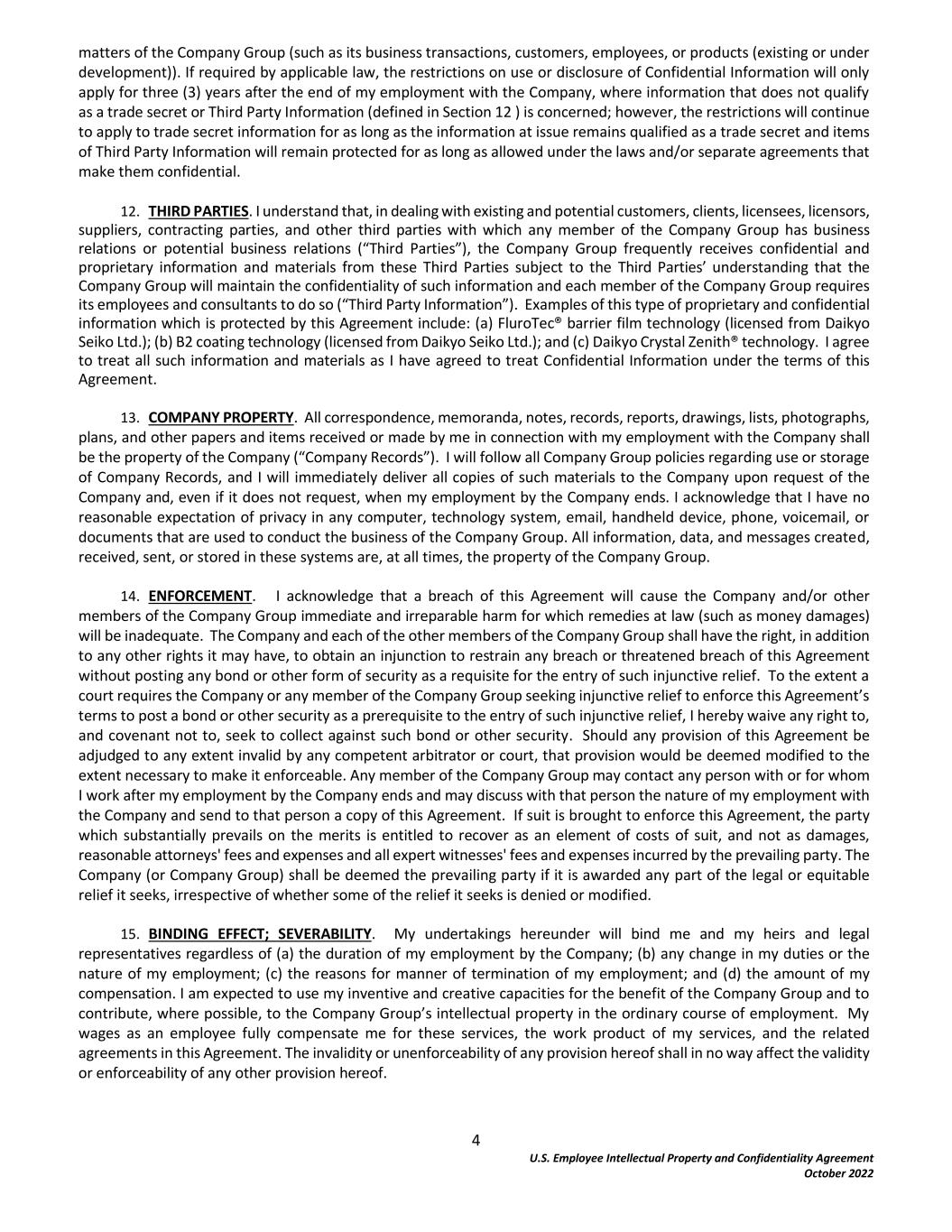 4 U.S. Employee Intellectual Property and Confidentiality Agreement October 2022 matters of the Company Group (such as its business transactions, customers, employees, or products (existing or under development)). If required by applicable law, the restrictions on use or disclosure of Confidential Information will only apply for three (3) years after the end of my employment with the Company, where information that does not qualify as a trade secret or Third Party Information (defined in Section 12 ) is concerned; however, the restrictions will continue to apply to trade secret information for as long as the information at issue remains qualified as a trade secret and items of Third Party Information will remain protected for as long as allowed under the laws and/or separate agreements that make them confidential. 12. THIRD PARTIES. I understand that, in dealing with existing and potential customers, clients, licensees, licensors, suppliers, contracting parties, and other third parties with which any member of the Company Group has business relations or potential business relations (“Third Parties”), the Company Group frequently receives confidential and proprietary information and materials from these Third Parties subject to the Third Parties’ understanding that the Company Group will maintain the confidentiality of such information and each member of the Company Group requires its employees and consultants to do so (“Third Party Information”). Examples of this type of proprietary and confidential information which is protected by this Agreement include: (a) FluroTec® barrier film technology (licensed from Daikyo Seiko Ltd.); (b) B2 coating technology (licensed from Daikyo Seiko Ltd.); and (c) Daikyo Crystal Zenith® technology. I agree to treat all such information and materials as I have agreed to treat Confidential Information under the terms of this Agreement. 13. COMPANY PROPERTY. All correspondence, memoranda, notes, records, reports, drawings, lists, photographs, plans, and other papers and items received or made by me in connection with my employment with the Company shall be the property of the Company (“Company Records”). I will follow all Company Group policies regarding use or storage of Company Records, and I will immediately deliver all copies of such materials to the Company upon request of the Company and, even if it does not request, when my employment by the Company ends. I acknowledge that I have no reasonable expectation of privacy in any computer, technology system, email, handheld device, phone, voicemail, or documents that are used to conduct the business of the Company Group. All information, data, and messages created, received, sent, or stored in these systems are, at all times, the property of the Company Group. 14. ENFORCEMENT. I acknowledge that a breach of this Agreement will cause the Company and/or other members of the Company Group immediate and irreparable harm for which remedies at law (such as money damages) will be inadequate. The Company and each of the other members of the Company Group shall have the right, in addition to any other rights it may have, to obtain an injunction to restrain any breach or threatened breach of this Agreement without posting any bond or other form of security as a requisite for the entry of such injunctive relief. To the extent a court requires the Company or any member of the Company Group seeking injunctive relief to enforce this Agreement’s terms to post a bond or other security as a prerequisite to the entry of such injunctive relief, I hereby waive any right to, and covenant not to, seek to collect against such bond or other security. Should any provision of this Agreement be adjudged to any extent invalid by any competent arbitrator or court, that provision would be deemed modified to the extent necessary to make it enforceable. Any member of the Company Group may contact any person with or for whom I work after my employment by the Company ends and may discuss with that person the nature of my employment with the Company and send to that person a copy of this Agreement. If suit is brought to enforce this Agreement, the party which substantially prevails on the merits is entitled to recover as an element of costs of suit, and not as damages, reasonable attorneys' fees and expenses and all expert witnesses' fees and expenses incurred by the prevailing party. The Company (or Company Group) shall be deemed the prevailing party if it is awarded any part of the legal or equitable relief it seeks, irrespective of whether some of the relief it seeks is denied or modified. 15. BINDING EFFECT; SEVERABILITY. My undertakings hereunder will bind me and my heirs and legal representatives regardless of (a) the duration of my employment by the Company; (b) any change in my duties or the nature of my employment; (c) the reasons for manner of termination of my employment; and (d) the amount of my compensation. I am expected to use my inventive and creative capacities for the benefit of the Company Group and to contribute, where possible, to the Company Group’s intellectual property in the ordinary course of employment. My wages as an employee fully compensate me for these services, the work product of my services, and the related agreements in this Agreement. The invalidity or unenforceability of any provision hereof shall in no way affect the validity or enforceability of any other provision hereof.