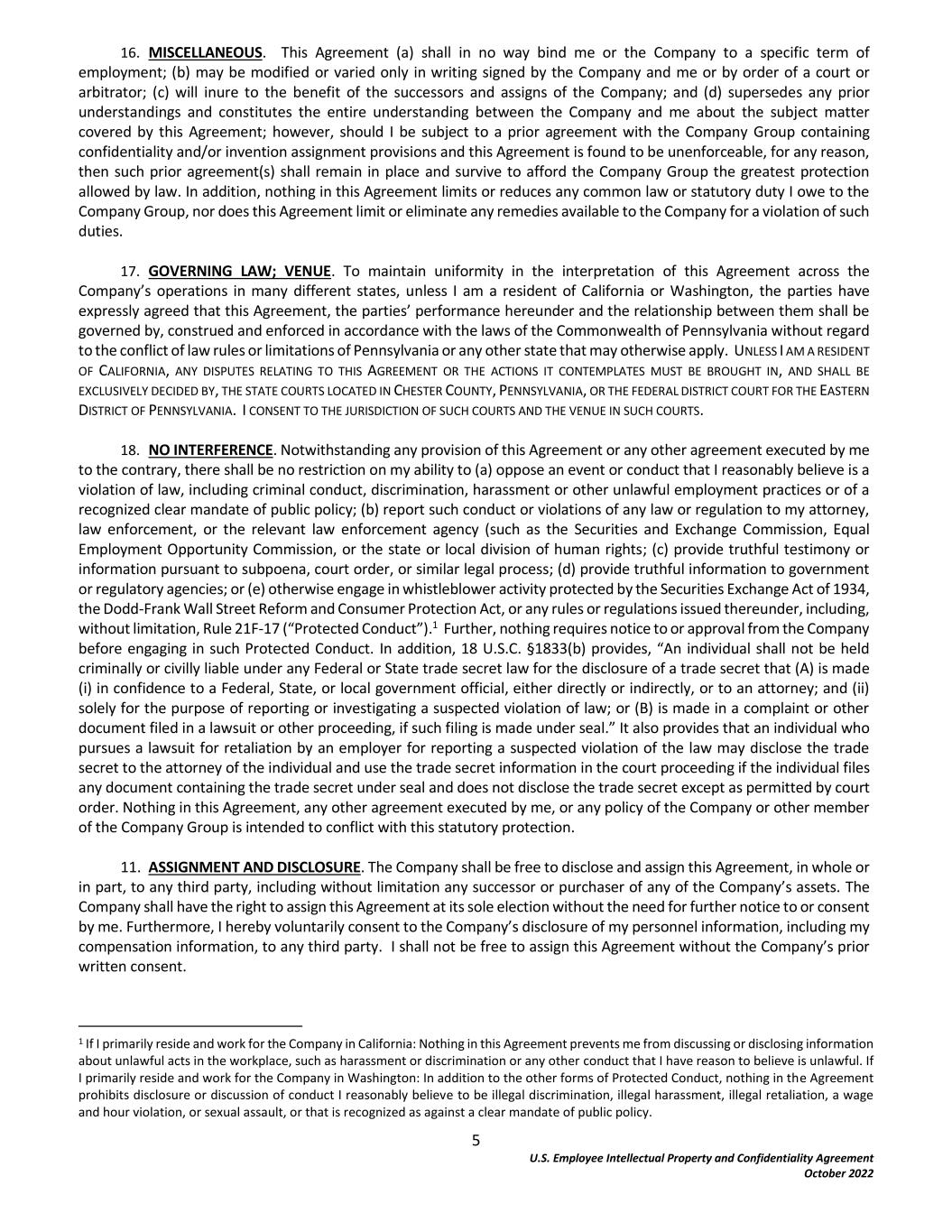 5 U.S. Employee Intellectual Property and Confidentiality Agreement October 2022 16. MISCELLANEOUS. This Agreement (a) shall in no way bind me or the Company to a specific term of employment; (b) may be modified or varied only in writing signed by the Company and me or by order of a court or arbitrator; (c) will inure to the benefit of the successors and assigns of the Company; and (d) supersedes any prior understandings and constitutes the entire understanding between the Company and me about the subject matter covered by this Agreement; however, should I be subject to a prior agreement with the Company Group containing confidentiality and/or invention assignment provisions and this Agreement is found to be unenforceable, for any reason, then such prior agreement(s) shall remain in place and survive to afford the Company Group the greatest protection allowed by law. In addition, nothing in this Agreement limits or reduces any common law or statutory duty I owe to the Company Group, nor does this Agreement limit or eliminate any remedies available to the Company for a violation of such duties. 17. GOVERNING LAW; VENUE. To maintain uniformity in the interpretation of this Agreement across the Company’s operations in many different states, unless I am a resident of California or Washington, the parties have expressly agreed that this Agreement, the parties’ performance hereunder and the relationship between them shall be governed by, construed and enforced in accordance with the laws of the Commonwealth of Pennsylvania without regard to the conflict of law rules or limitations of Pennsylvania or any other state that may otherwise apply. UNLESS I AM A RESIDENT OF CALIFORNIA, ANY DISPUTES RELATING TO THIS AGREEMENT OR THE ACTIONS IT CONTEMPLATES MUST BE BROUGHT IN, AND SHALL BE EXCLUSIVELY DECIDED BY, THE STATE COURTS LOCATED IN CHESTER COUNTY, PENNSYLVANIA, OR THE FEDERAL DISTRICT COURT FOR THE EASTERN DISTRICT OF PENNSYLVANIA. I CONSENT TO THE JURISDICTION OF SUCH COURTS AND THE VENUE IN SUCH COURTS. 18. NO INTERFERENCE. Notwithstanding any provision of this Agreement or any other agreement executed by me to the contrary, there shall be no restriction on my ability to (a) oppose an event or conduct that I reasonably believe is a violation of law, including criminal conduct, discrimination, harassment or other unlawful employment practices or of a recognized clear mandate of public policy; (b) report such conduct or violations of any law or regulation to my attorney, law enforcement, or the relevant law enforcement agency (such as the Securities and Exchange Commission, Equal Employment Opportunity Commission, or the state or local division of human rights; (c) provide truthful testimony or information pursuant to subpoena, court order, or similar legal process; (d) provide truthful information to government or regulatory agencies; or (e) otherwise engage in whistleblower activity protected by the Securities Exchange Act of 1934, the Dodd-Frank Wall Street Reform and Consumer Protection Act, or any rules or regulations issued thereunder, including, without limitation, Rule 21F-17 (“Protected Conduct”).1 Further, nothing requires notice to or approval from the Company before engaging in such Protected Conduct. In addition, 18 U.S.C. §1833(b) provides, “An individual shall not be held criminally or civilly liable under any Federal or State trade secret law for the disclosure of a trade secret that (A) is made (i) in confidence to a Federal, State, or local government official, either directly or indirectly, or to an attorney; and (ii) solely for the purpose of reporting or investigating a suspected violation of law; or (B) is made in a complaint or other document filed in a lawsuit or other proceeding, if such filing is made under seal.” It also provides that an individual who pursues a lawsuit for retaliation by an employer for reporting a suspected violation of the law may disclose the trade secret to the attorney of the individual and use the trade secret information in the court proceeding if the individual files any document containing the trade secret under seal and does not disclose the trade secret except as permitted by court order. Nothing in this Agreement, any other agreement executed by me, or any policy of the Company or other member of the Company Group is intended to conflict with this statutory protection. 11. ASSIGNMENT AND DISCLOSURE. The Company shall be free to disclose and assign this Agreement, in whole or in part, to any third party, including without limitation any successor or purchaser of any of the Company’s assets. The Company shall have the right to assign this Agreement at its sole election without the need for further notice to or consent by me. Furthermore, I hereby voluntarily consent to the Company’s disclosure of my personnel information, including my compensation information, to any third party. I shall not be free to assign this Agreement without the Company’s prior written consent. 1 If I primarily reside and work for the Company in California: Nothing in this Agreement prevents me from discussing or disclosing information about unlawful acts in the workplace, such as harassment or discrimination or any other conduct that I have reason to believe is unlawful. If I primarily reside and work for the Company in Washington: In addition to the other forms of Protected Conduct, nothing in the Agreement prohibits disclosure or discussion of conduct I reasonably believe to be illegal discrimination, illegal harassment, illegal retaliation, a wage and hour violation, or sexual assault, or that is recognized as against a clear mandate of public policy.