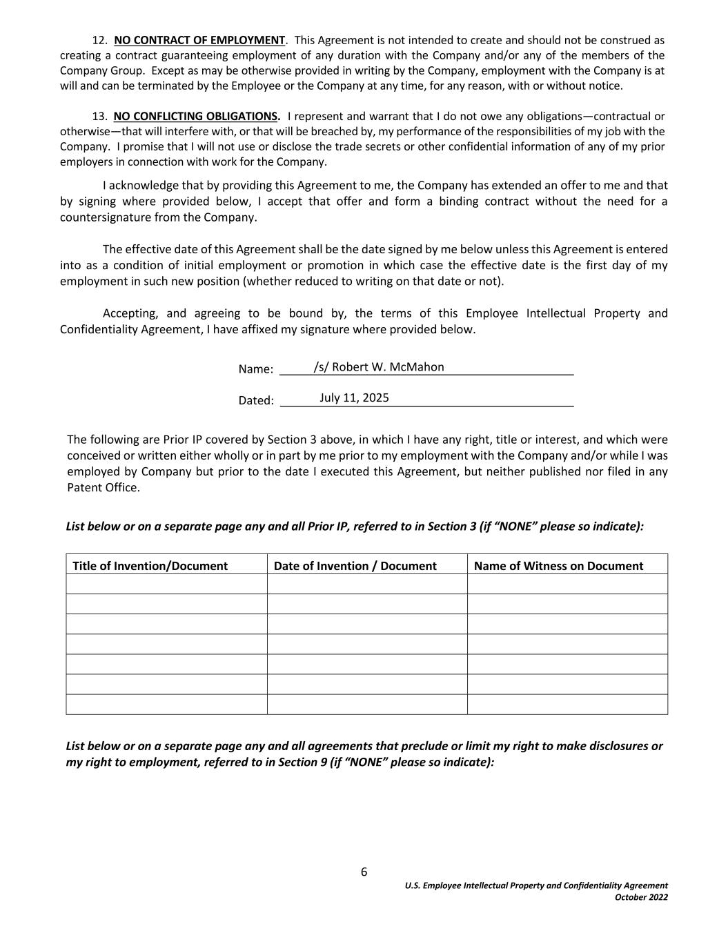 6 U.S. Employee Intellectual Property and Confidentiality Agreement October 2022 12. NO CONTRACT OF EMPLOYMENT. This Agreement is not intended to create and should not be construed as creating a contract guaranteeing employment of any duration with the Company and/or any of the members of the Company Group. Except as may be otherwise provided in writing by the Company, employment with the Company is at will and can be terminated by the Employee or the Company at any time, for any reason, with or without notice. 13. NO CONFLICTING OBLIGATIONS. I represent and warrant that I do not owe any obligations—contractual or otherwise—that will interfere with, or that will be breached by, my performance of the responsibilities of my job with the Company. I promise that I will not use or disclose the trade secrets or other confidential information of any of my prior employers in connection with work for the Company. I acknowledge that by providing this Agreement to me, the Company has extended an offer to me and that by signing where provided below, I accept that offer and form a binding contract without the need for a countersignature from the Company. The effective date of this Agreement shall be the date signed by me below unless this Agreement is entered into as a condition of initial employment or promotion in which case the effective date is the first day of my employment in such new position (whether reduced to writing on that date or not). Accepting, and agreeing to be bound by, the terms of this Employee Intellectual Property and Confidentiality Agreement, I have affixed my signature where provided below. Name: Dated: The following are Prior IP covered by Section 3 above, in which I have any right, title or interest, and which were conceived or written either wholly or in part by me prior to my employment with the Company and/or while I was employed by Company but prior to the date I executed this Agreement, but neither published nor filed in any Patent Office. List below or on a separate page any and all Prior IP, referred to in Section 3 (if “NONE” please so indicate): Title of Invention/Document Date of Invention / Document Name of Witness on Document List below or on a separate page any and all agreements that preclude or limit my right to make disclosures or my right to employment, referred to in Section 9 (if “NONE” please so indicate): /s/ Robert W. McMahon July 11, 2025