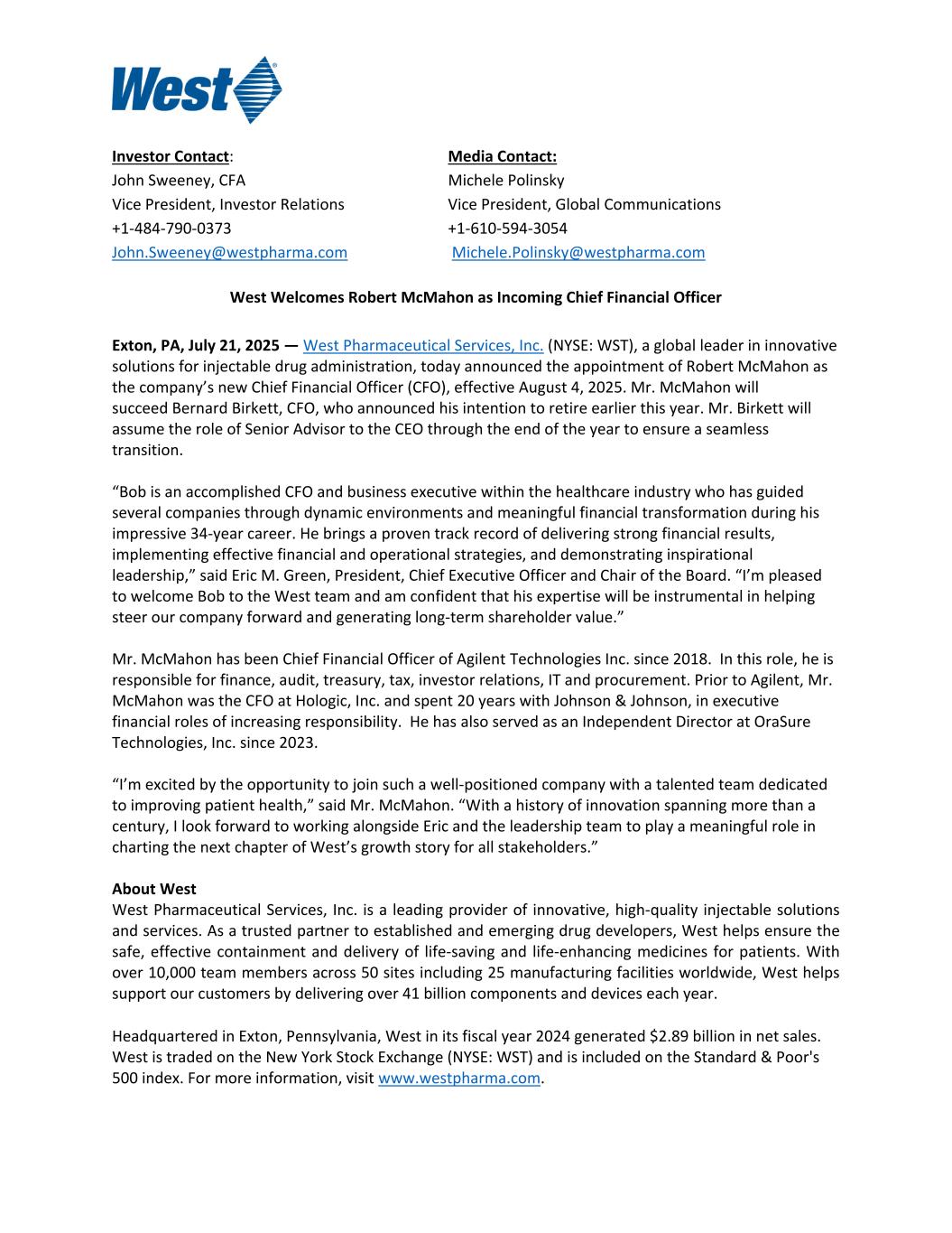 Investor Contact: Media Contact: John Sweeney, CFA Michele Polinsky Vice President, Investor Relations Vice President, Global Communications +1-484-790-0373 +1-610-594-3054 John.Sweeney@westpharma.com Michele.Polinsky@westpharma.com West Welcomes Robert McMahon as Incoming Chief Financial Officer Exton, PA, July 21, 2025 — West Pharmaceutical Services, Inc. (NYSE: WST), a global leader in innovative solutions for injectable drug administration, today announced the appointment of Robert McMahon as the company’s new Chief Financial Officer (CFO), effective August 4, 2025. Mr. McMahon will succeed Bernard Birkett, CFO, who announced his intention to retire earlier this year. Mr. Birkett will assume the role of Senior Advisor to the CEO through the end of the year to ensure a seamless transition. “Bob is an accomplished CFO and business executive within the healthcare industry who has guided several companies through dynamic environments and meaningful financial transformation during his impressive 34-year career. He brings a proven track record of delivering strong financial results, implementing effective financial and operational strategies, and demonstrating inspirational leadership,” said Eric M. Green, President, Chief Executive Officer and Chair of the Board. “I’m pleased to welcome Bob to the West team and am confident that his expertise will be instrumental in helping steer our company forward and generating long-term shareholder value.” Mr. McMahon has been Chief Financial Officer of Agilent Technologies Inc. since 2018. In this role, he is responsible for finance, audit, treasury, tax, investor relations, IT and procurement. Prior to Agilent, Mr. McMahon was the CFO at Hologic, Inc. and spent 20 years with Johnson & Johnson, in executive financial roles of increasing responsibility. He has also served as an Independent Director at OraSure Technologies, Inc. since 2023. “I’m excited by the opportunity to join such a well-positioned company with a talented team dedicated to improving patient health,” said Mr. McMahon. “With a history of innovation spanning more than a century, I look forward to working alongside Eric and the leadership team to play a meaningful role in charting the next chapter of West’s growth story for all stakeholders.” About West West Pharmaceutical Services, Inc. is a leading provider of innovative, high-quality injectable solutions and services. As a trusted partner to established and emerging drug developers, West helps ensure the safe, effective containment and delivery of life-saving and life-enhancing medicines for patients. With over 10,000 team members across 50 sites including 25 manufacturing facilities worldwide, West helps support our customers by delivering over 41 billion components and devices each year. Headquartered in Exton, Pennsylvania, West in its fiscal year 2024 generated $2.89 billion in net sales. West is traded on the New York Stock Exchange (NYSE: WST) and is included on the Standard & Poor's 500 index. For more information, visit www.westpharma.com.
