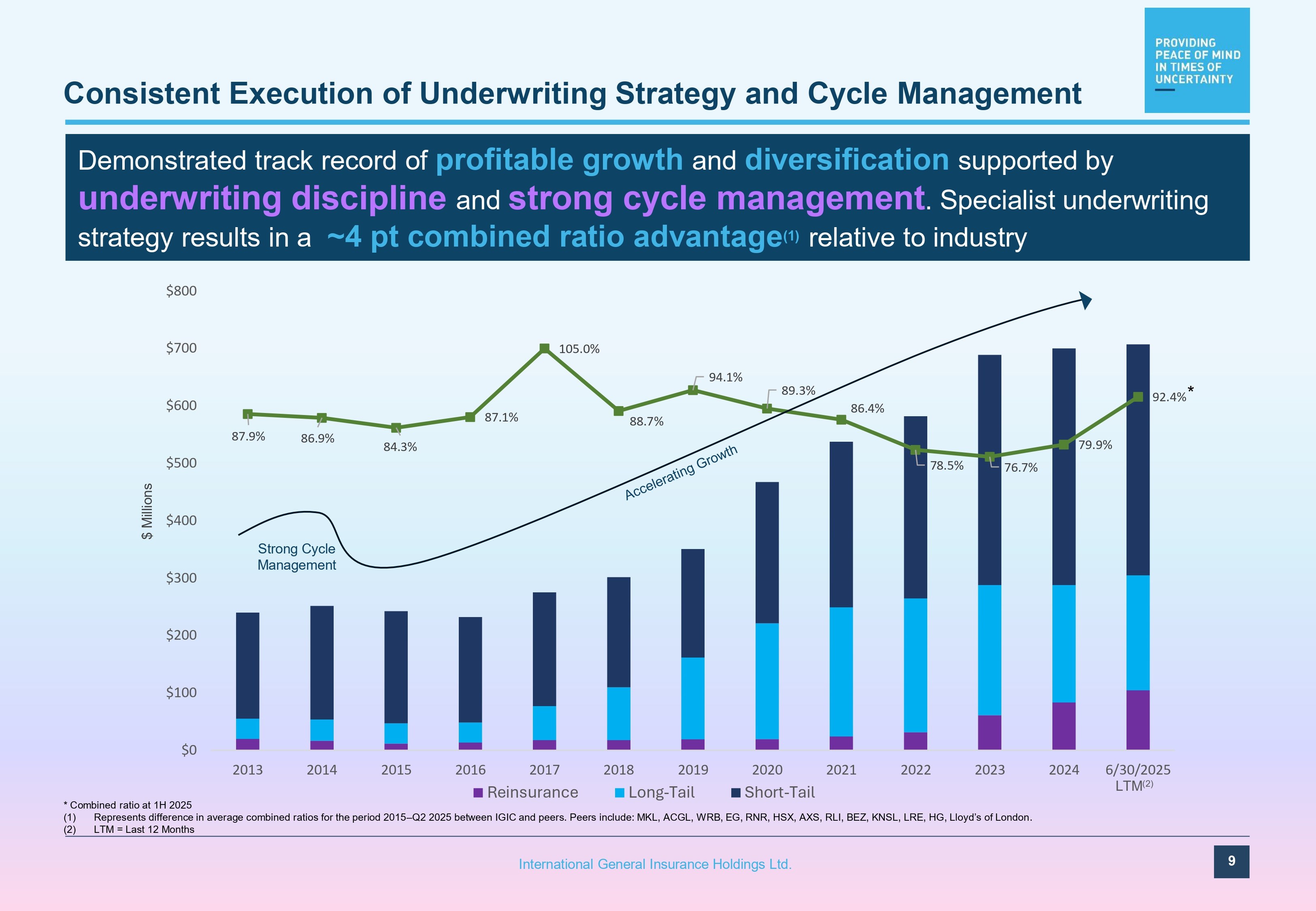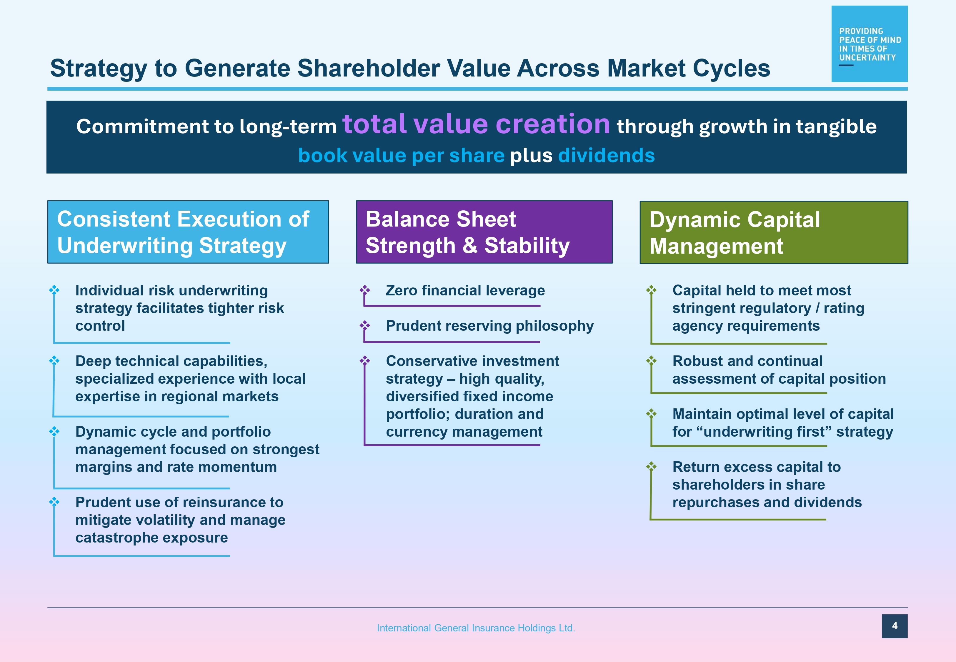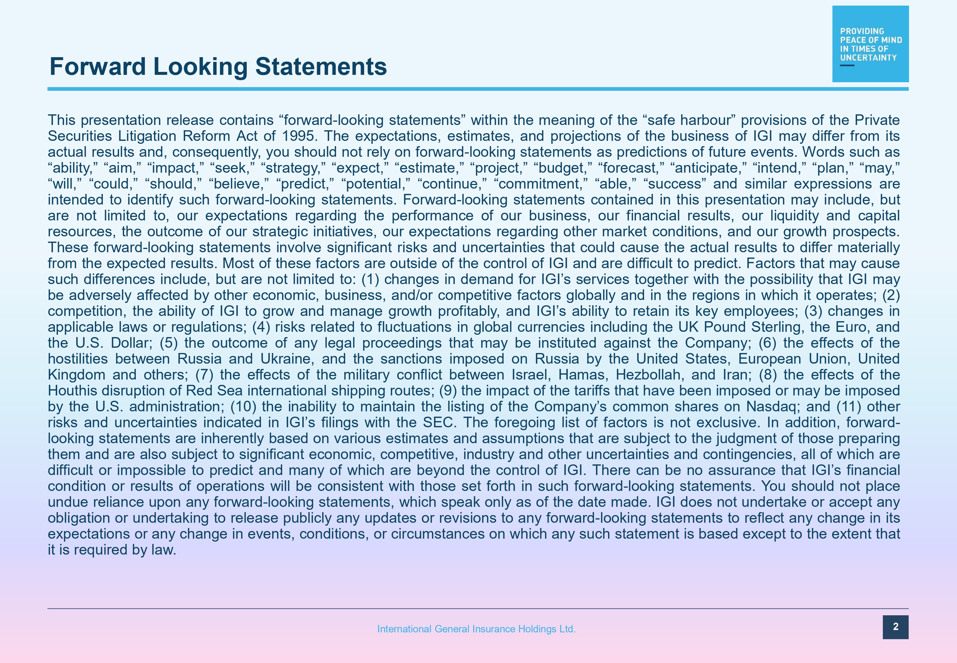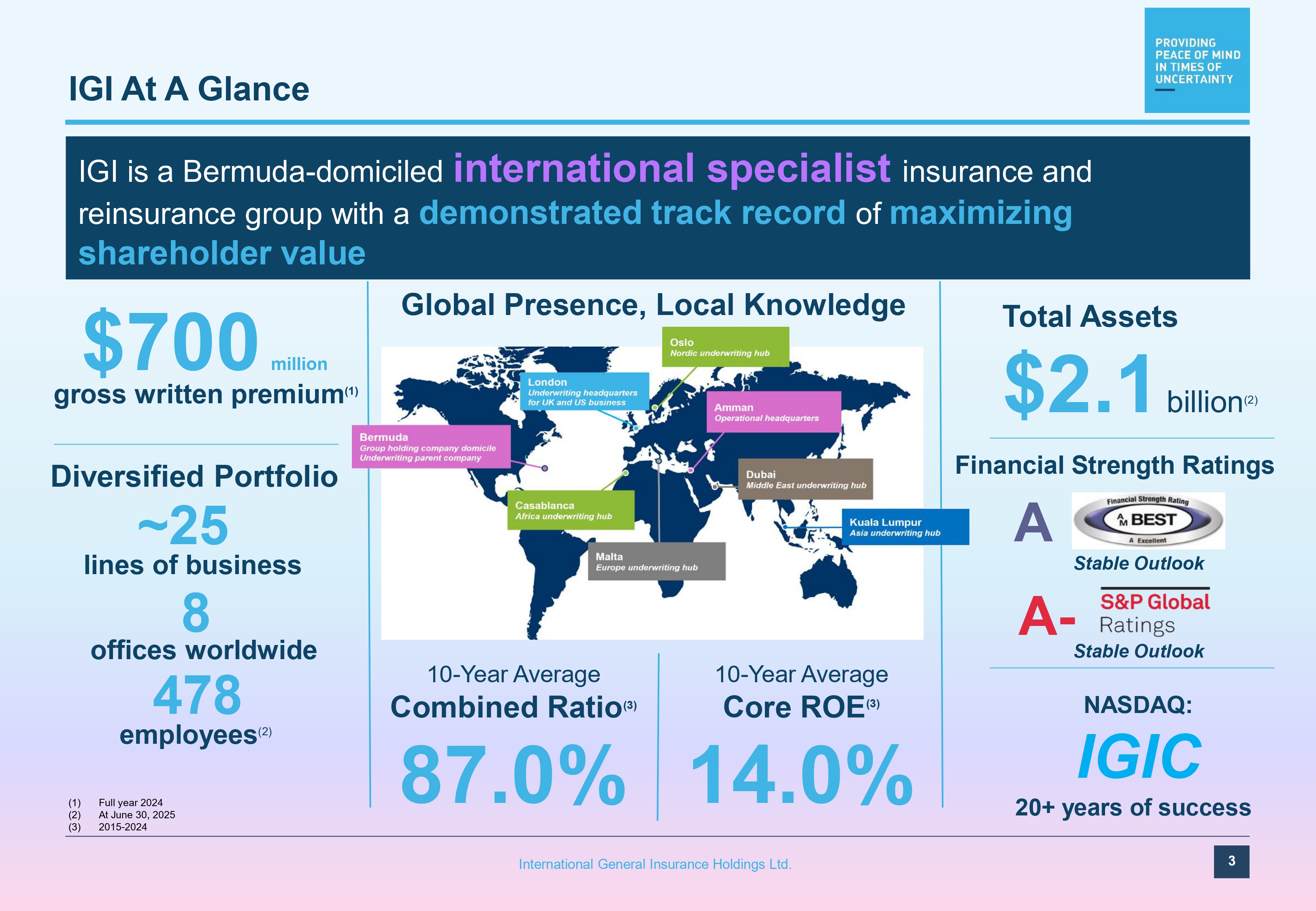 Forward Looking Statements 2 International General Insurance Holdings Ltd. This presentation release contains “forward - looking statements” within the meaning of the “safe harbour” provisions of the Private Securities Litigation Reform Act of 1995 . The expectations, estimates, and projections of the business of IGI may differ from its actual results and, consequently, you should not rely on forward - looking statements as predictions of future events . Words such as “ability,” “aim,” “impact,” “seek,” “strategy,” “expect,” “estimate,” “project,” “budget,” “forecast,” “anticipate,” “intend,” “plan,” “may,” “will,” “could,” “should,” “believe,” “predict,” “potential,” “continue,” “commitment,” “able,” “success” and similar expressions are intended to identify such forward - looking statements . Forward - looking statements contained in this presentation may include, but are not limited to, our expectations regarding the performance of our business, our financial results, our liquidity and capital resources, the outcome of our strategic initiatives, our expectations regarding other market conditions, and our growth prospects . These forward - looking statements involve significant risks and uncertainties that could cause the actual results to differ materially from the expected results . Most of these factors are outside of the control of IGI and are difficult to predict . Factors that may cause such differences include, but are not limited to : ( 1 ) changes in demand for IGI’s services together with the possibility that IGI may be adversely affected by other economic, business, and/or competitive factors globally and in the regions in which it operates ; ( 2 ) competition, the ability of IGI to grow and manage growth profitably, and IGI’s ability to retain its key employees ; ( 3 ) changes in applicable laws or regulations ; ( 4 ) risks related to fluctuations in global currencies including the UK Pound Sterling, the Euro, and the U . S . Dollar ; ( 5 ) the outcome of any legal proceedings that may be instituted against the Company ; ( 6 ) the effects of the hostilities between Russia and Ukraine, and the sanctions imposed on Russia by the United States, European Union, United Kingdom and others ; ( 7 ) the effects of the military conflict between Israel, Hamas, Hezbollah, and Iran ; ( 8 ) the effects of the Houthis disruption of Red Sea international shipping routes ; ( 9 ) the impact of the tariffs that have been imposed or may be imposed by the U . S . administration ; ( 10 ) the inability to maintain the listing of the Company’s common shares on Nasdaq ; and ( 11 ) other risks and uncertainties indicated in IGI’s filings with the SEC . The foregoing list of factors is not exclusive . In addition, forward - looking statements are inherently based on various estimates and assumptions that are subject to the judgment of those preparing them and are also subject to significant economic, competitive, industry and other uncertainties and contingencies, all of which are difficult or impossible to predict and many of which are beyond the control of IGI . There can be no assurance that IGI’s financial condition or results of operations will be consistent with those set forth in such forward - looking statements . You should not place undue reliance upon any forward - looking statements, which speak only as of the date made . IGI does not undertake or accept any obligation or undertaking to release publicly any updates or revisions to any forward - looking statements to reflect any change in its expectations or any change in events, conditions, or circumstances on which any such statement is based except to the extent that it is required by law .
