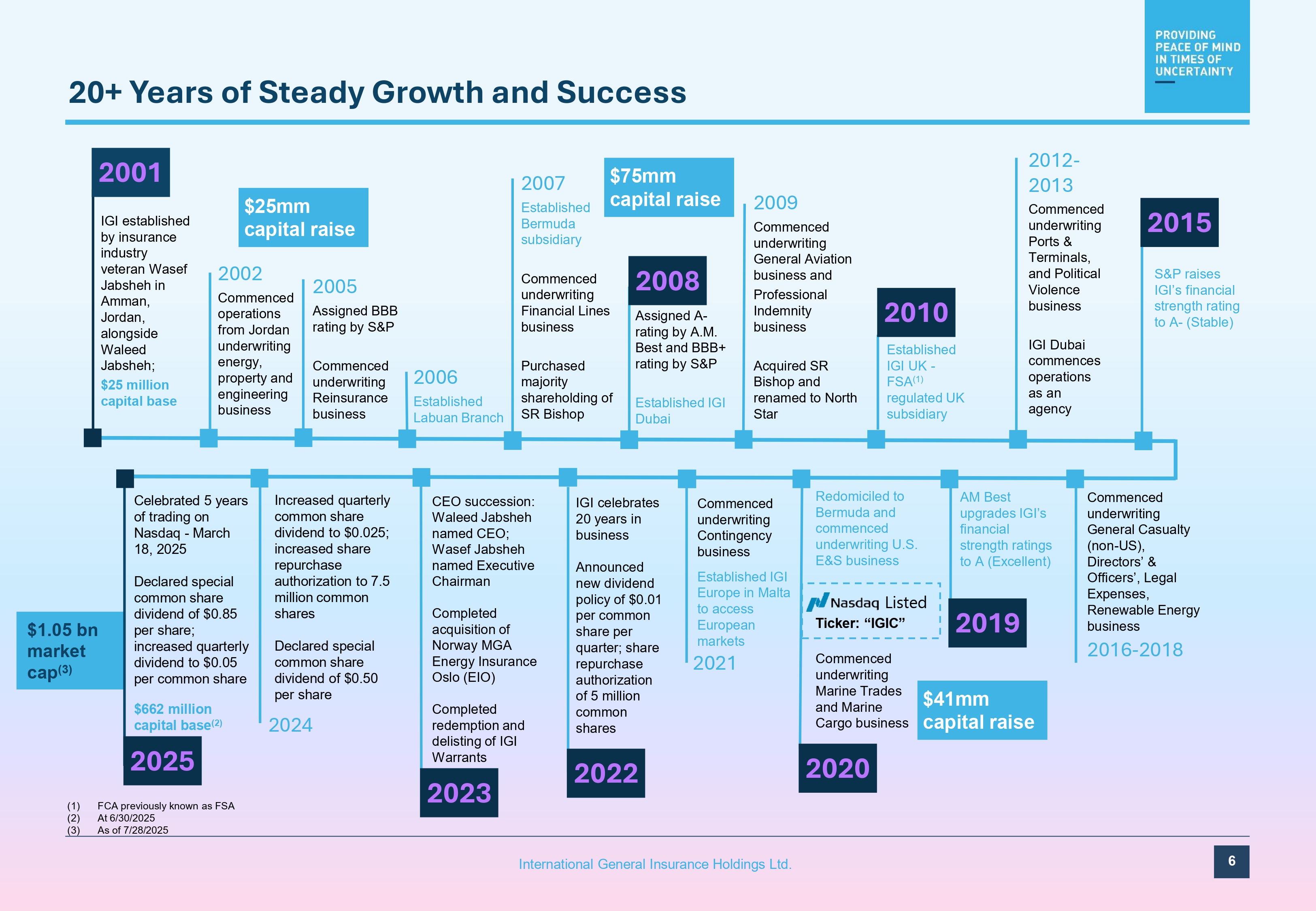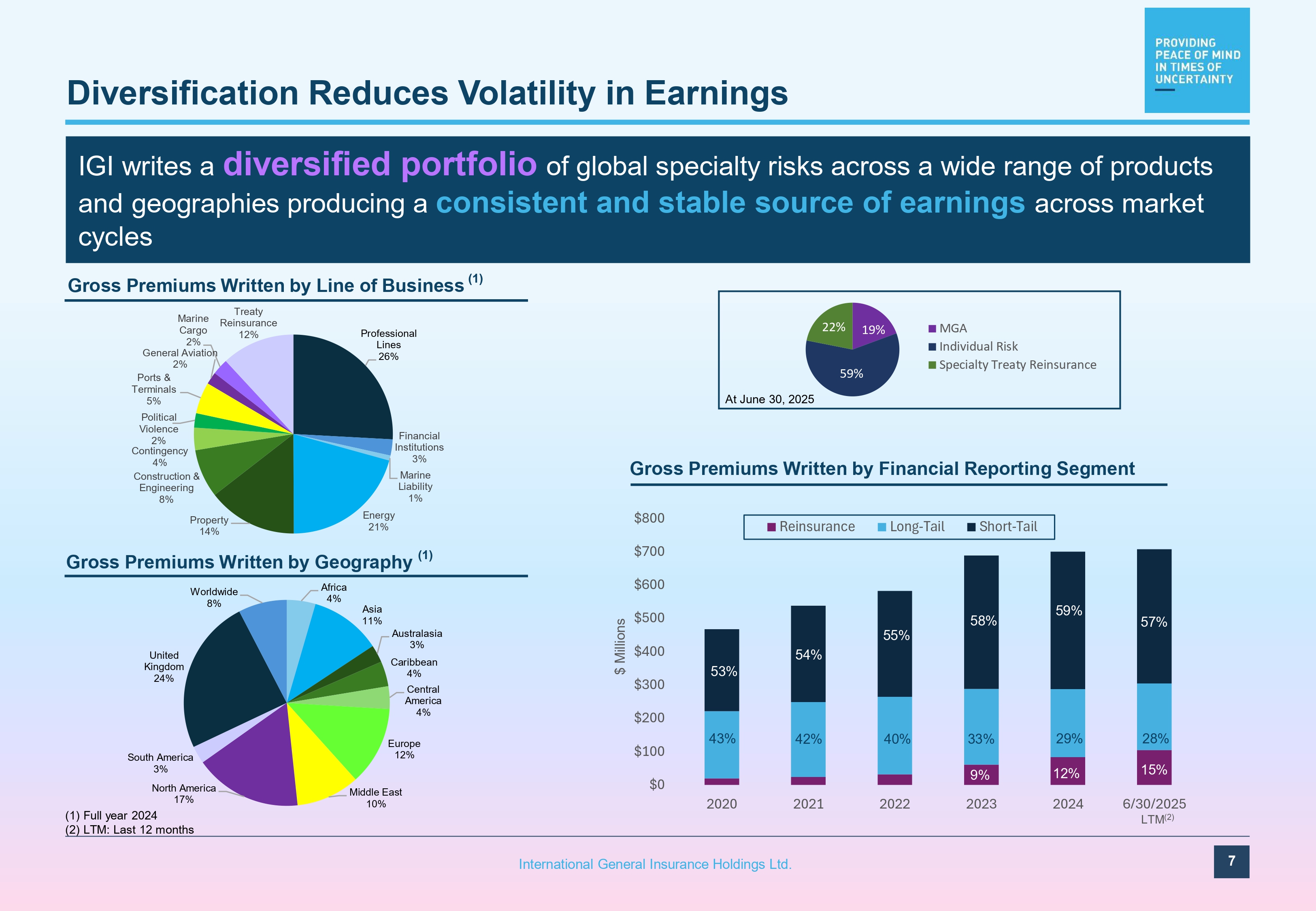 Redomiciled to Bermuda and commenced underwriting U.S. E&S business Commenced underwriting Marine Trades and Marine Cargo business CEO succession: Waleed Jabsheh named CEO; Wasef Jabsheh named Executive Chairman Completed acquisition of Norway MGA Energy Insurance Oslo (EIO) Completed redemption and delisting of IGI Warrants IGI celebrates 20 years in business Announced new dividend policy of $0.01 per common share per quarter; share repurchase authorization of 5 million common shares 2002 Commenced operations from Jordan underwriting energy, property and engineering business 2005 Assigned BBB rating by S&P Commenced underwriting Reinsurance business Assigned A - rating by A.M. Best and BBB+ rating by S&P Established IGI Dubai Established IGI UK - FSA (1) regulated UK subsidiary Commenced underwriting General Casualty (non - US), Directors’ & Officers’, Legal Expenses, Renewable Energy business 2016 - 2018 2006 Established Labuan Branch 2007 Established Bermuda subsidiary Commenced underwriting Financial Lines business Purchased majority shareholding of SR Bishop 2009 Commenced underwriting General Aviation business and Professional Indemnity business Acquired SR Bishop and renamed to North Star AM Best upgrades IGI’s financial strength ratings to A (Excellent) S&P raises IGI’s financial strength rating to A - (Stable) $75mm capital raise $1.05 bn market cap (3) 2012 - 2013 Commenced underwriting Ports & Terminals, and Political Violence business IGI Dubai commences operations as an agency 20+ Years of Steady Growth and Success (1) FCA previously known as FSA (2) At 6/30/2025 (3) As of 7/28/2025 Commenced underwriting Contingency business Established IGI Europe in Malta to access European markets 2021 Listed Ticker: “IGIC” IGI established by insurance industry veteran Wasef Jabsheh in Amman, Jordan, alongside Waleed Jabsheh; $25 million capital base 2001 2010 $25mm capital raise 2022 2008 201G 2015 2020 2023 $41mm capital raise Increased quarterly common share dividend to $0.025; increased share repurchase authorization to 7.5 million common shares Celebrated 5 years of trading on Nasdaq - March 18, 2025 6 International General Insurance Holdings Ltd. Declared special common share dividend of $0.85 per share; increased quarterly dividend to $0.05 per common share $662 million capital base (2) 2025 Declared special common share dividend of $0.50 per share 2024