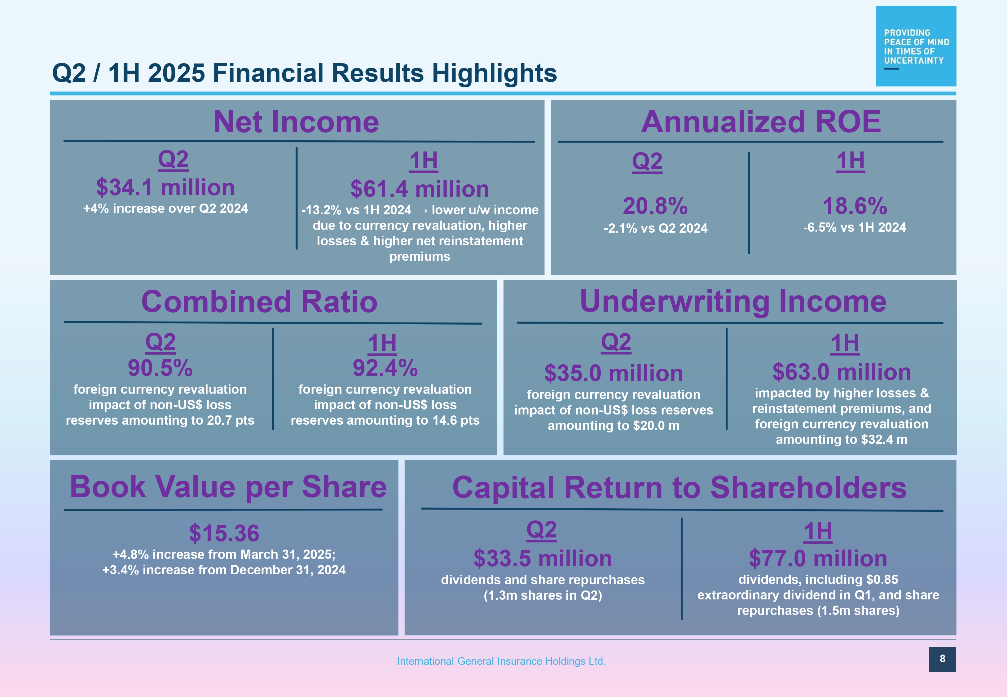 22% 19% 59% MGA Individual Risk Specialty Treaty Reinsurance $800 $700 $600 $500 $400 $300 $200 $100 $0 2020 2021 2022 2023 2024 6/30/2025 Reinsurance Long - Tail Short - Tail Diversification Reduces Volatility in Earnings IGI writes a diversified portfolio of global specialty risks across a wide range of products and geographies producing a consistent and stable source of earnings across market cycles Gross Premiums Written by Line of Business (1) Gross Premiums Written by Financial Reporting Segment Gross Premiums Written by Geography (1) LTM (2) (2) LTM: Last 12 months 57% 28% 15% 59% 29% 12% 58% 33% 9% 55% 54% 53% 40% 42% 43% $ Millions At June 30, 2025 Professional Lines 26% Financial Institutions 3% Marine Liability 1% Energy 21% Property 14% Marine Cargo 2% General Aviation 2% Ports & Terminals 5% Political Violence 2% Contingency 4% Construction & Engineering 8% Treaty Reinsurance 12% Africa 4% 7 International General Insurance Holdings Ltd. Asia 11% Australasia 3% Caribbean 4% Central America 4% Europe 12% Middle East 10% South America 3% North America 17% (1) Full year 2024 United Kingdom 24% Worldwide 8%