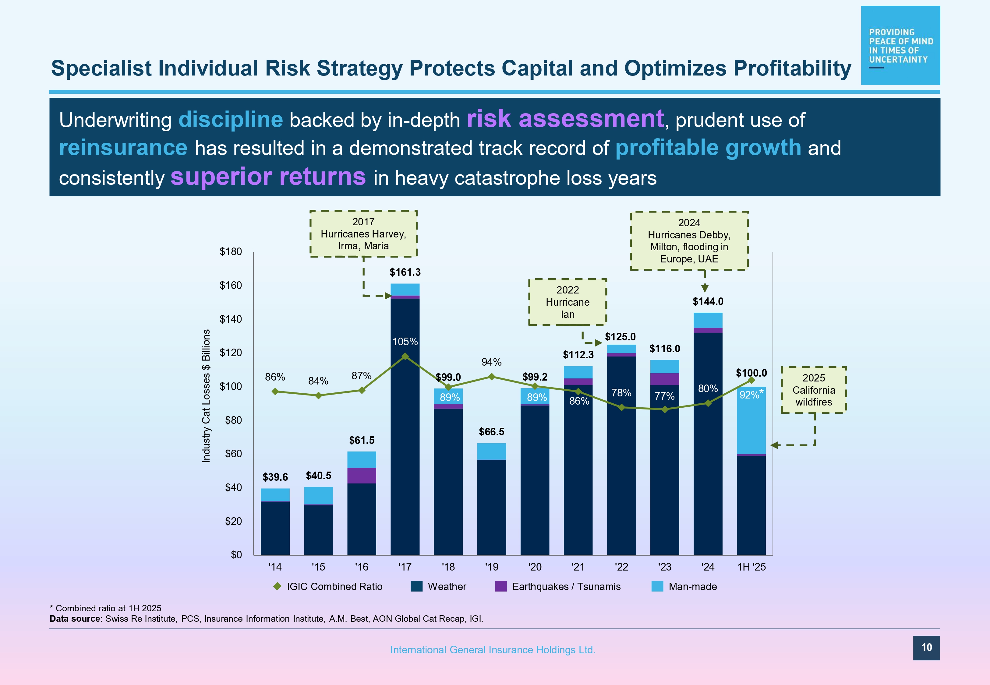 87.9% 86.9% 84.3% 87.1% 105.0% 88.7% 94.1% 89.3% 86.4% 78.5% 76.7% 79.9% $300 $200 $100 $0 $400 $500 $600 $700 $800 2013 2014 2015 2016 2017 2018 2019 2021 2022 2023 Reinsurance Long - Tail 2020 Short - Tail * Combined ratio at 1H 2025 (1) Represents difference in average combined ratios for the period 2015 – Q2 2025 between IGIC and peers. Peers include: MKL, ACGL, WRB, EG, RNR, HSX, AXS, RLI, BEZ, KNSL, LRE, HG, Lloyd’s of London. (2) LTM = Last 12 Months Strong Cycle Management $ Millions 9 International General Insurance Holdings Ltd. 2024 6/30/2025 LTM (2) Consistent Execution of Underwriting Strategy and Cycle Management Demonstrated track record of profitable growth and diversification supported by underwriting discipline and strong cycle management . Specialist underwriting strategy results in a ~4 pt combined ratio advantage (1) relative to industry 92.4% *