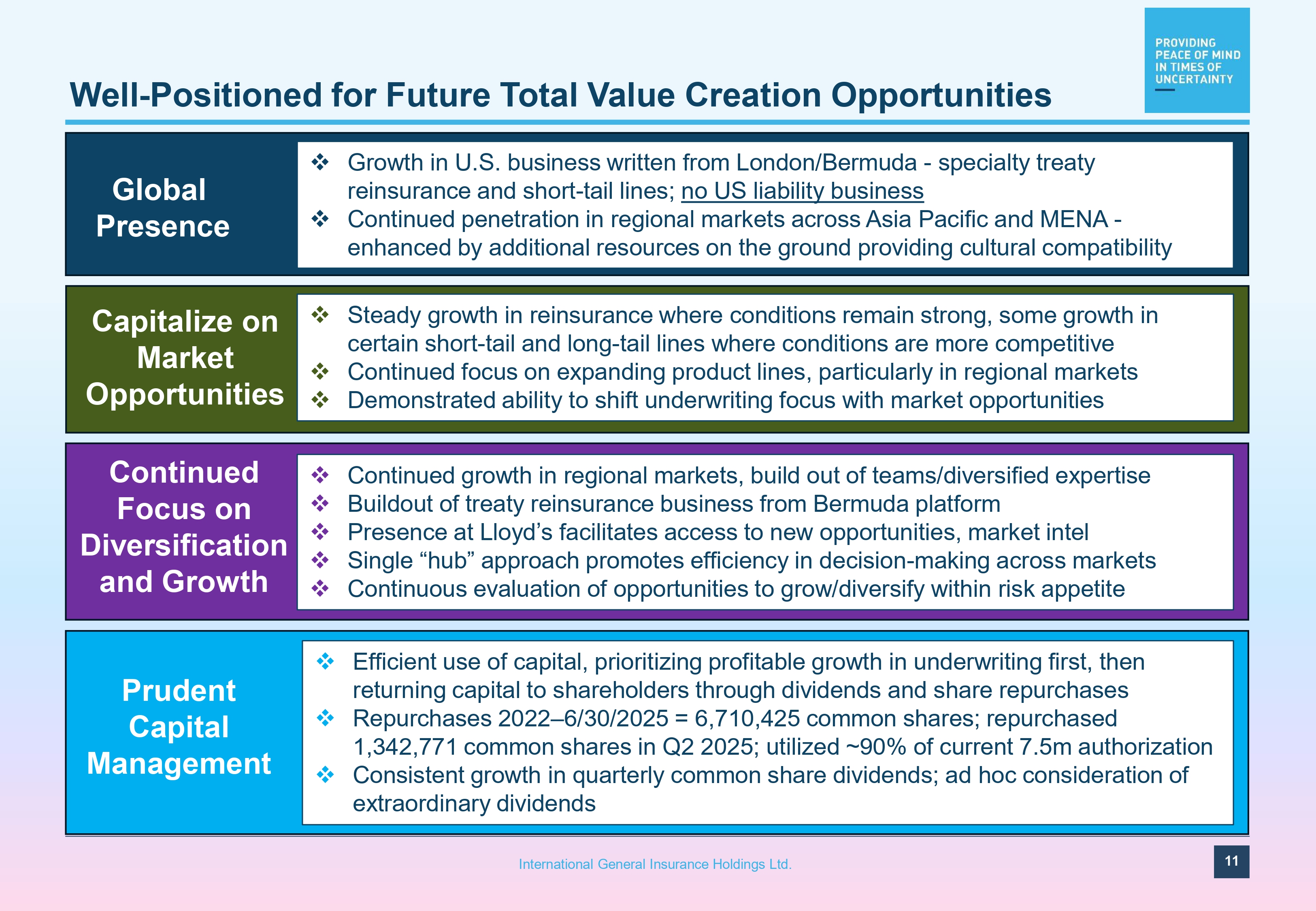$39.6 $40.5 $61.5 $161.3 $99.0 $66.5 $99.2 $112.3 $125.0 $116.0 $144.0 $100.0 86% 84% 87% 105% 89% 94% 89% 86% 78% 77% 80% $40 $20 $0 $60 $80 $100 $120 $140 $160 $180 '14 '17 '19 1H '25 Specialist Individual Risk Strategy Protects Capital and Optimizes Profitability 2017 Hurricanes Harvey, Irma, Maria '18 Weather '20 '21 '22 Earthquakes / Tsunamis '23 '24 Man - made '15 '16 IGIC Combined Ratio Industry Cat Losses $ Billions 2022 Hurricane Ian 2024 Hurricanes Debby, Milton, flooding in Europe, UAE 2025 California wildfires Underwriting discipline backed by in - depth risk assessment , prudent use of reinsurance has resulted in a demonstrated track record of profitable growth and consistently superior returns in heavy catastrophe loss years 10 International General Insurance Holdings Ltd. * Combined ratio at 1H 2025 Data source : Swiss Re Institute, PCS, Insurance Information Institute, A.M. Best, AON Global Cat Recap, IGI. 92% *