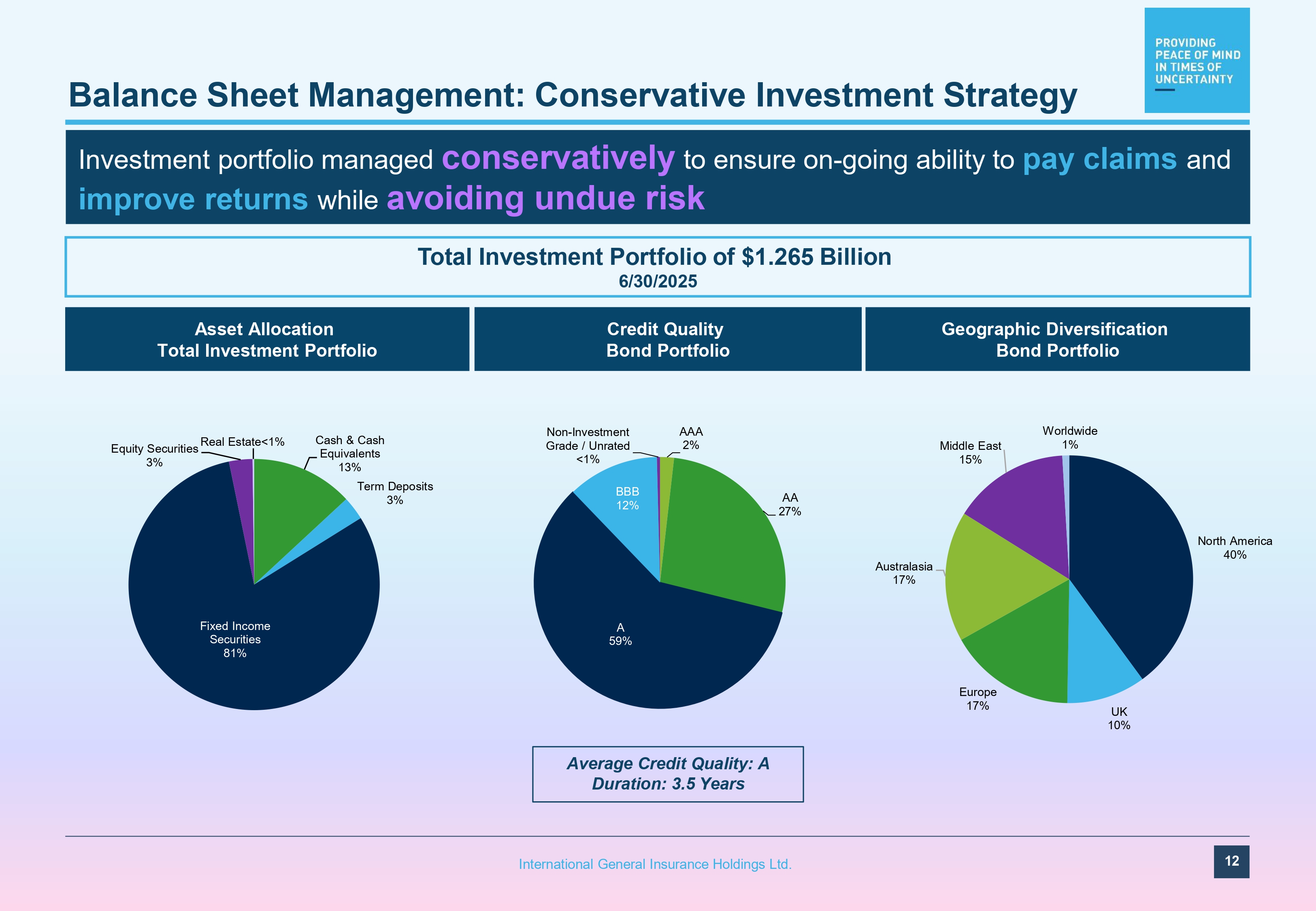 Balance Sheet Management: Conservative Investment Strategy Investment portfolio managed conservatively to ensure on - going ability to pay claims and improve returns while avoiding undue risk Average Credit Quality: A Duration: 3.5 Years Asset Allocation Total Investment Portfolio Credit Quality Bond Portfolio Total Investment Portfolio of $1.265 Billion 6/30/2025 Geographic Diversification Bond Portfolio AAA 2% AA 27% A 59% BBB 12% Non - Investment Grade / Unrated <1% North America 40% UK 10% Europe 17% Australasia 17% Middle East 15% Worldwide 1% Cash & Cash Equivalents 13% Term Deposits 3% 12 International General Insurance Holdings Ltd. Fixed Income Securities 81% Equity Securities 3% Real Estate<1%