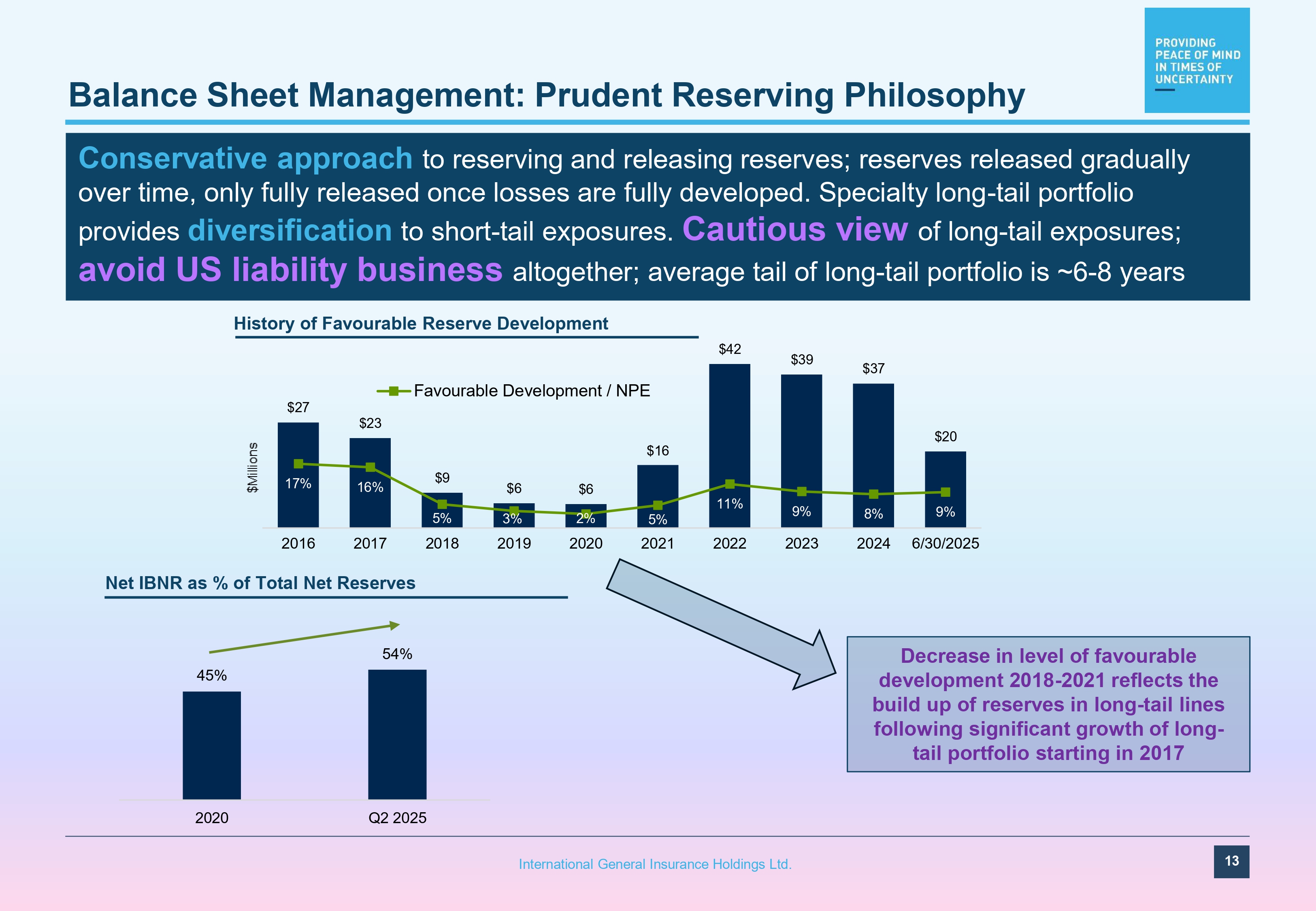 45% 54% 2020 Q2 2025 Balance Sheet Management: Prudent Reserving Philosophy History of Favourable Reserve Development Conservative approach to reserving and releasing reserves; reserves released gradually over time, only fully released once losses are fully developed. Specialty long - tail portfolio provides diversification to short - tail exposures. Cautious view of long - tail exposures; avoid US liability business altogether; average tail of long - tail portfolio is ~6 - 8 years Decrease in level of favourable development 2018 - 2021 reflects the build up of reserves in long - tail lines following significant growth of long - tail portfolio starting in 2017 $27 $23 $9 $6 $6 $16 $42 $39 $37 $20 17% 16% 5% 3% 2% 5% 11% 9% 8% 9% 2016 2017 Net IBNR as % of Total Net Reserves 2018 2019 2020 2021 2022 2023 2024 6/30/2025 Favourable Development / NPE 13 International General Insurance Holdings Ltd.