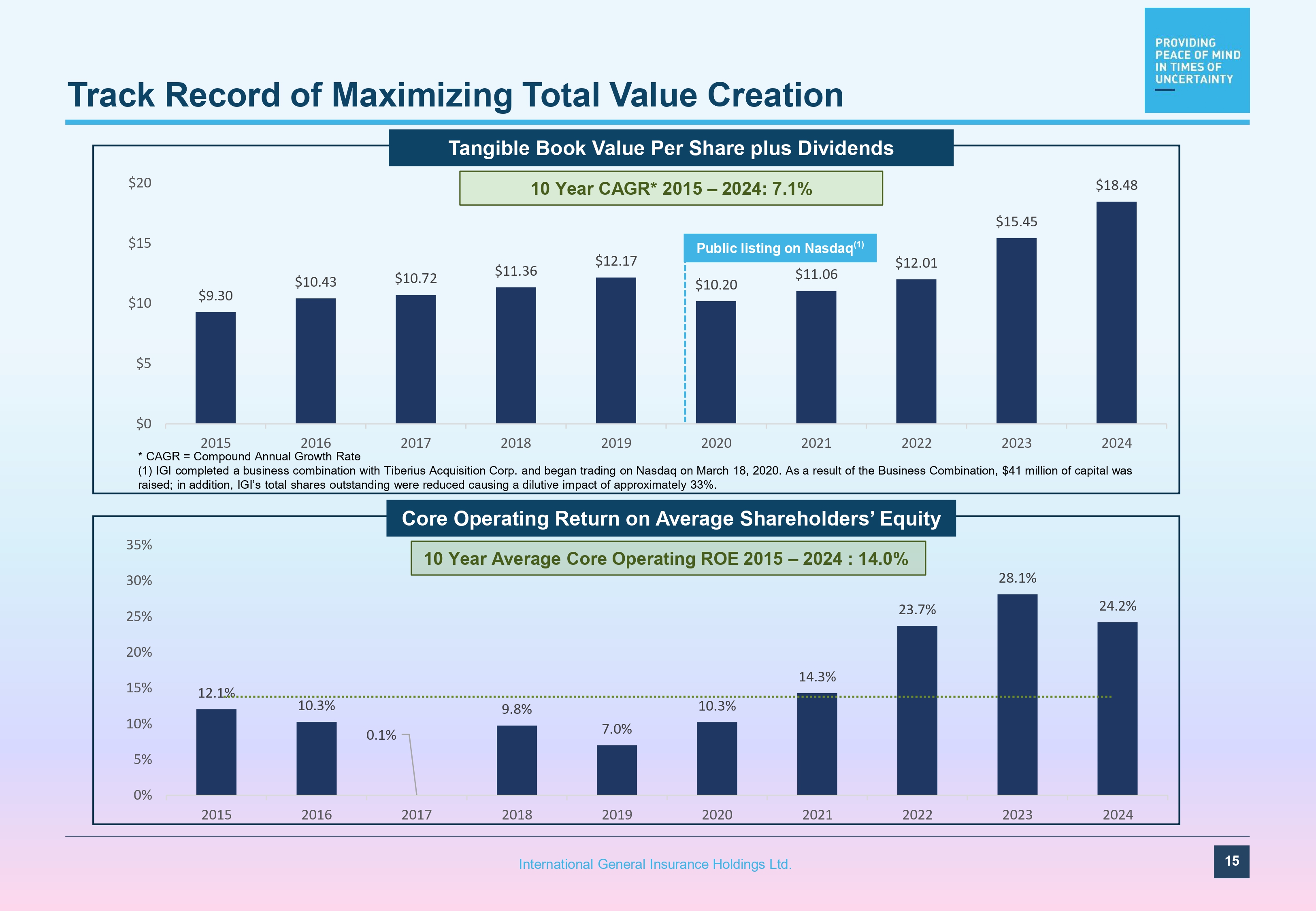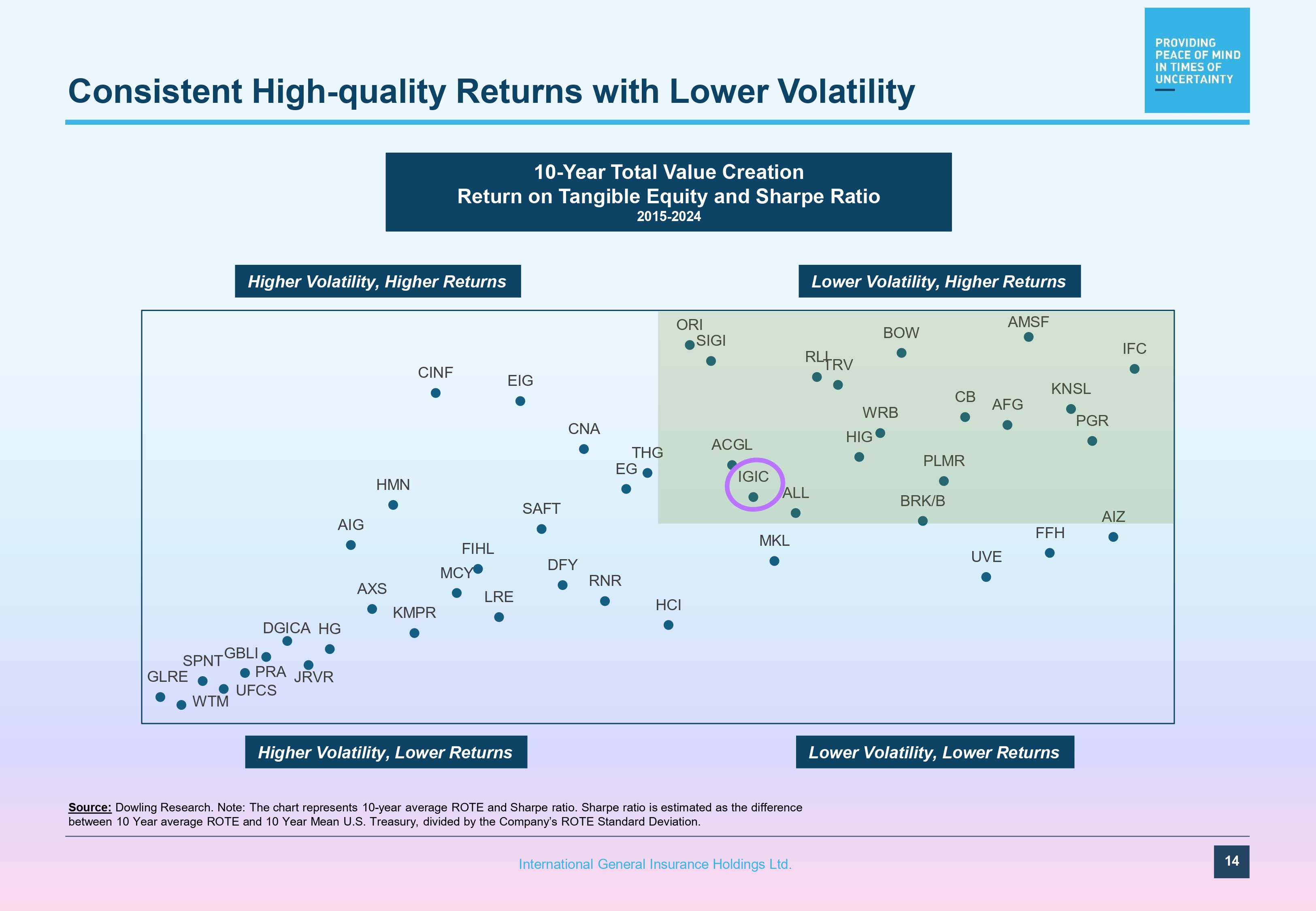 IFC AIZ KNSL PGR FFH AMSF AFG UVE CB PLMR BRK/B BOW WRB HIG TRV RLI ALL MKL IGIC ACGL ORI SIGI HCI THG EG RNR CNA DFY SAFT EIG FIHL MCY LRE CINF KMPR HMN AXS AIG DGICA HG SPNT GBLI GLRE PRA JRVR WTM UFCS Consistent High - quality Returns with Lower Volatility 10 - Year Total Value Creation Return on Tangible Equity and Sharpe Ratio 2015 - 2024 14 International General Insurance Holdings Ltd. Lower Volatility, Higher Returns Higher Volatility, Higher Returns Higher Volatility, Lower Returns Lower Volatility, Lower Returns Source: Dowling Research. Note: The chart represents 10 - year average ROTE and Sharpe ratio. Sharpe ratio is estimated as the difference between 10 Year average ROTE and 10 Year Mean U.S. Treasury, divided by the Company’s ROTE Standard Deviation.