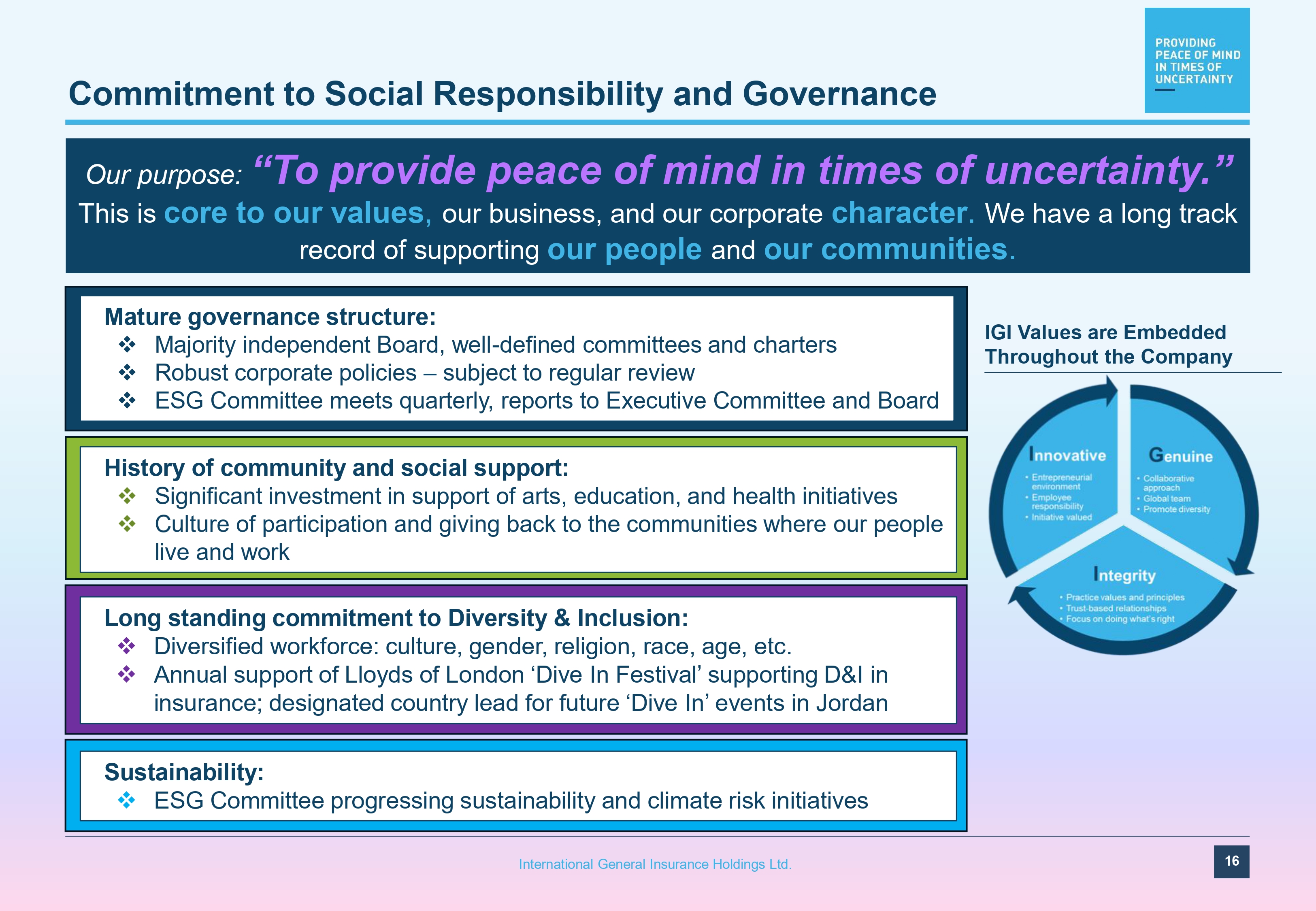 $9.30 $10.43 $10.72 $11.36 $12.17 $10.20 $11.06 $12.01 $15.45 $18.48 $10 $15 $20 12.1% 10.3% 0.1% 9.8% 7.0% 10.3% 14.3% 23.7% 28.1% 24.2% 5% 0% 10% 15% 20% 25% 30% 35% 2015 2016 2017 2018 2019 2020 2021 2022 2023 2024 Track Record of Maximizing Total Value Creation 10 Year Average Core Operating ROE 2015 – 2024 : 14.0% 10 Year CAGR* 2015 – 2024: 7.1% Core Operating Return on Average Shareholders’ Equity Public listing on Nasdaq (1) $5 $0 2015 2016 2017 2018 2019 2020 2021 2022 2023 2024 * CAGR = Compound Annual Growth Rate (1) IGI completed a business combination with Tiberius Acquisition Corp. and began trading on Nasdaq on March 18, 2020. As a result of the Business Combination, $41 million of capital was raised; in addition, IGI’s total shares outstanding were reduced causing a dilutive impact of approximately 33%. Tangible Book Value Per Share plus Dividends 15 International General Insurance Holdings Ltd.