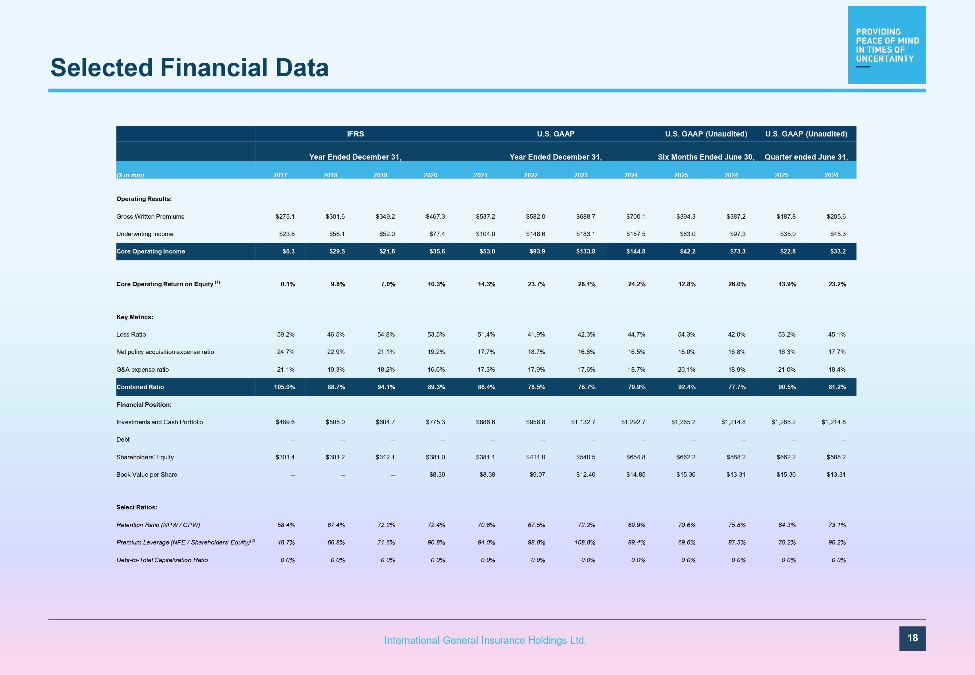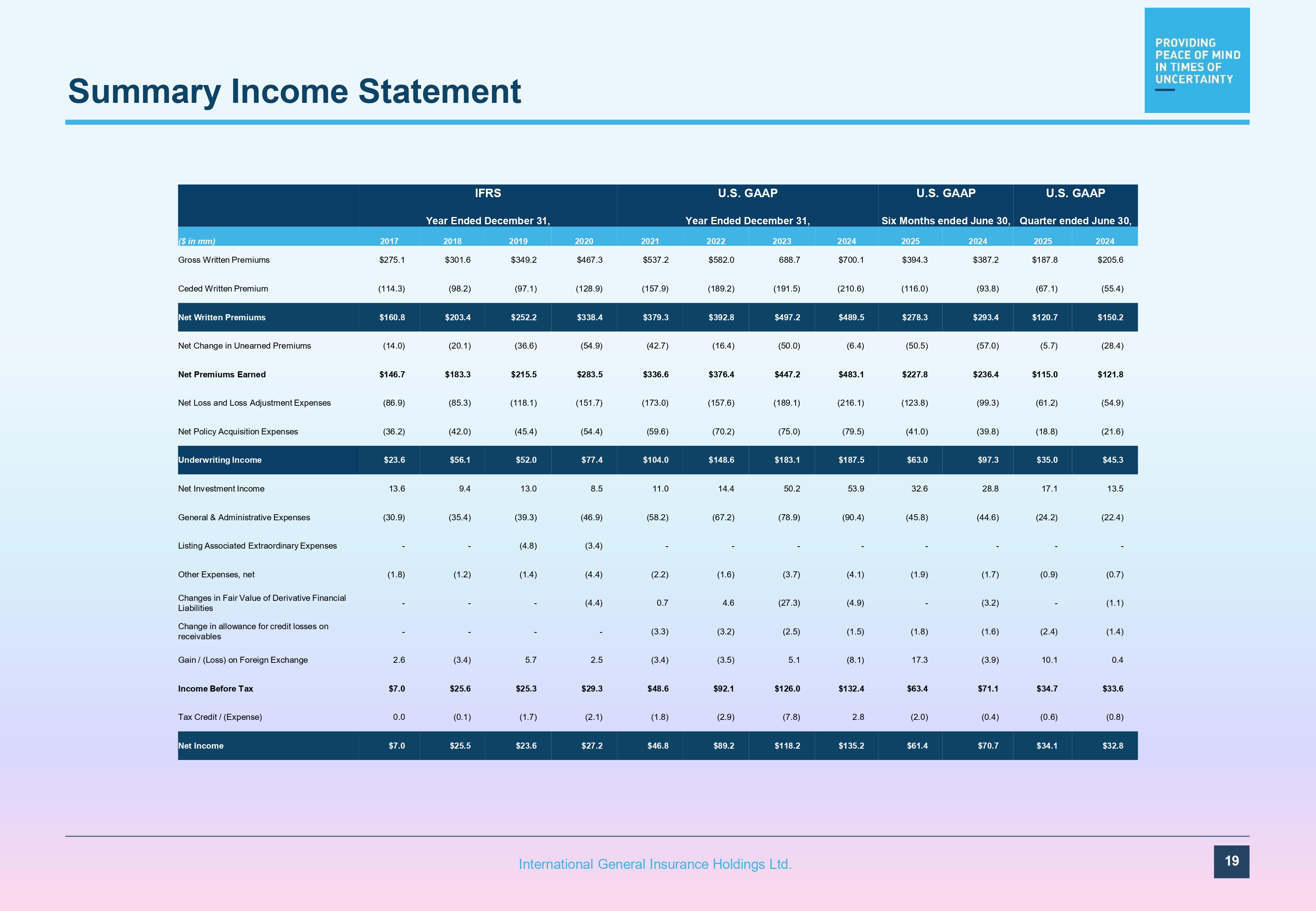 Selected Financial Data 18 International General Insurance Holdings Ltd. U.S. GAAP (Unaudited) U.S. GAAP (Unaudited) U.S. GAAP IFRS Quarter ended June 31, Six Months Ended June 30, Year Ended December 31, Year Ended December 31, 2024 2025 2024 2025 2024 2023 2022 2021 2020 2019 2018 2017 ($ in mm) Operating Results: $205.6 $187.8 $387.2 $394.3 $700.1 $688.7 $582.0 $537.2 $467.3 $349.2 $301.6 $275.1 Gross Written Premiums $45.3 $35.0 $97.3 $63.0 $187.5 $183.1 $148.6 $104.0 $77.4 $52.0 $56.1 $23.6 Underwriting Income $33.2 $22.8 $73.3 $42.2 $144.8 $133.8 $93.9 $53.0 $35.6 $21.6 $29.5 $0.3 Core Operating Income 23.2% 13.9% 26.0% 12.8% 24.2% 28.1% 23.7% 14.3% 10.3% 7.0% 9.8% 0.1% Core Operating Return on Equity (1) Key Metrics: 45.1% 53.2% 42.0% 54.3% 44.7% 42.3% 41.9% 51.4% 53.5% 54.8% 46.5% 59.2% Loss Ratio 17.7% 16.3% 16.8% 18.0% 16.5% 16.8% 18.7% 17.7% 19.2% 21.1% 22.9% 24.7% Net policy acquisition expense ratio 18.4% 21.0% 18.9% 20.1% 18.7% 17.6% 17.9% 17.3% 16.6% 18.2% 19.3% 21.1% G&A expense ratio 81.2% 90.5% 77.7% 92.4% 79.9% 76.7% 78.5% 86.4% 89.3% 94.1% 88.7% 105.0% Combined Ratio Financial Position: $1,214.8 $1,265.2 $1,214.8 $1,265.2 $1,292.7 $1,132.7 $958.8 $886.6 $775.3 $604.7 $505.0 $489.6 Investments and Cash Portfolio - - - - - - - - - - - - - - - - - - - - - - - - Debt $588.2 $662.2 $588.2 $662.2 $654.8 $540.5 $411.0 $381.1 $381.0 $312.1 $301.2 $301.4 Shareholders' Equity $13.31 $15.36 $13.31 $15.36 $14.85 $12.40 $9.07 $8.38 $8.39 - - - - - - Book Value per Share Select Ratios: 73.1% 64.3% 75.8% 70.6% 69.9% 72.2% 67.5% 70.6% 72.4% 72.2% 67.4% 58.4% Retention Ratio (NPW / GPW) 90.2% 70.2% 87.5% 69.6% 89.4% 108.8% 98.8% 94.0% 90.8% 71.6% 60.8% 48.7% Premium Leverage (NPE / Shareholders' Equity) (2) 0.0% 0.0% 0.0% 0.0% 0.0% 0.0% 0.0% 0.0% 0.0% 0.0% 0.0% 0.0% Debt - to - Total Capitalization Ratio