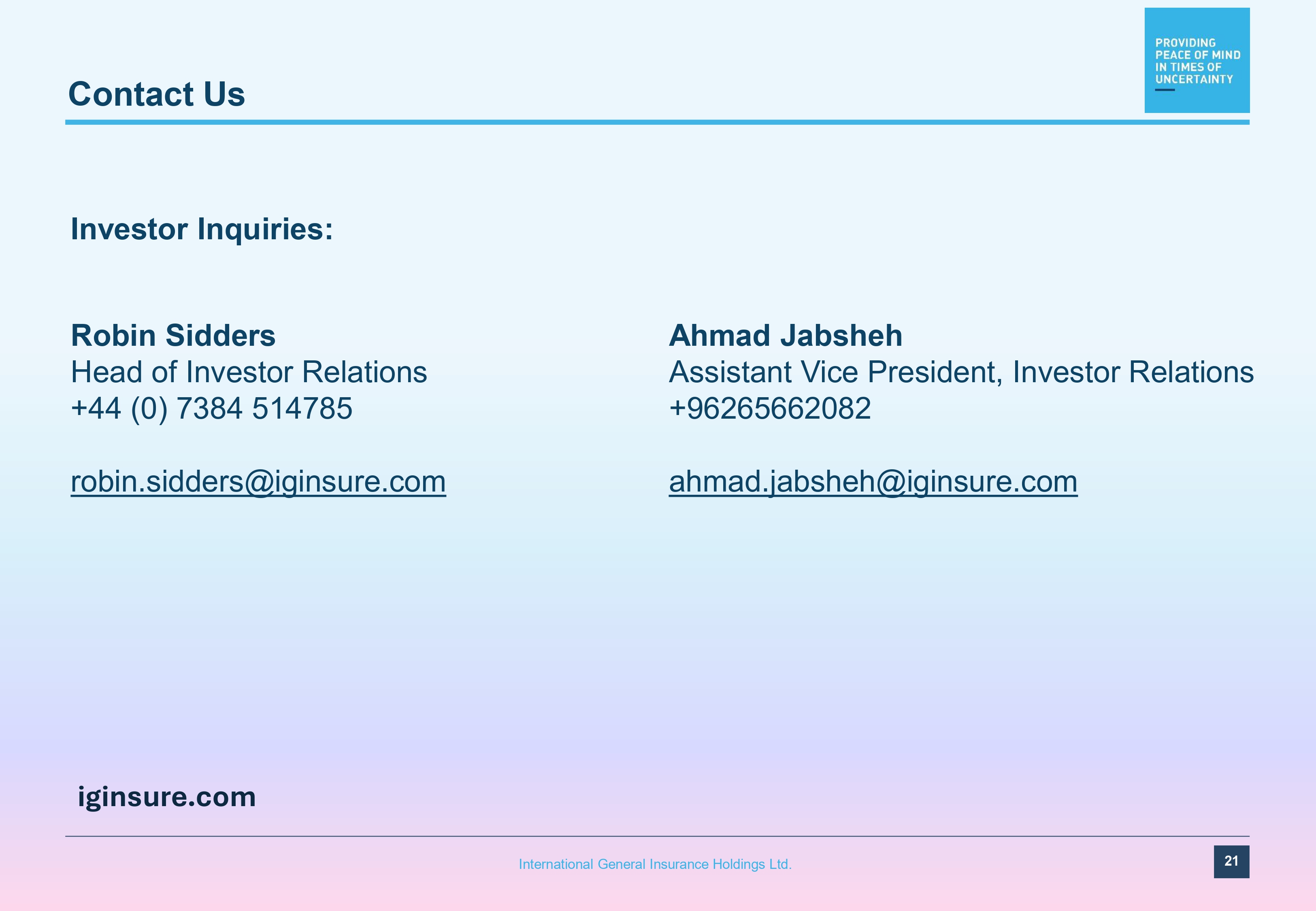 Contact Us 21 International General Insurance Holdings Ltd. Investor Inquiries: Robin Sidders Head of Investor Relations +44 (0) 7384 514785 robin.sidders@iginsure.com Ahmad Jabsheh Assistant Vice President, Investor Relations +96265662082 ahmad.jabsheh@iginsure.com iginsure.com
