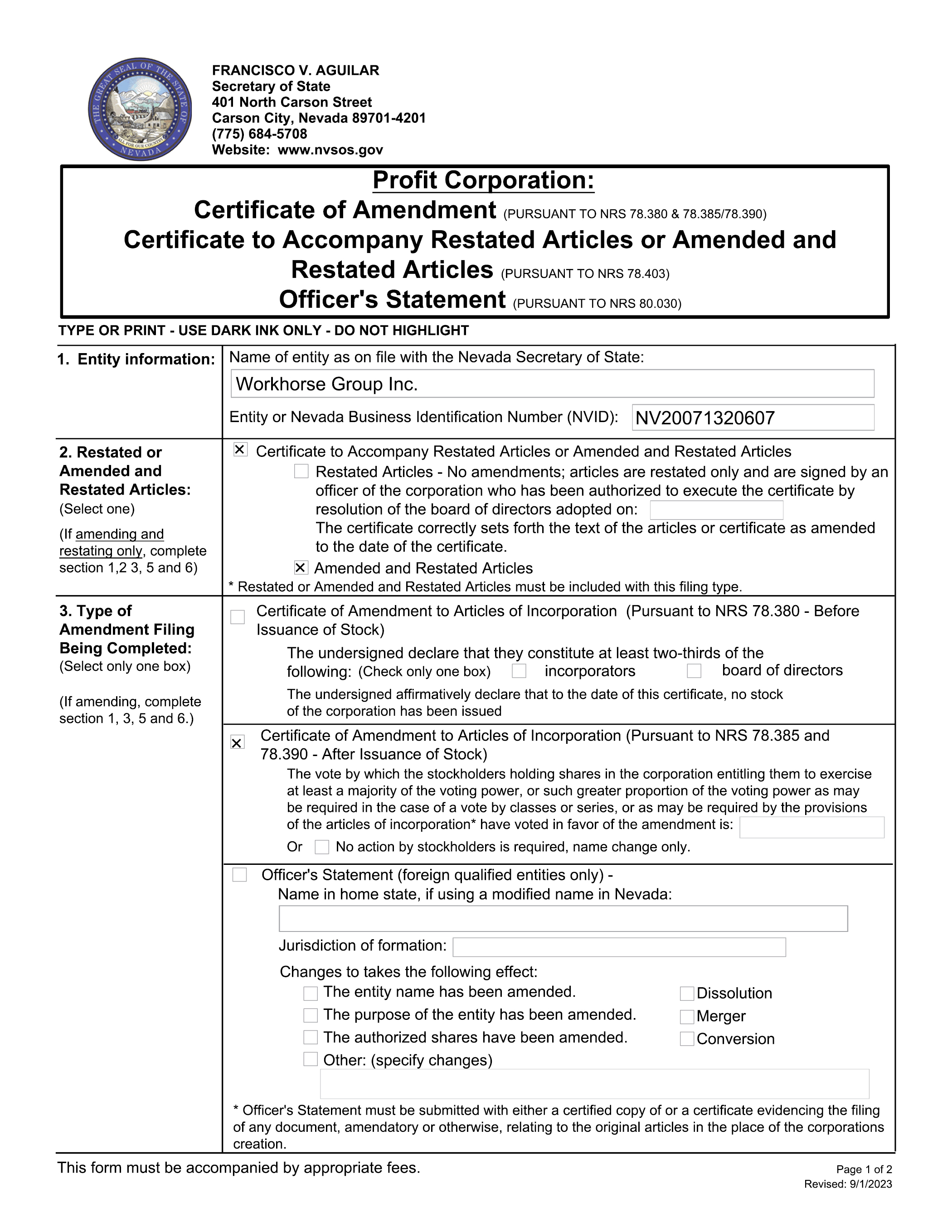 A. The undersigned is the duly elected and acting Chief Executive Officer of Workhorse Group Inc., a Nevada corporation.