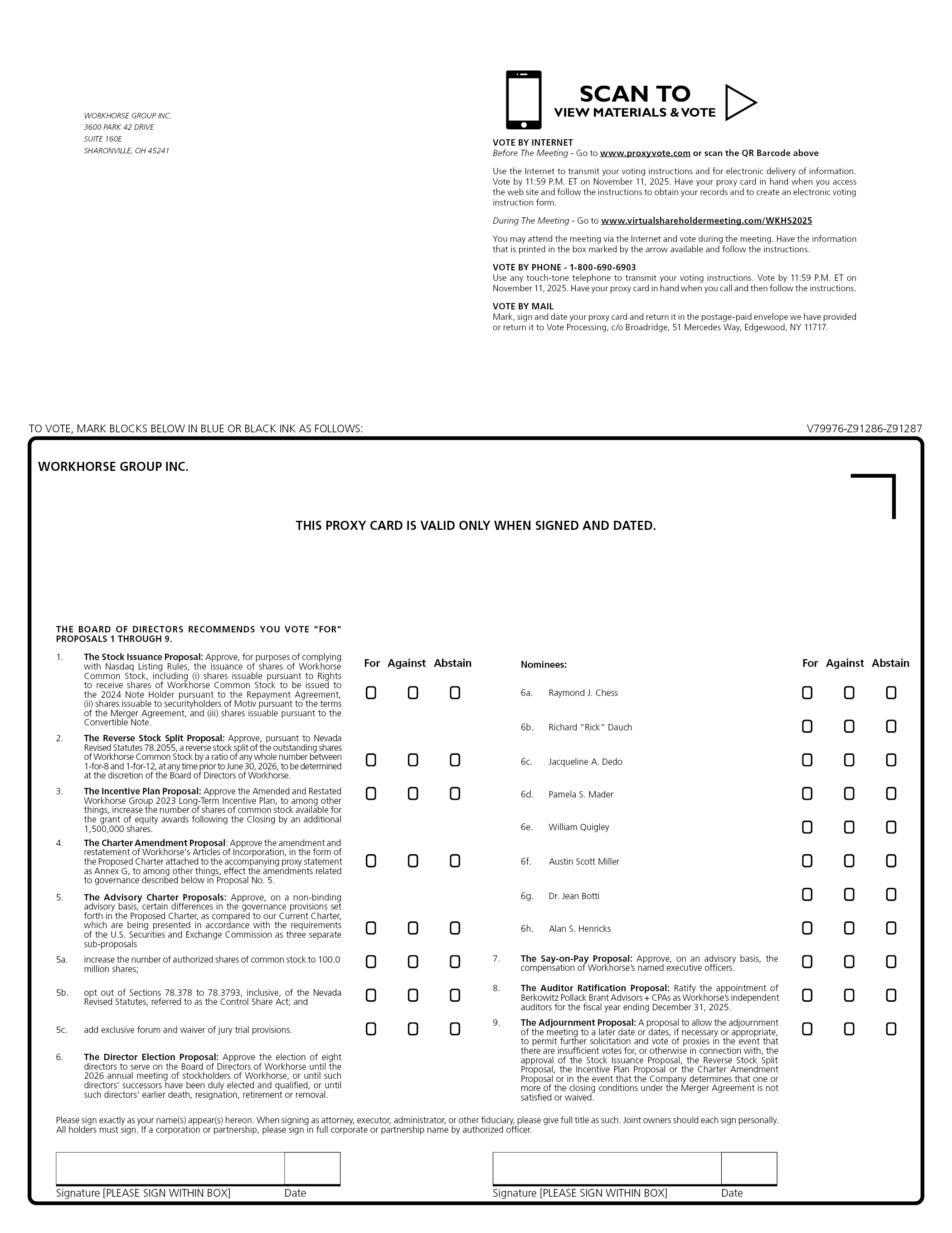 SCAN TO VIEW MATERIALS & VOTE WORKHORSE GROUP INC. 3600 PARK 42 DRIVE SUITE 160E SHARONVILLE, OH 45241 VOTE BY INTERNET Before The Meeting - Go to www.proxyvote.com or scan the QR Barcode above Use the Internet to transmit your voting instructions and for electronic delivery of information. Vote by 11:59 P.M. ET on November 11, 2025. Have your proxy card in hand when you access the web site and follow the instructions to obtain your records and to create an electronic voting instruction form. During The Meeting - Go to www.virtualshareholdermeeting.com/WKHS2025 You may attend the meeting via the Internet and vote during the meeting. Have the information that is printed in the box marked by the arrow available and follow the instructions. VOTE BY PHONE - 1-800-690-6903 Use any touch-tone telephone to transmit your voting instructions. Vote by 11:59 P.M. ET on November 11, 2025. Have your proxy card in hand when you call and then follow the instructions. VOTE BY MAIL Mark, sign and date your proxy card and return it in the postage-paid envelope we have provided or return it to Vote Processing, c/o Broadridge, 51 Mercedes Way, Edgewood, NY 11717. TO VOTE, MARK BLOCKS BELOW IN BLUE OR BLACK INK AS FOLLOWS V79976-Z91286-Z91287 WORKHORSE GROUP INC. THIS PROXY CARD IS VALID ONLY WHEN SIGNED AND DATED. THE BOARD OF DIRECTORS RECOMMENDS YOU VOTE “FOR” PROPOSALS 1 THROUGH 9. THE BOARD OF DIRECTORS RECOMMENDS YOU VOTE “FOR” PROPOSALS 1 THROUGH 9. 1. The Stock Issuance Proposal: Approve, for purposes of complying with Nasdaq Listing Rules, the issuance of shares of Workhorse Common Stock, including (i) shares issuable pursuant to Rights to receive shares of Workhorse Common Stock to be issued to the 2024 Note Holder pursuant to the Repayment Agreement, (ii) shares issuable to securityholders of Motiv pursuant to the terms of the Merger Agreement, and (iii) shares issuable pursuant to the Convertible Note. 2. The Reverse Stock Split Proposal: Approve, pursuant to Nevada Revised Statutes 78.2055, a reverse stock split of the outstanding shares of Workhorse Common Stock by a ratio of any whole number between 1-for-8 and 1-for-12, at any time prior to June 30, 2026, to be determined at the discretion of the Board of Directors of Workhorse. 3. The Incentive Plan Proposal: Approve the Amended and Restated Workhorse Group 2023 Long-Term Incentive Plan, to among other things, increase the number of shares of common stock available for the grant of equity awards following the Closing by an additional 1,500,000 shares. 4. The Charter Amendment Proposal: Approve the amendment and restatement of Workhorse’s Articles of Incorporation, in the form of the Proposed Charter attached to the accompanying proxy statement as Annex G, to among other things, effect the amendments related to governance described below in Proposal No. 5. 5. The Advisory Charter Proposals: Approve, on a non-binding advisory basis, certain differences in the governance provisions set forth in the Proposed Charter, as compared to our Current Charter, which are being presented in accordance with the requirements of the U.S. Securities and Exchange Commission as three separate sub-proposals 5a. increase the number of authorized shares of common stock to 100.0 million shares; 5b. opt out of Sections 78.378 to 78.3793, inclusive, of the Nevada Revised Statutes, referred to as the Control Share Act; and 5c. add exclusive forum and waiver of jury trial provisions. 6. The Director Election Proposal: Approve the election of eight directors to serve on the Board of Directors of Workhorse until the 2026 annual meeting of stockholders of Workhorse, or until such directors’ successors have been duly elected and qualified, or until such directors’ earlier death, resignation, retirement or removal. For, Against Abstain Nominees: 6a. Raymond J. Chess 6b. Richard “Rick” Dauch 6c. Jacqueline A. Dedo 6d. Pamela S. Mader 6e. William Quigley 6f. Austin Scott Miller 6g. Dr. Jean Botti 6h. Alan S. Henricks 7. The Say-on-Pay Proposal: Approve, on an advisory basis, the compensation of Workhorse’s named executive officers. 8. The Auditor Ratification Proposal: Ratify the appointment of Berkowitz Pollack Brant Advisors + CPAs as Workhorse’s independent auditors for the fiscal year ending December 31, 2025. 9. The Adjournment Proposal: A proposal to allow the adjournment of the meeting to a later date or dates, if necessary or appropriate, to permit further solicitation and vote of proxies in the event that there are insufficient votes for, or otherwise in connection with, the approval of the Stock Issuance Proposal, the Reverse Stock Split Proposal, the Incentive Plan Proposal or the Charter Amendment Proposal or in the event that the Company determines that one or more of the closing conditions under the Merger Agreement is not satisfied or waived. For, Against Abstain Please sign exactly as your name(s) appear(s) hereon. When signing as attorney, executor, administrator, or other fiduciary, please give full title as such. Joint owners should each sign personally. All holders must sign. If a corporation or partnership, please sign in full corporate or partnership name by authorized officer. Signature [PLEASE SIGN WITHIN BOX] Date Signature [PLEASE SIGN WITHIN BOX] Date