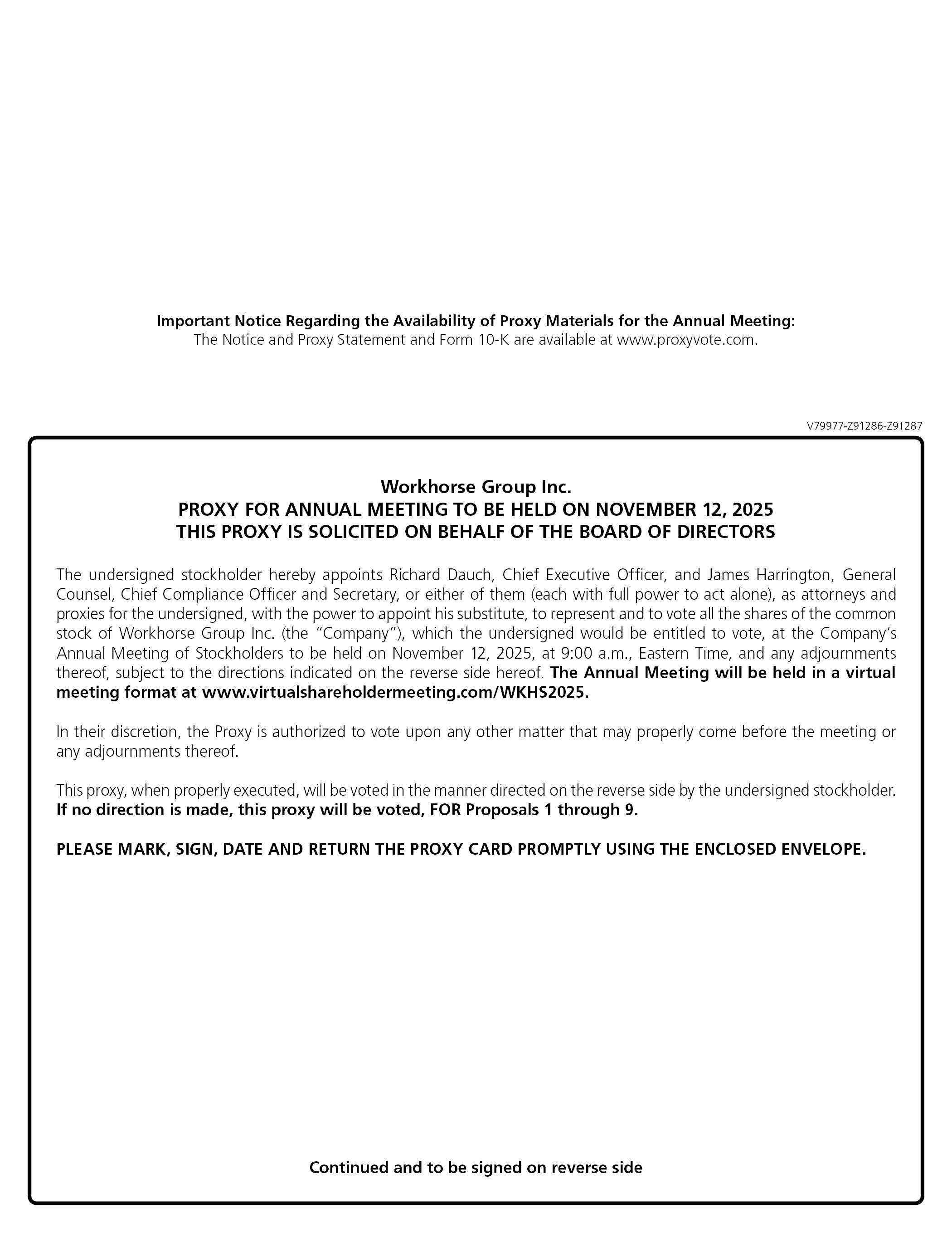 Important Notice Regarding the Availability of Proxy Materials for the Annual Meeting:The Notice and Proxy Statement and Form 10-K are available at www.proxyvote.com. V79977-Z91286-Z91287 Workhorse Group Inc. PROXY FOR ANNUAL MEETING TO BE HELD ON NOVEMBER 12, 2025 THIS PROXY IS SOLICITED ON BEHALF OF THE BOARD OF DIRECTORS The undersigned stockholder hereby appoints Richard Dauch, Chief Executive Officer, and James Harrington, General Counsel, Chief Compliance Officer and Secretary, or either of them (each with full power to act alone), as attorneys and proxies for the undersigned, with the power to appoint his substitute, to represent and to vote all the shares of the common stock of Workhorse Group Inc. (the “Company”), which the undersigned would be entitled to vote, at the Company’s Annual Meeting of Stockholders to be held on November 12, 2025, at 9:00 a.m., Eastern Time, and any adjournments thereof, subject to the directions indicated on the reverse side hereof. The Annual Meeting will be held in a virtual meeting format at www.virtualshareholdermeeting.com/WKHS2025. In their discretion, the Proxy is authorized to vote upon any other matter that may properly come before the meeting or any adjournments thereof. This proxy, when properly executed, will be voted in the manner directed on the reverse side by the undersigned stockholder. If no direction is made, this proxy will be voted, FOR Proposals 1 through 9. PLEASE MARK, SIGN, DATE AND RETURN THE PROXY CARD PROMPTLY USING THE ENCLOSED ENVELOPE. Continued and to be signed on reverse side
