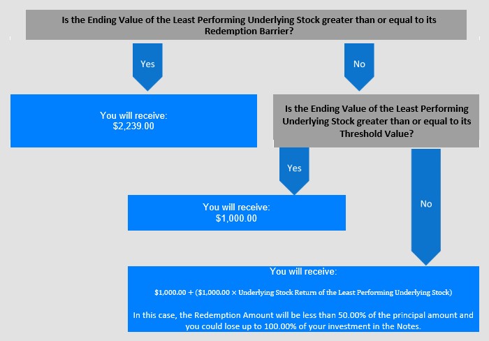 Assuming the Notes are not called prior to maturity, if the Ending Value of each Underlying Stock is greater than or equal to 100% of its Starting Value, at maturity, you will receive $2,239.00 per $1,000.00 in principal amount of your Notes.
