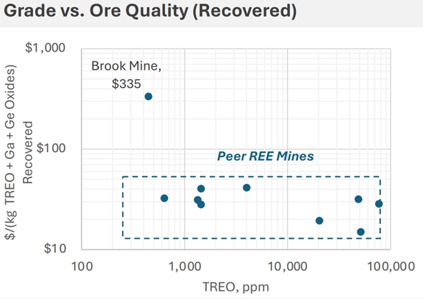 Typical hard rock deposits often include beneficiation steps to reject gangue minerals and concentrate these earth elements prior to downstream extraction processing. One of the consequences of producing a rare earth concentrate prior to extraction is recovery losses. Hard rock deposits often lose 35-45% of the rare earths to tails prior to extraction and thus, the overall recoveries are lower compared to the Brook Mine’s expected flowsheet. Therefore, the recovered value per TREO grade is further diminished compared to the unconventional Brook Mine deposit.