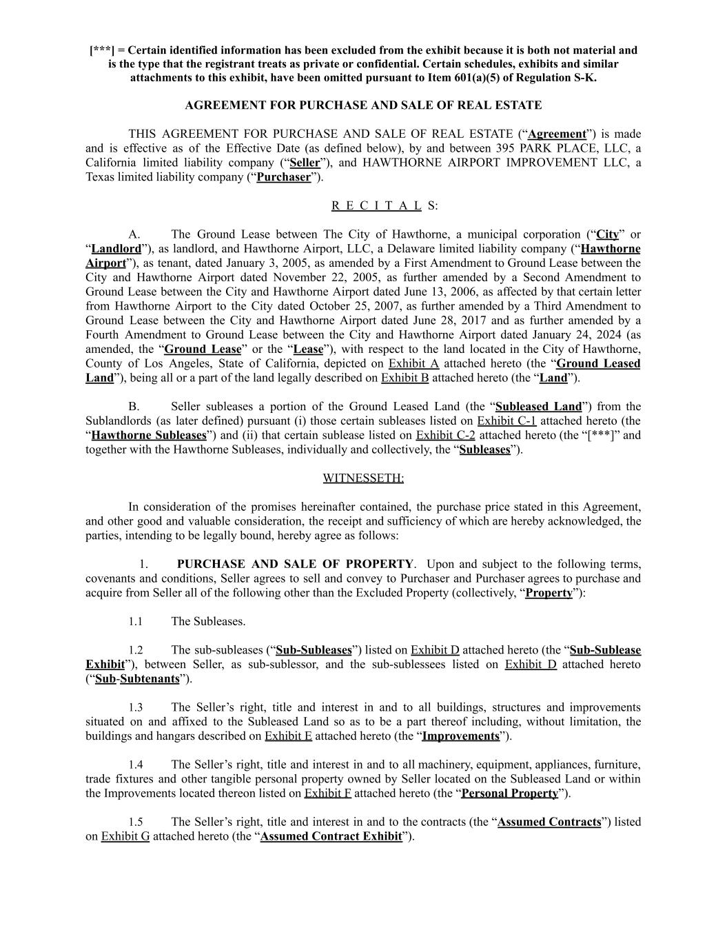 [***] = Certain identified information has been excluded from the exhibit because it is both not material and is the type that the registrant treats as private or confidential. Certain schedules, exhibits and similar attachments to this exhibit, have been omitted pursuant to Item 601(a)(5) of Regulation S-K. AGREEMENT FOR PURCHASE AND SALE OF REAL ESTATE THIS AGREEMENT FOR PURCHASE AND SALE OF REAL ESTATE (“Agreement”) is made and is effective as of the Effective Date (as defined below), by and between 395 PARK PLACE, LLC, a California limited liability company (“Seller”), and HAWTHORNE AIRPORT IMPROVEMENT LLC, a Texas limited liability company (“Purchaser”). R E C I T A L S: A.​ The Ground Lease between The City of Hawthorne, a municipal corporation (“City” or “Landlord”), as landlord, and Hawthorne Airport, LLC, a Delaware limited liability company (“Hawthorne Airport”), as tenant, dated January 3, 2005, as amended by a First Amendment to Ground Lease between the City and Hawthorne Airport dated November 22, 2005, as further amended by a Second Amendment to Ground Lease between the City and Hawthorne Airport dated June 13, 2006, as affected by that certain letter from Hawthorne Airport to the City dated October 25, 2007, as further amended by a Third Amendment to Ground Lease between the City and Hawthorne Airport dated June 28, 2017 and as further amended by a Fourth Amendment to Ground Lease between the City and Hawthorne Airport dated January 24, 2024 (as amended, the “Ground Lease” or the “Lease”), with respect to the land located in the City of Hawthorne, County of Los Angeles, State of California, depicted on Exhibit A attached hereto (the “Ground Leased Land”), being all or a part of the land legally described on Exhibit B attached hereto (the “Land”). B.​ Seller subleases a portion of the Ground Leased Land (the “Subleased Land”) from the Sublandlords (as later defined) pursuant (i) those certain subleases listed on Exhibit C-1 attached hereto (the “Hawthorne Subleases”) and (ii) that certain sublease listed on Exhibit C-2 attached hereto (the “[***]” and together with the Hawthorne Subleases, individually and collectively, the “Subleases”). WITNESSETH: In consideration of the promises hereinafter contained, the purchase price stated in this Agreement, and other good and valuable consideration, the receipt and sufficiency of which are hereby acknowledged, the parties, intending to be legally bound, hereby agree as follows: 1.​ PURCHASE AND SALE OF PROPERTY. Upon and subject to the following terms, covenants and conditions, Seller agrees to sell and convey to Purchaser and Purchaser agrees to purchase and acquire from Seller all of the following other than the Excluded Property (collectively, “Property”): 1.1​ The Subleases. 1.2​ The sub-subleases (“Sub-Subleases”) listed on Exhibit D attached hereto (the “Sub-Sublease Exhibit”), between Seller, as sub-sublessor, and the sub-sublessees listed on Exhibit D attached hereto (“Sub-Subtenants”). 1.3​ The Seller’s right, title and interest in and to all buildings, structures and improvements situated on and affixed to the Subleased Land so as to be a part thereof including, without limitation, the buildings and hangars described on Exhibit E attached hereto (the “Improvements”). 1.4​ The Seller’s right, title and interest in and to all machinery, equipment, appliances, furniture, trade fixtures and other tangible personal property owned by Seller located on the Subleased Land or within the Improvements located thereon listed on Exhibit F attached hereto (the “Personal Property”). 1.5​ The Seller’s right, title and interest in and to the contracts (the “Assumed Contracts”) listed on Exhibit G attached hereto (the “Assumed Contract Exhibit”).