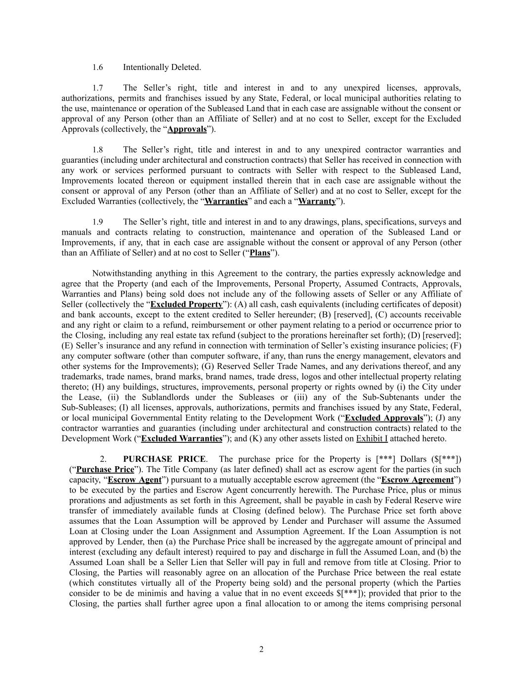 1.6​ Intentionally Deleted. 1.7​ The Seller’s right, title and interest in and to any unexpired licenses, approvals, authorizations, permits and franchises issued by any State, Federal, or local municipal authorities relating to the use, maintenance or operation of the Subleased Land that in each case are assignable without the consent or approval of any Person (other than an Affiliate of Seller) and at no cost to Seller, except for the Excluded Approvals (collectively, the “Approvals”). 1.8​ The Seller’s right, title and interest in and to any unexpired contractor warranties and guaranties (including under architectural and construction contracts) that Seller has received in connection with any work or services performed pursuant to contracts with Seller with respect to the Subleased Land, Improvements located thereon or equipment installed therein that in each case are assignable without the consent or approval of any Person (other than an Affiliate of Seller) and at no cost to Seller, except for the Excluded Warranties (collectively, the “Warranties” and each a “Warranty”). 1.9​ The Seller’s right, title and interest in and to any drawings, plans, specifications, surveys and manuals and contracts relating to construction, maintenance and operation of the Subleased Land or Improvements, if any, that in each case are assignable without the consent or approval of any Person (other than an Affiliate of Seller) and at no cost to Seller (“Plans”). Notwithstanding anything in this Agreement to the contrary, the parties expressly acknowledge and agree that the Property (and each of the Improvements, Personal Property, Assumed Contracts, Approvals, Warranties and Plans) being sold does not include any of the following assets of Seller or any Affiliate of Seller (collectively the “Excluded Property”): (A) all cash, cash equivalents (including certificates of deposit) and bank accounts, except to the extent credited to Seller hereunder; (B) [reserved], (C) accounts receivable and any right or claim to a refund, reimbursement or other payment relating to a period or occurrence prior to the Closing, including any real estate tax refund (subject to the prorations hereinafter set forth); (D) [reserved]; (E) Seller’s insurance and any refund in connection with termination of Seller’s existing insurance policies; (F) any computer software (other than computer software, if any, than runs the energy management, elevators and other systems for the Improvements); (G) Reserved Seller Trade Names, and any derivations thereof, and any trademarks, trade names, brand marks, brand names, trade dress, logos and other intellectual property relating thereto; (H) any buildings, structures, improvements, personal property or rights owned by (i) the City under the Lease, (ii) the Sublandlords under the Subleases or (iii) any of the Sub-Subtenants under the Sub-Subleases; (I) all licenses, approvals, authorizations, permits and franchises issued by any State, Federal, or local municipal Governmental Entity relating to the Development Work (“Excluded Approvals”); (J) any contractor warranties and guaranties (including under architectural and construction contracts) related to the Development Work (“Excluded Warranties”); and (K) any other assets listed on Exhibit I attached hereto. 2.​ PURCHASE PRICE. The purchase price for the Property is [***] Dollars ($[***]) (“Purchase Price”). The Title Company (as later defined) shall act as escrow agent for the parties (in such capacity, “Escrow Agent”) pursuant to a mutually acceptable escrow agreement (the “Escrow Agreement”) to be executed by the parties and Escrow Agent concurrently herewith. The Purchase Price, plus or minus prorations and adjustments as set forth in this Agreement, shall be payable in cash by Federal Reserve wire transfer of immediately available funds at Closing (defined below). The Purchase Price set forth above assumes that the Loan Assumption will be approved by Lender and Purchaser will assume the Assumed Loan at Closing under the Loan Assignment and Assumption Agreement. If the Loan Assumption is not approved by Lender, then (a) the Purchase Price shall be increased by the aggregate amount of principal and interest (excluding any default interest) required to pay and discharge in full the Assumed Loan, and (b) the Assumed Loan shall be a Seller Lien that Seller will pay in full and remove from title at Closing. Prior to Closing, the Parties will reasonably agree on an allocation of the Purchase Price between the real estate (which constitutes virtually all of the Property being sold) and the personal property (which the Parties consider to be de minimis and having a value that in no event exceeds $[***]); provided that prior to the Closing, the parties shall further agree upon a final allocation to or among the items comprising personal 2