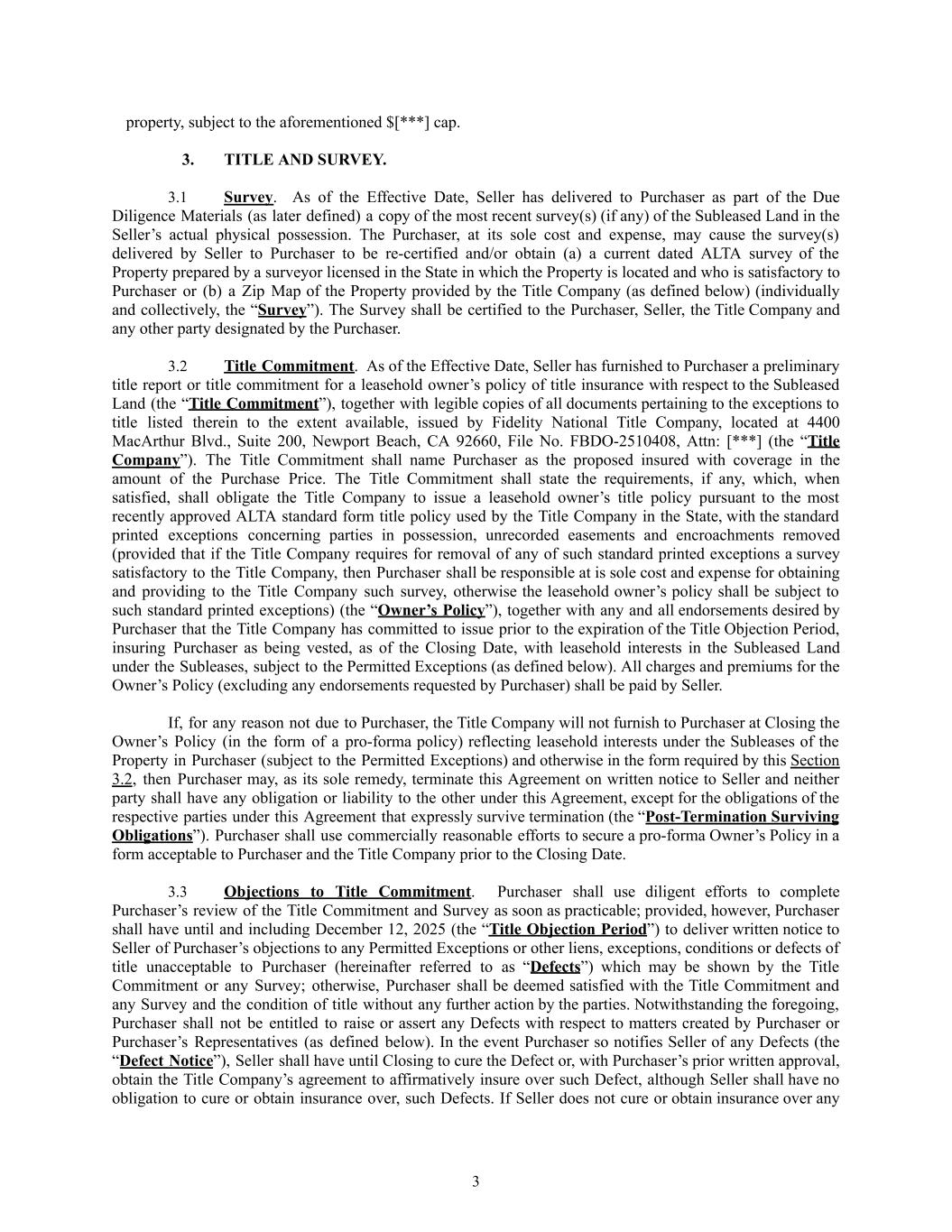 property, subject to the aforementioned $[***] cap. 3.​ TITLE AND SURVEY. 3.1​ Survey. As of the Effective Date, Seller has delivered to Purchaser as part of the Due Diligence Materials (as later defined) a copy of the most recent survey(s) (if any) of the Subleased Land in the Seller’s actual physical possession. The Purchaser, at its sole cost and expense, may cause the survey(s) delivered by Seller to Purchaser to be re-certified and/or obtain (a) a current dated ALTA survey of the Property prepared by a surveyor licensed in the State in which the Property is located and who is satisfactory to Purchaser or (b) a Zip Map of the Property provided by the Title Company (as defined below) (individually and collectively, the “Survey”). The Survey shall be certified to the Purchaser, Seller, the Title Company and any other party designated by the Purchaser. 3.2​ Title Commitment. As of the Effective Date, Seller has furnished to Purchaser a preliminary title report or title commitment for a leasehold owner’s policy of title insurance with respect to the Subleased Land (the “Title Commitment”), together with legible copies of all documents pertaining to the exceptions to title listed therein to the extent available, issued by Fidelity National Title Company, located at 4400 MacArthur Blvd., Suite 200, Newport Beach, CA 92660, File No. FBDO-2510408, Attn: [***] (the “Title Company”). The Title Commitment shall name Purchaser as the proposed insured with coverage in the amount of the Purchase Price. The Title Commitment shall state the requirements, if any, which, when satisfied, shall obligate the Title Company to issue a leasehold owner’s title policy pursuant to the most recently approved ALTA standard form title policy used by the Title Company in the State, with the standard printed exceptions concerning parties in possession, unrecorded easements and encroachments removed (provided that if the Title Company requires for removal of any of such standard printed exceptions a survey satisfactory to the Title Company, then Purchaser shall be responsible at is sole cost and expense for obtaining and providing to the Title Company such survey, otherwise the leasehold owner’s policy shall be subject to such standard printed exceptions) (the “Owner’s Policy”), together with any and all endorsements desired by Purchaser that the Title Company has committed to issue prior to the expiration of the Title Objection Period, insuring Purchaser as being vested, as of the Closing Date, with leasehold interests in the Subleased Land under the Subleases, subject to the Permitted Exceptions (as defined below). All charges and premiums for the Owner’s Policy (excluding any endorsements requested by Purchaser) shall be paid by Seller. If, for any reason not due to Purchaser, the Title Company will not furnish to Purchaser at Closing the Owner’s Policy (in the form of a pro-forma policy) reflecting leasehold interests under the Subleases of the Property in Purchaser (subject to the Permitted Exceptions) and otherwise in the form required by this Section 3.2, then Purchaser may, as its sole remedy, terminate this Agreement on written notice to Seller and neither party shall have any obligation or liability to the other under this Agreement, except for the obligations of the respective parties under this Agreement that expressly survive termination (the “Post-Termination Surviving Obligations”). Purchaser shall use commercially reasonable efforts to secure a pro-forma Owner’s Policy in a form acceptable to Purchaser and the Title Company prior to the Closing Date. 3.3​ Objections to Title Commitment. Purchaser shall use diligent efforts to complete Purchaser’s review of the Title Commitment and Survey as soon as practicable; provided, however, Purchaser shall have until and including December 12, 2025 (the “Title Objection Period”) to deliver written notice to Seller of Purchaser’s objections to any Permitted Exceptions or other liens, exceptions, conditions or defects of title unacceptable to Purchaser (hereinafter referred to as “Defects”) which may be shown by the Title Commitment or any Survey; otherwise, Purchaser shall be deemed satisfied with the Title Commitment and any Survey and the condition of title without any further action by the parties. Notwithstanding the foregoing, Purchaser shall not be entitled to raise or assert any Defects with respect to matters created by Purchaser or Purchaser’s Representatives (as defined below). In the event Purchaser so notifies Seller of any Defects (the “Defect Notice”), Seller shall have until Closing to cure the Defect or, with Purchaser’s prior written approval, obtain the Title Company’s agreement to affirmatively insure over such Defect, although Seller shall have no obligation to cure or obtain insurance over, such Defects. If Seller does not cure or obtain insurance over any 3