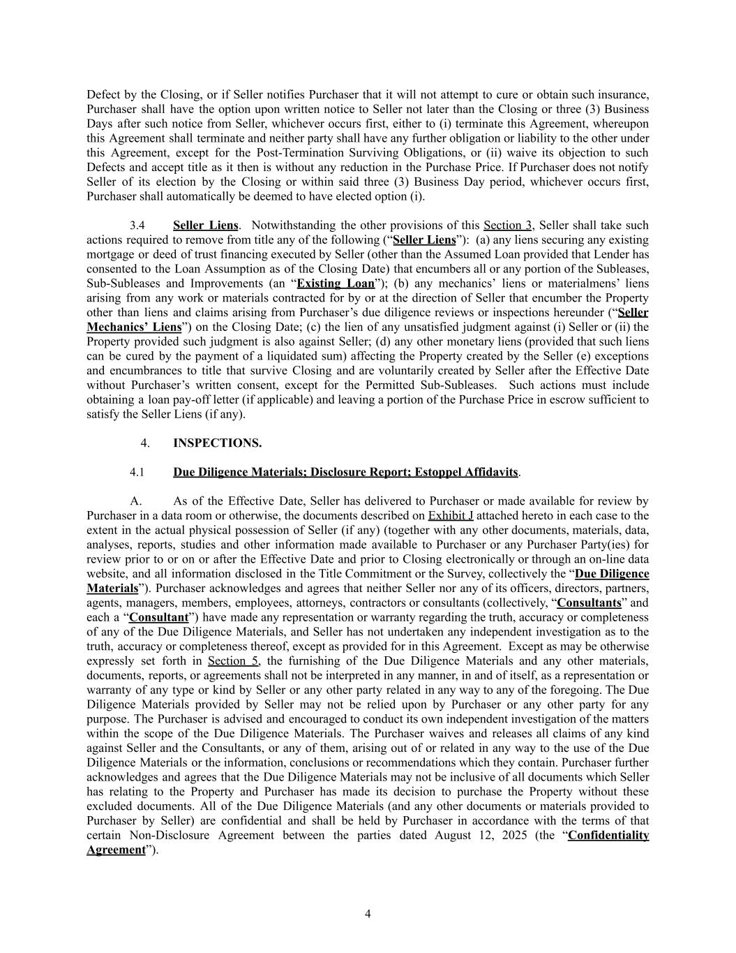 Defect by the Closing, or if Seller notifies Purchaser that it will not attempt to cure or obtain such insurance, Purchaser shall have the option upon written notice to Seller not later than the Closing or three (3) Business Days after such notice from Seller, whichever occurs first, either to (i) terminate this Agreement, whereupon this Agreement shall terminate and neither party shall have any further obligation or liability to the other under this Agreement, except for the Post-Termination Surviving Obligations, or (ii) waive its objection to such Defects and accept title as it then is without any reduction in the Purchase Price. If Purchaser does not notify Seller of its election by the Closing or within said three (3) Business Day period, whichever occurs first, Purchaser shall automatically be deemed to have elected option (i). 3.4​ Seller Liens. Notwithstanding the other provisions of this Section 3, Seller shall take such actions required to remove from title any of the following (“Seller Liens”): (a) any liens securing any existing mortgage or deed of trust financing executed by Seller (other than the Assumed Loan provided that Lender has consented to the Loan Assumption as of the Closing Date) that encumbers all or any portion of the Subleases, Sub-Subleases and Improvements (an “Existing Loan”); (b) any mechanics’ liens or materialmens’ liens arising from any work or materials contracted for by or at the direction of Seller that encumber the Property other than liens and claims arising from Purchaser’s due diligence reviews or inspections hereunder (“Seller Mechanics’ Liens”) on the Closing Date; (c) the lien of any unsatisfied judgment against (i) Seller or (ii) the Property provided such judgment is also against Seller; (d) any other monetary liens (provided that such liens can be cured by the payment of a liquidated sum) affecting the Property created by the Seller (e) exceptions and encumbrances to title that survive Closing and are voluntarily created by Seller after the Effective Date without Purchaser’s written consent, except for the Permitted Sub-Subleases. Such actions must include obtaining a loan pay-off letter (if applicable) and leaving a portion of the Purchase Price in escrow sufficient to satisfy the Seller Liens (if any). 4.​ INSPECTIONS. 4.1​ Due Diligence Materials; Disclosure Report; Estoppel Affidavits. A.​ As of the Effective Date, Seller has delivered to Purchaser or made available for review by Purchaser in a data room or otherwise, the documents described on Exhibit J attached hereto in each case to the extent in the actual physical possession of Seller (if any) (together with any other documents, materials, data, analyses, reports, studies and other information made available to Purchaser or any Purchaser Party(ies) for review prior to or on or after the Effective Date and prior to Closing electronically or through an on-line data website, and all information disclosed in the Title Commitment or the Survey, collectively the “Due Diligence Materials”). Purchaser acknowledges and agrees that neither Seller nor any of its officers, directors, partners, agents, managers, members, employees, attorneys, contractors or consultants (collectively, “Consultants” and each a “Consultant”) have made any representation or warranty regarding the truth, accuracy or completeness of any of the Due Diligence Materials, and Seller has not undertaken any independent investigation as to the truth, accuracy or completeness thereof, except as provided for in this Agreement. Except as may be otherwise expressly set forth in Section 5, the furnishing of the Due Diligence Materials and any other materials, documents, reports, or agreements shall not be interpreted in any manner, in and of itself, as a representation or warranty of any type or kind by Seller or any other party related in any way to any of the foregoing. The Due Diligence Materials provided by Seller may not be relied upon by Purchaser or any other party for any purpose. The Purchaser is advised and encouraged to conduct its own independent investigation of the matters within the scope of the Due Diligence Materials. The Purchaser waives and releases all claims of any kind against Seller and the Consultants, or any of them, arising out of or related in any way to the use of the Due Diligence Materials or the information, conclusions or recommendations which they contain. Purchaser further acknowledges and agrees that the Due Diligence Materials may not be inclusive of all documents which Seller has relating to the Property and Purchaser has made its decision to purchase the Property without these excluded documents. All of the Due Diligence Materials (and any other documents or materials provided to Purchaser by Seller) are confidential and shall be held by Purchaser in accordance with the terms of that certain Non-Disclosure Agreement between the parties dated August 12, 2025 (the “Confidentiality Agreement”). 4