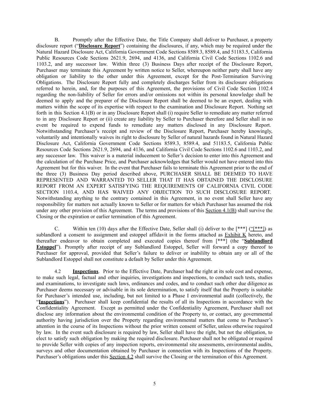 B.​ Promptly after the Effective Date, the Title Company shall deliver to Purchaser, a property disclosure report (“Disclosure Report”) containing the disclosures, if any, which may be required under the Natural Hazard Disclosure Act, California Government Code Sections 8589.3, 8589.4, and 51183.5, California Public Resources Code Sections 2621.9, 2694, and 4136, and California Civil Code Sections 1102.6 and 1103.2, and any successor law.  Within three (3) Business Days after receipt of the Disclosure Report, Purchaser may terminate this Agreement by written notice to Seller, whereupon neither party shall have any obligation or liability to the other under this Agreement, except for the Post-Termination Surviving Obligations.  The Disclosure Report fully and completely discharges Seller from its disclosure obligations referred to herein, and, for the purposes of this Agreement, the provisions of Civil Code Section 1102.4 regarding the non-liability of Seller for errors and/or omissions not within its personal knowledge shall be deemed to apply and the preparer of the Disclosure Report shall be deemed to be an expert, dealing with matters within the scope of its expertise with respect to the examination and Disclosure Report.  Nothing set forth in this Section 4.1(B) or in any Disclosure Report shall (i) require Seller to remediate any matter referred to in any Disclosure Report or (ii) create any liability by Seller to Purchaser therefore and Seller shall in no event be required to expend funds to remediate any matters disclosed in any Disclosure Report.  Notwithstanding Purchaser’s receipt and review of the Disclosure Report, Purchaser hereby knowingly, voluntarily and intentionally waives its right to disclosure by Seller of natural hazards found in Natural Hazard Disclosure Act, California Government Code Sections 8589.3, 8589.4, and 51183.5, California Public Resources Code Sections 2621.9, 2694, and 4136, and California Civil Code Sections 1102.6 and 1103.2, and any successor law.  This waiver is a material inducement to Seller’s decision to enter into this Agreement and the calculation of the Purchase Price, and Purchaser acknowledges that Seller would not have entered into this Agreement but for this waiver.  In the event that Purchaser fails to terminate this Agreement prior to the end of the three (3) Business Day period described above, PURCHASER SHALL BE DEEMED TO HAVE REPRESENTED AND WARRANTED TO SELLER THAT IT HAS OBTAINED THE DISCLOSURE REPORT FROM AN EXPERT SATISFYING THE REQUIREMENTS OF CALIFORNIA CIVIL CODE SECTION 1103.4, AND HAS WAIVED ANY OBJECTION TO SUCH DISCLOSURE REPORT.  Notwithstanding anything to the contrary contained in this Agreement, in no event shall Seller have any responsibility for matters not actually known to Seller or for matters for which Purchaser has assumed the risk under any other provision of this Agreement.  The terms and provisions of this Section 4.1(B) shall survive the Closing or the expiration or earlier termination of this Agreement. C.​ Within ten (10) days after the Effective Date, Seller shall (i) deliver to the [***] (“[***]) as sublandlord a consent to assignment and estoppel affidavit in the forms attached as Exhibit K hereto, and thereafter endeavor to obtain completed and executed copies thereof from [***] (the “Sublandlord Estoppel”). Promptly after receipt of any Sublandlord Estoppel, Seller will forward a copy thereof to Purchaser for approval, provided that Seller’s failure to deliver or inabililty to obtain any or all of the Sublandlord Estoppel shall not constitute a default by Seller under this Agreement. 4.2​ Inspections. Prior to the Effective Date, Purchaser had the right at its sole cost and expense, to make such legal, factual and other inquiries, investigations and inspections, to conduct such tests, studies and examinations, to investigate such laws, ordinances and codes, and to conduct such other due diligence as Purchaser deems necessary or advisable in its sole determination, to satisfy itself that the Property is suitable for Purchaser’s intended use, including, but not limited to a Phase I environmental audit (collectively, the “Inspections”). Purchaser shall keep confidential the results of all its Inspections in accordance with the Confidentiality Agreement. Except as permitted under the Confidentiality Agreement, Purchaser shall not disclose any information about the environmental condition of the Property to, or contact, any governmental authority having jurisdiction over the Property regarding environmental matters that come to Purchaser’s attention in the course of its Inspections without the prior written consent of Seller, unless otherwise required by law. In the event such disclosure is required by law, Seller shall have the right, but not the obligation, to elect to satisfy such obligation by making the required disclosure. Purchaser shall not be obligated or required to provide Seller with copies of any inspection reports, environmental site assessments, environmental audits, surveys and other documentation obtained by Purchaser in connection with its Inspections of the Property. Purchaser’s obligations under this Section 4.2 shall survive the Closing or the termination of this Agreement. 5