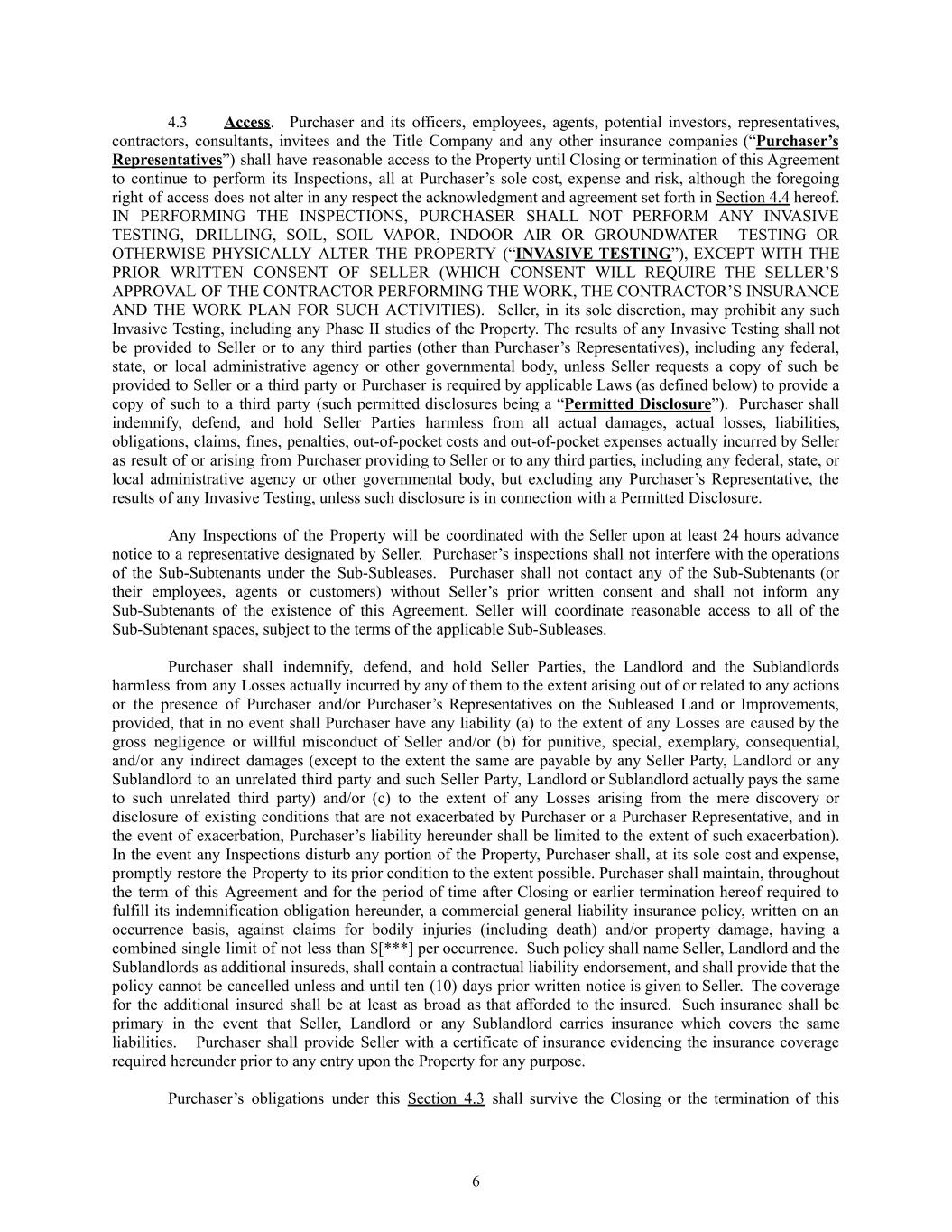 4.3​ Access. Purchaser and its officers, employees, agents, potential investors, representatives, contractors, consultants, invitees and the Title Company and any other insurance companies (“Purchaser’s Representatives”) shall have reasonable access to the Property until Closing or termination of this Agreement to continue to perform its Inspections, all at Purchaser’s sole cost, expense and risk, although the foregoing right of access does not alter in any respect the acknowledgment and agreement set forth in Section 4.4 hereof. IN PERFORMING THE INSPECTIONS, PURCHASER SHALL NOT PERFORM ANY INVASIVE TESTING, DRILLING, SOIL, SOIL VAPOR, INDOOR AIR OR GROUNDWATER TESTING OR OTHERWISE PHYSICALLY ALTER THE PROPERTY (“INVASIVE TESTING”), EXCEPT WITH THE PRIOR WRITTEN CONSENT OF SELLER (WHICH CONSENT WILL REQUIRE THE SELLER’S APPROVAL OF THE CONTRACTOR PERFORMING THE WORK, THE CONTRACTOR’S INSURANCE AND THE WORK PLAN FOR SUCH ACTIVITIES). Seller, in its sole discretion, may prohibit any such Invasive Testing, including any Phase II studies of the Property. The results of any Invasive Testing shall not be provided to Seller or to any third parties (other than Purchaser’s Representatives), including any federal, state, or local administrative agency or other governmental body, unless Seller requests a copy of such be provided to Seller or a third party or Purchaser is required by applicable Laws (as defined below) to provide a copy of such to a third party (such permitted disclosures being a “Permitted Disclosure”). Purchaser shall indemnify, defend, and hold Seller Parties harmless from all actual damages, actual losses, liabilities, obligations, claims, fines, penalties, out-of-pocket costs and out-of-pocket expenses actually incurred by Seller as result of or arising from Purchaser providing to Seller or to any third parties, including any federal, state, or local administrative agency or other governmental body, but excluding any Purchaser’s Representative, the results of any Invasive Testing, unless such disclosure is in connection with a Permitted Disclosure. Any Inspections of the Property will be coordinated with the Seller upon at least 24 hours advance notice to a representative designated by Seller. Purchaser’s inspections shall not interfere with the operations of the Sub-Subtenants under the Sub-Subleases. Purchaser shall not contact any of the Sub-Subtenants (or their employees, agents or customers) without Seller’s prior written consent and shall not inform any Sub-Subtenants of the existence of this Agreement. Seller will coordinate reasonable access to all of the Sub-Subtenant spaces, subject to the terms of the applicable Sub-Subleases. Purchaser shall indemnify, defend, and hold Seller Parties, the Landlord and the Sublandlords harmless from any Losses actually incurred by any of them to the extent arising out of or related to any actions or the presence of Purchaser and/or Purchaser’s Representatives on the Subleased Land or Improvements, provided, that in no event shall Purchaser have any liability (a) to the extent of any Losses are caused by the gross negligence or willful misconduct of Seller and/or (b) for punitive, special, exemplary, consequential, and/or any indirect damages (except to the extent the same are payable by any Seller Party, Landlord or any Sublandlord to an unrelated third party and such Seller Party, Landlord or Sublandlord actually pays the same to such unrelated third party) and/or (c) to the extent of any Losses arising from the mere discovery or disclosure of existing conditions that are not exacerbated by Purchaser or a Purchaser Representative, and in the event of exacerbation, Purchaser’s liability hereunder shall be limited to the extent of such exacerbation). In the event any Inspections disturb any portion of the Property, Purchaser shall, at its sole cost and expense, promptly restore the Property to its prior condition to the extent possible. Purchaser shall maintain, throughout the term of this Agreement and for the period of time after Closing or earlier termination hereof required to fulfill its indemnification obligation hereunder, a commercial general liability insurance policy, written on an occurrence basis, against claims for bodily injuries (including death) and/or property damage, having a combined single limit of not less than $[***] per occurrence. Such policy shall name Seller, Landlord and the Sublandlords as additional insureds, shall contain a contractual liability endorsement, and shall provide that the policy cannot be cancelled unless and until ten (10) days prior written notice is given to Seller. The coverage for the additional insured shall be at least as broad as that afforded to the insured. Such insurance shall be primary in the event that Seller, Landlord or any Sublandlord carries insurance which covers the same liabilities. Purchaser shall provide Seller with a certificate of insurance evidencing the insurance coverage required hereunder prior to any entry upon the Property for any purpose. Purchaser’s obligations under this Section 4.3 shall survive the Closing or the termination of this 6