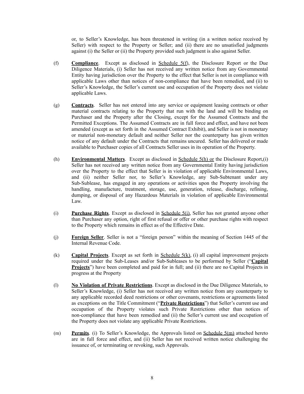 or, to Seller’s Knowledge, has been threatened in writing (in a written notice received by Seller) with respect to the Property or Seller; and (ii) there are no unsatisfied judgments against (i) the Seller or (ii) the Property provided such judgment is also against Seller. (f)​ Compliance. Except as disclosed in Schedule 5(f), the Disclosure Report or the Due Diligence Materials, (i) Seller has not received any written notice from any Governmental Entity having jurisdiction over the Property to the effect that Seller is not in compliance with applicable Laws other than notices of non-compliance that have been remedied, and (ii) to Seller’s Knowledge, the Seller’s current use and occupation of the Property does not violate applicable Laws. (g)​ Contracts. Seller has not entered into any service or equipment leasing contracts or other material contracts relating to the Property that run with the land and will be binding on Purchaser and the Property after the Closing, except for the Assumed Contracts and the Permitted Exceptions. The Assumed Contracts are in full force and effect, and have not been amended (except as set forth in the Assumed Contract Exhibit), and Seller is not in monetary or material non-monetary default and neither Seller nor the counterparty has given written notice of any default under the Contracts that remains uncured. Seller has delivered or made available to Purchaser copies of all Contracts Seller uses in its operation of the Property. (h)​ Environmental Matters. Except as disclosed in Schedule 5(h) or the Disclosure Report,(i) Seller has not received any written notice from any Governmental Entity having jurisdiction over the Property to the effect that Seller is in violation of applicable Environmental Laws, and (ii) neither Seller nor, to Seller’s Knowledge, any Sub-Subtenant under any Sub-Sublease, has engaged in any operations or activities upon the Property involving the handling, manufacture, treatment, storage, use, generation, release, discharge, refining, dumping, or disposal of any Hazardous Materials in violation of applicable Environmental Law. (i)​ Purchase Rights. Except as disclosed in Schedule 5(i), Seller has not granted anyone other than Purchaser any option, right of first refusal or offer or other purchase rights with respect to the Property which remains in effect as of the Effective Date. (j)​ Foreign Seller. Seller is not a “foreign person” within the meaning of Section 1445 of the Internal Revenue Code. (k)​ Capital Projects. Except as set forth in Schedule 5(k), (i) all capital improvement projects required under the Sub-Leases and/or Sub-Subleases to be performed by Seller (“Capital Projects”) have been completed and paid for in full; and (ii) there are no Capital Projects in progress at the Property (l)​ No Violation of Private Restrictions. Except as disclosed in the Due Diligence Materials, to Seller’s Knowledge, (i) Seller has not received any written notice from any counterparty to any applicable recorded deed restrictions or other covenants, restrictions or agreements listed as exceptions on the Title Commitment (“Private Restrictions”) that Seller’s current use and occupation of the Property violates such Private Restrictions other than notices of non-compliance that have been remedied and (ii) the Seller’s current use and occupation of the Property does not violate any applicable Private Restrictions. (m)​ Permits. (i) To Seller’s Knowledge, the Approvals listed on Schedule 5(m) attached hereto are in full force and effect, and (ii) Seller has not received written notice challenging the issuance of, or terminating or revoking, such Approvals. 8